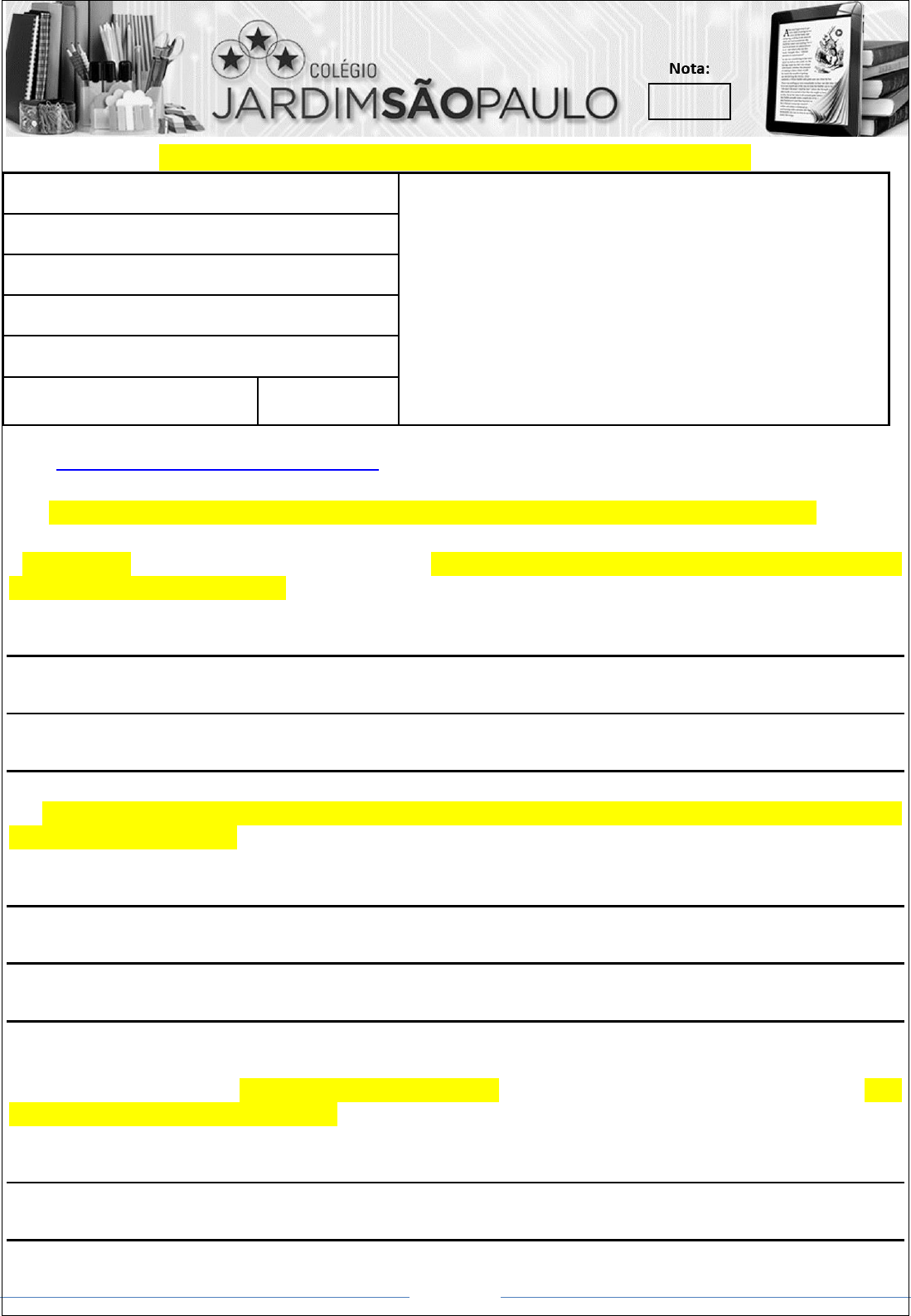 Página 1 PROVA 3º BIMESTRE – ARTE / 2020 (VALOR: 6,0) Link: https://meet.google.com/cer-khdi-sng 1 - Em 1917, Anita Malfatti realizou uma exposição de pinturas em São Paulo na qual apresentou a arte moderna de um modo concreto para os brasileiros. A) Explique, com suas próprias palavras, a relação de Anita e Monteiro Lobato quanto a essa exposição de pinturas. (0,75) B) Qual a posição dos conservadores e a dos modernistas em relação ao Movimento Modernista Brasileiro? (0,75) 2 - Informe abaixo o nome de um artista, apresentado nas nossas aulas, que desenvolveu o Cubismo Analítico. (0,5) Data: 23.09.2020 Para a resolução desta avaliação, siga as orientações abaixo: 1- Não é permitido usar ou manipular calculadoras, aparelhos celulares ou qualquer outro tipo de equipamento eletrônico ou de telecomunicação. Os relógios inteligentes (Smartwatch) não poderão ser usados em hipótese alguma. Tais aparelhos deverão estar desligados e fora do alcance durante a realização das avaliações. 2- Leia com atenção os enunciados das questões propostas. 3 - O entendimento das questões faz parte da avaliação. 4 - Em questões de múltipla escolha, as rasuradas serão anuladas. 5 - As respostas devem ser elaboradas a caneta (azul ou preta). 6 - Revise as respostas antes de entregar a prova. 7- Cuidado com a ortografia. Os erros serão assinalados. Evite-os. Lembre-se de que as rasuras não contribuem para uma boa apresentação. Curso: Médio – Ano/Série: 1º ano Professor: Geder M. Morgado Nome: Unidades Tremembé / Cataguases Nº.: https://meet.google.com/cer-khdi-sng Página 2 3 - Sobre o Cubismo, responda as seguintes questões: A) Informe abaixo, com suas próprias palavras, duas características do Cubismo Sintético: (1,0) B) Assinale a única obra que pertence ao Cubismo Analítico: (0,1) 4 - Com exceção de Anita Malfatti, citada na questão 1, informe abaixo o nome de 3 artistas modernistas que fizeram parte do “Grupo dos Cinco”: (1,0) 5 - Assinale abaixo a única alternativa que contém 2 artistas surrealistas: (0,1) A - ( ) René Magritte e Max Ernst B - ( ) Salvador Dalí e Georges Braque C - ( ) Juan Gris e Joan Miró Obra 1 Obra 2 Obra 3 Página 3 6 - Associe as obras a seguir aos seus artistas conforme legenda abaixo: (0,4) A - Pablo Picasso B - Joan Miró C - Fernand Léger D - René Magritte Obra 1 Obra 2 Obra 4 Obra 3 Página 4 7 - O poeta e escritor André Breton, em 1924, escreve seu primeiro manifesto iniciando o aparecimento do Surrealismo, um dos momentos mais questionados deste período. Quanto ao Surrealismo e suas tendências julgue os itens abaixo: (0,1) I. A associação do manifesto de Breton é a criação do artista ao automatismo psíquico puro. II. As obras surrealistas representam alguns aspectos da realidade, entretanto eles sempre aparecem associados a elementos inexistentes na natureza. III. A obra de arte é o resultado de manifestações racionais e lógicas do consciente. IV. A única preocupação no momento da criação deveria ser com a moral. A - ( ) Apenas o item III está errado B - ( ) Apenas os itens I e II estão corretos C - ( ) Apenas os itens II e IV estão corretos D - ( ) Todos estão errados 8 - Complete as frases assinalando a alternativa correta: (0,1) O Surrealismo foi um movimento da literatura e das artes plásticas que começou na ________, em 1924, sob a liderança do escritor André Breton, que escreveu seu primeiro manifesto, onde ________________ a criação artística ao automatismo psíquico puro. Dessa _____________resulta que as obras criadas _______ devem à razão, à moral ou a própria preocupação estética. O ______________ propiciou o aparecimento do Surrealismo. A – ( ) França – associa – associação – nada – Fauvismo B – ( ) França – associa – associação – nada – Dadaísmo C – ( ) França - desvincula – desvinculação – sempre – Impressionismo 09 - Com base no seu conhecimento sobre Surrealismo, associe as colunas: (0,3) ( A ) Paul Eluard ( ) Literatura - “O Amor Louco” ( B ) André Breton ( ) Cinema - “A Idade do Ouro” ( C ) Luis Buñuel ( ) Literatura - “Capital da Dor” Página 5 10 - No Movimento Modernista Brasileiro, a divisão entre os defensores de uma estética conservadora e os de uma renovadora, prevaleceu por muito tempo e atingiu seu clímax na Semana de Arte Moderna. Antes dos anos 20, que artista expôs sua pintura e, junto com outra artista, colocou a arte moderna de modo concreto para os brasileiros? (0,1) A - ( ) Mário de Andrade B - ( ) Vicente do Rego Monteiro C - ( ) Lasar Segall 11 - Com base na obra abaixo “O Mamoeiro”, responda: Qual movimento artístico, que surgiu em Paris, é inserido na atmosfera brasileira através da pintura moderna de Tarsila e é evidente na obra? (0,1) A - ( ) Cubismo B - ( ) Surrealismo C - ( ) Fauvismo Página 6 12 - Associe os artistas às suas obras: (0,4) A - Anita Malfatti B - Di Cavalcanti C - Vicente do Rego Monteiro D - Lasar Segall Obra 1 Obra 2 Obra 4 Obra 3 Página 7 13 - Qual a origem do Funk? (0,1) A – ( ) É um estilo brasileiro que surgiu na periferia do Rio de Janeiro. B – ( ) É um estilo que surgiu nos Estados Unidos durante a década de 40. C – ( ) É um estilo brasileiro que surgiu nos bairros ricos do Rio de Janeiro, através do contato com ritmos africanos vindos com os escravos. D – ( ) É um estilo que surgiu nos Estados Unidos durante a segunda metade da década de 60. 14 - Marque apenas a única questão que podemos considerar errada: (0,2) A – ( ) James Brown é considerado o "Pai do Funk". B – ( ) Durante a década de 80, o Miami Bass é trazido para o Brasil pelo DJ Marlboro. C – ( ) O funk surge na década de 50, mesma época do surgimento do Rock.