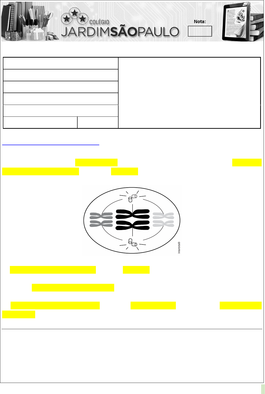 Prova Bimestral de Biologia I – Citologia – 1 PROVA BIMESTRAL DE BIOLOGIA I – BOTÂNICA-3º BIMESTRE Prova Bimestral de Biologia I - Citologia - 4º Bimestre 2020 Data: 19 de novembro de 2020 Para a resolução desta avaliação, siga as orientações abaixo: 1- Não é permitido usar ou manipular calculadoras, aparelhos celulares ou qualquer outro tipo de equipamento eletrônico ou de telecomunicação. Os relógios inteligentes (Smartwatch) não poderão ser usados em hipótese alguma. Tais aparelhos deverão estar desligados e fora do alcance durante a realização das avaliações. 2- Leia com atenção os enunciados das questões propostas. 3- O entendimento das questões faz parte da avaliação. 4- Questões rasuradas serão anuladas. 5- As respostas devem ser elaboradas a caneta (azul ou preta). 6- Revise as respostas antes de entregar a prova. 7- O valor da prova é 3,0. Lembre-se de que as rasuras não contribuem para uma boa apresentação. Curso: Ensino Médio Série: 1ª Professora: Claudia Nome: Unidade Cataguases Nº.: https://meet.google.com/ugd-vzop-fuu (0.6) 01- Observe a célula animal, esquematizada abaixo, com os pares de cromossomos homólogos durante a meiose I. a) Quantas moléculas de DNA existem na célula representada? (0.2) b) Qual o nome da fase representada? (0.2) c) Cite um critério morfológico utilizado para identificar os pares de cromossomos homólogos. (0.2) https://meet.google.com/ugd-vzop-fuu Prova Bimestral de Biologia I – Citologia – 2 (0.5) 02- Analise o gráfico a seguir e responda: a) Qual é o tipo de divisão celular representado no gráfico? (0.2) b) Caso uma célula diploide com 16 cromossomos realize a divisão (apontada no item anterior), qual seria a ploidia e o número cromossômico das células-filhas? (0.3) (0.4) 03- A mitose é um processo de divisão celular em que são formadas duas células com o número de cromossomos igual ao da célula-mãe. Esse processo é subdividido em várias fases. Nessas fases, ocorrem vários eventos: 1- descondensação dos cromossomos e reaparecimento do nucléolo e da carioteca. 2- deslocamento das cromátides-irmãs para polos opostos da célula. 3- migração dos centrossomos e formação das fibras do fuso. 4- cada cromátide-irmã se prende à fibra do fuso em direção a um dos polos da célula. Quais são os nomes das fases em que podemos observar os eventos 1, 2, 3 e 4? (0.5) 04- Um grupo de células de mesmo tecido está em processo de divisão. Algumas fases desse processo estão representadas a seguir. Qual sequência de números indica a ordem em que acontecem as etapas sucessivas no processo da divisão? Prova Bimestral de Biologia I – Citologia – 3 Testes (o valor de cada teste é 0.1) 01- Analise as afirmativas a seguir sobre a estrutura do núcleo celular eucariótico. I. O material genético do núcleo localiza-se em estruturas chamadas cromossomos. II. Os nucléolos são orgânulos delimitados por uma membrana e constituídos de DNA. III. A carioteca ou membrana nuclear é dupla e porosa. IV. O nucleoplasma ou suco nuclear é formado por água, ribossomos e material genético. Estão corretas apenas as afirmativas: a) I e II. b) II e III. c) III e IV. d) I e III. 02- A cromatina, sob o aspecto morfológico, é classificada em eucromatina e heterocromatina; elas se distinguem porque: a) a eucromatina se apresenta condensada durante a mitose e a heterocromatina já se apresenta condensada na intérfase. b) a eucromatina se apresenta condensada na intérfase e a heterocromatina durante a mitose. c) a heterocromatina corresponde a região com genes inativos e, a eucromatina a região com genes ativos. d) as regiões eucromáticas e heterocromáticas permanecem sempre condensadas durante todo o ciclo celular. 03- Assinale a afirmativa incorreta sobre a carioteca. a) É formada por duas membranas lipoproteicas perfuradas com aberturas denominadas poros nucleares. b) O surgimento da membrana nuclear determinou a separação dos processos de transcrição e tradução. c) Os fosfolipídeos das membranas nucleares externa e interna são produzidas no retículo endoplasmático liso. d) Os poros nucleares permitem o livre trânsito de moléculas entre o núcleo e o citoplasma. Prova Bimestral de Biologia I – Citologia – 4 04- A figura abaixo representa o sistema de controle do ciclo celular em células eucarióticas. No segundo ponto de verificação, o evento do ciclo celular que já está concluído é a a) formação do fuso mitótico. b) duplicação dos centrossomos. c) condensação dos cromossomos. d) desintegração do envelope celular. 05- A figura abaixo representa duas células de um mesmo indivíduo em processo de divisão celular. Com base na figura, assinale a alternativa correta. Prova Bimestral de Biologia I – Citologia – 5 a) A célula A representa a anáfase mitótica, e a célula B, a anáfase II da meiose. b) A célula A representa a anáfase I, e a célula B, a anáfase II, ambas da meiose. c) Nessa espécie, o número diploide de cromossomos é oito. d) O número de cromossomos no gameta masculino dessa espécie é quatro. 06- A figura abaixo representa uma célula diploide e as células resultantes de sua divisão. Nesse processo, a) houve um único período de síntese de DNA, seguido de uma única divisão celular. b) houve um único período de síntese de DNA, seguido de duas divisões celulares. c) houve dois períodos de síntese de DNA, seguidos de duas divisões celulares. d) não pode ter ocorrido permutação cromossômica. 07- Considere os eventos abaixo, que podem ocorrer na mitose ou na meiose: I. Emparelhamento dos cromossomos homólogos duplicados. II. Alinhamento dos cromossomos no plano equatorial da célula. III. Permutação de segmentos entre cromossomos homólogos. IV. Divisão dos centrômeros resultando na separação das cromátides irmãs. No processo de multiplicação celular para reparação de tecidos, os eventos relacion
