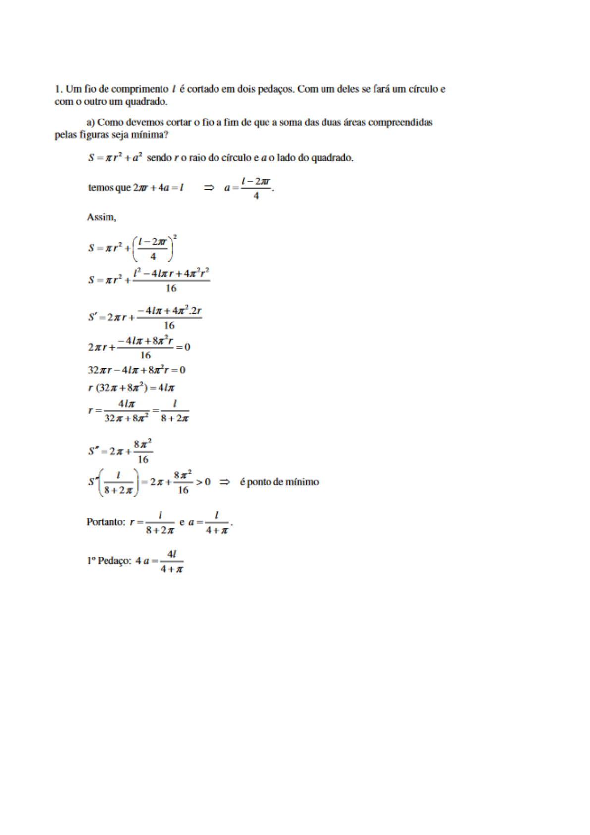 b) Como devemos cortar o fio a fim de que a soma das áreas compreendidas seja