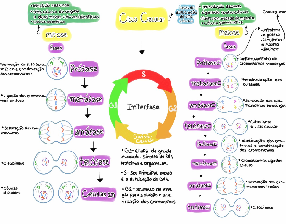 SP1- UC10 Fernanda Silveira Vieira RA: 25172 T4-A 1 – Entenda o ciclo celular (fases, como ocorre, desenvolvimento, sinalização, proteínas de reparo, regulação). O ciclo celular pode ser considerado como um o ciclo de vida de uma célula. Isto é, é a série de estágios de crescimento e desenvolvimento que uma célula passa entre seu "nascimento" - formação pela divisão de uma célula mãe - e reprodução - divisão para gerar duas células filhas. Estágios do ciclo celular Para se dividir, uma célula deve completar várias tarefas importantes: ela precisa crescer, copiar seu material genético (DNA), e dividir-se fisicamente em duas células-filhas. As células realizam estas tarefas em uma série de etapas previsíveis e organizadas que constituem o ciclo celular. O ciclo celular é um ciclo e não um caminho linear, porque ao final de cada um, as duas células-filhas podem começar novamente mesmo processo, a partir do início. Em células eucarióticas, ou células com núcleo, os estágios do ciclo celular são divididos em duas fases principais: interfase e a fase mitótica (M). · Durante a interfase, a célula cresce e faz uma cópia de seu DNA. · Durante a fase mitótica (M), a célula separa seu DNA em dois conjuntos e divide seu citoplasma, formando duas novas células. Interfase A preparação para a divisão acontece em três etapas: · Fase G: Durante a fase, também chamada de primeira fase de intervalo, a célula cresce e torna-se fisicamente maior, cópia organelas, e fabrica os componentes moleculares que precisará nas etapas posteriores. · Fase S: Na fase S, a célula sintetiza uma cópia completa do DNA em seu núcleo. Ela também duplica uma estrutura organizadora de microtúbulos chamada de centrossomo. Os centrossomos ajudam a separar o DNA durante a fase M. · Fase G: Durante a segunda fase de intervalo, ou fase G. A célula cresce mais, produz proteínas e organelas, e começa a reorganizar seu conteúdo em preparação para a mitose. A fase G_2 termina com o início da mitose. As fases G juntas são chamadas de interfase. O prefixo inter significa entre, refletindo que a interfase ocorre entre uma fase mitótica (M) e a próxima. Imagem do ciclo celular. A interfase é composta da fase G1 (crescimento da célula), seguida pela fase S (síntese de DNA), seguida pela fase G2 (crescimento da célula). Ao final da interfase, vem a fase mitótica, que é composta de mitose e citocinese e leva à formação de duas células-filhas. A mitose precede a citocinese, apesar de que os dois processos normalmente se sobrepõem um pouco. Fase M Durante a fase mitótica (M), a célula divide seu DNA duplicado e o citoplasma para formar duas novas células. A fase M envolve dois processos distintos relacionados à divisão: mitose e citocineses. Na mitose, o DNA nuclear da célula se condensa em cromossomos visíveis e é separado pelo fuso mitótico, uma estrutura especializada formada por microtúbulos. A mitose acontece em quatro etapas: prófase (algumas vezes dividida em prófase inicial e prometa fase), metáfase, anáfase e telófase. Você pode aprender mais sobre estes estágios Na citocinese, o citoplasma da célula é dividido em dois, formando duas novas células. A citocinese normalmente começa assim que a mitose termina, com alguma sobreposição. É importante notar que a citocinese ocorre de formas diferentes em células animais e vegetais. Citocinese em células animais e vegetais. Em uma célula animal, um anel contrátil de fibras de citoesqueleto se forma no meio da célula e se contrai, produzindo uma invaginação chamada sulco de clivagem. Ao final, o anel contrátil divide a célula-mãe, produzindo duas células-filhas. Em uma célula vegetal, vesículas oriundas do complexo de Golgi se movem para o meio da célula, onde elas se fundem para formar uma estrutura chamada placa celular. A placa celular se expande para fora e se conecta com as paredes laterais da célula, criando uma nova parede celular que divide a célula-mãe para formar duas células-filhas. · Em animais, a divisão da célula ocorre quando um conjunto de fibras cito esqueléticas chamado anel contrátil contrai-se em direção ao interior da célula e parte a célula em duas, um processo chamado de citocinese contrátil. A endentação produzida à medida que o anel se contrai para o interior da célula é chamada de sulco de clivagem. Células animais podem ser clivadas em duas, por compressão, porque são relativamente macias e moles. · Células de plantas são muito mais duras que células animais; elas são cercadas por uma parede celular rígida e têm uma pressão interna alta. Por isto, as células de plantas se dividem em duas através da construção de uma nova estrutura no meio da célula. Esta estrutura, conhecida como lamela média, é feita de membrana plasmática e componentes da parede celular disponíveis em vesículas, e ela divide a célula em duas. Saída do ciclo celular e G O que acontece às duas células-filhas produzidas numa rodada do ciclo celular? Isto depende de que tipo de células elas são. Alguns tipos de células dividem-se rapidamente, e nestes casos, as células-filhas podem entrar imediatamente em um novo ciclo de divisão celular. Por exemplo, muitos tipos de células em um embrião jovem dividem-se rapidamente, como as células em um tumor. Outros tipos de células dividem-se lentamente ou não se dividem. Estas células podem deixar a fase G e entrar em um estado de repouso chamado Fase G. Em G, a célula não está ativamente se preparando para dividir, está apenas desempenhando suas funções. Por exemplo, pode conduzir sinais como um neurônio (como aquele no desenho abaixo) ou armazenar carboidratos como uma célula do fígado. G é um estado permanente para algumas células, enquanto outras podem reiniciar a divisão caso recebam os sinais corretos. Imagem de um neurônio com uma estrutura ramificada complexa; este tipo