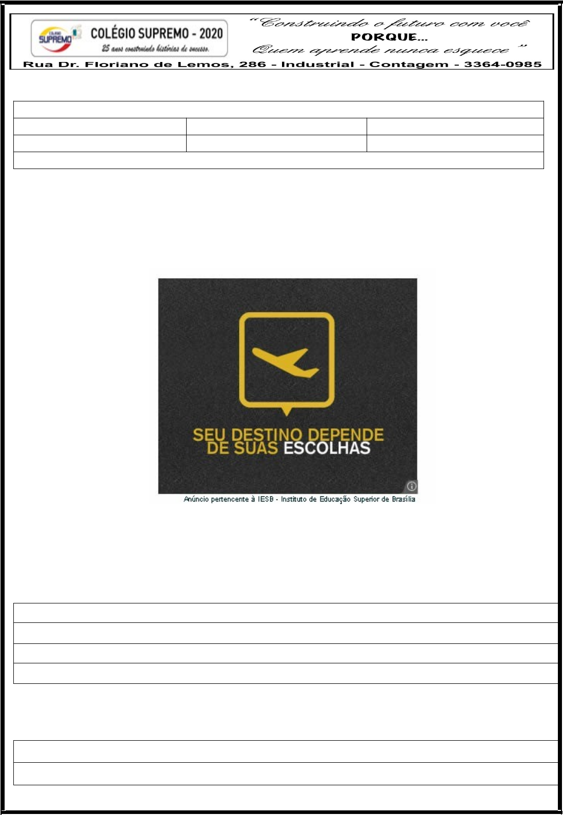 Atividade Complementar – 1° Bimestre Aluno(a) 7º ano / 9 Prof. Sócrates Penna Data: Nota: Observações: Atenção: - Atividade justifique e exemplifique quando necessário. - Inicie as frases com letra maiúscula. - As questões abertas deverão ser argumentadas - Passe o texto à caneta azul ou preta. - Releia TODO texto, a fim de checar as incoerências e erros ortográficos. Questão 01 A ambiguidade representa, digamos assim, um fator de não textualidade, pois compromete a clareza e a precisão do discurso. Contudo, em se tratando dos anúncios ublicitários, nos quais prevalece a linguagem figurada, ela é feita de forma intencional, portanto, bem-vinda. Acerca do anúncio publicitário expresso acima, teça um comentário fazendo referência aos dizeres nele presentes: R. Questão 02 Dê exemplos de “textos” em que há o predomínio da linguagem figurada/conotativa. R. Questão 03 Cite exemplos de “textos” em que há o predomínio da linguagem denotativa. R. Questão 04 Analisando as falas das personagens, assinale a alternativa que contenha as expressões utilizadas em seu sentido conotativo: a) “Você vai comer asfalto” e “estou morto”. b) “No quinto período, seu babaca” e “você vai comer asfalto”. c) “Ameaça terrorista” e “aula de educação física”. d) “Ameaça terrorista” e “estou morto”. Alberto Caeiro VII - Da minha aldeia vejo quanto da terra se pode ver do Universo… Da minha aldeia vejo quanto da terra se pode ver do Universo... Por isso a minha aldeia é tão grande como outra terra qualquer, Porque eu sou do tamanho do que vejo E não do tamanho da minha altura... Nas cidades a vida é mais pequena Que aqui na minha casa no cimo deste outeiro. Na cidade as grandes casas fecham a vista à chave, Escondem o horizonte, empurram o nosso olhar para longe de todo o céu, Tornam-nos pequenos porque nos tiram o que os nossos olhos nos podem dar, E tornam-nos pobres porque a nossa única riqueza é ver. s.d.“O Guardador de Rebanhos”. In Poemas de Alberto Caeiro. Fernando Pessoa. (Nota explicativa e notas de João Gaspar Simões e Luiz de Montalvor.) Lisboa: Ática, 1946 (10ª ed. 1993). Questão 05 Explique a oposição estabelecida entre aldeia e a cidade. R. Questão 06 Quantos versos e quantas estrofes há no poema “Da minha aldeia vejo quanto da terra se pode ver do Universo”? R. Questão 07 Relacione os conceitos da segunda coluna de acordo com as nomenclaturas da primeira: ( ) Está representado em cada linha separada de um poema. Denomina-se como linhas poéticas... ( ) Semelhança de sons no final das palavras... ( ) Denomina-se como conjunto de palavras intercaladas de forma coordenada que se organizam em um poema... ( ) Obra construída em versos, explora a sonoridade, o ritmo e os mais diversos significados e sentidos... ( ) É dado pela alternância de sílabas átonas e tônicas... ( ) Atividade de produção artística da expressão de emoções, paisagens, sons e objetos. Possui definição mais ampla... ( ) Voz particular da lírica manifestando o mundo, os sentimentos e os estados de espírito do poeta... 1) Poema. 2) Poesia. 3) Eu lírico. 4) Versos. 5) Estrofes. 6) Rima. 7) Ritmo. Questão 08 Defina com suas palavras, a diferença entre “poesia” e “poema”. R. Leia o poema. Livros e flores Teus olhos são meus livros. Que livro há aí melhor, Em que melhor se leia A página do amor? Flores me são teus lábios. Onde há mais bela flor, Em que melhor se beba O bálsamo do amor? Machado de Assis Questão 09 É possível dizer que a comparação feita entre os livros e a pessoa amada é positiva? Justifique sua resposta. R. Questão 10 Após compreender os conceitos que compõem as obras poéticas, desenvolva um pequeno poema em que você exponha seus sentimentos sobre algo que lhe agrada muito. Pode ser um lugar, um objeto ou uma pessoa. Seu poema deve expressar seus sentimentos e estar dividido em pelo menos duas estrofes. Boa sorte!