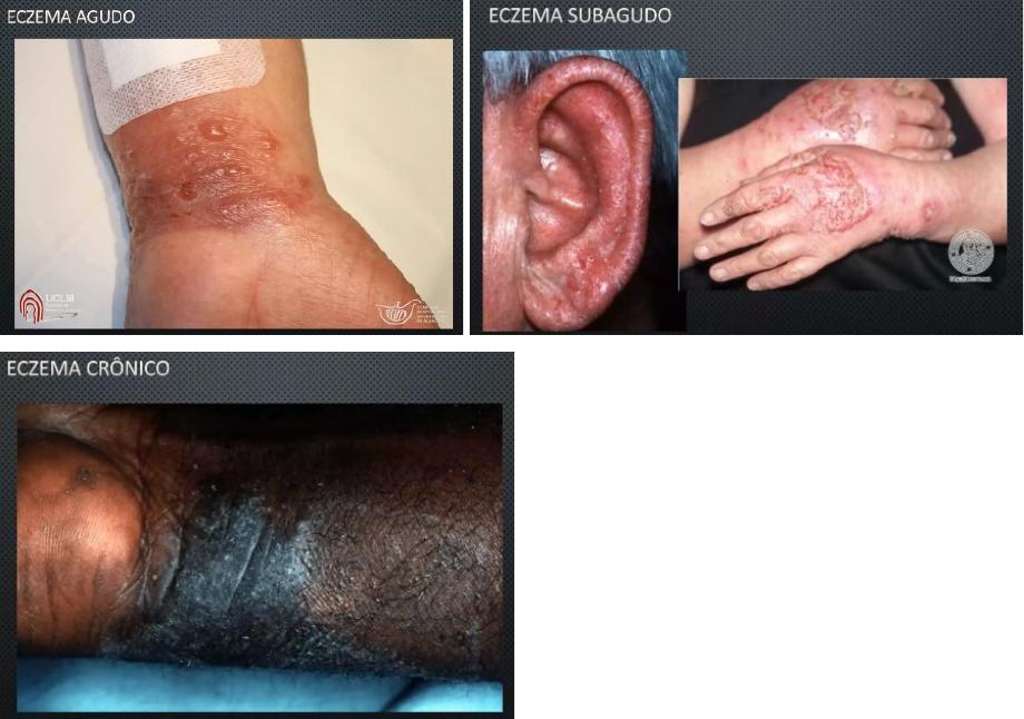 DERMATITES E ECZEMA Dermatites = termo geral usado para vários tipos de inflamação cutânea Eczema: sinônimo de dermatite · deriva do grego ekzein (zein: ferver) - pode ser entendido como Estado de Ebulição da pele. · pode ser classificado: · quanto à etiologia · quanto ao tempo de evolução: · agudo: eritema, vesículas e bolhas · subagudo: eritema e descamação · crônico: liquenificação Tipos de Dermatite: · Dermatite Atópica · dermatite de Contato · dermatite seborreica · eczema numular · dermatite de estase · eczema disidrótico obs.: Alergia não é um diagnóstico! Pode ser: urticária, dc alérgica, dermatite atópica, farmacodermia, reação adversa à medicação. Fisiopatologia diferente - não ocorre sensibilização DERMATITE DE CONTATO · Doença inflamatória comum · Prurido, eritema, vesículas na pele (pode apresentar descamação e liquenificação) · motivo de milhões de visitas ao médico anualmente · dermatose de etiologia exógena · causada por agentes externos · contato com a pele → reação inflamatória · Classificação: · DC por irritante primário · DC alérgica · DC fototóxica · DC fotoalérgica · Reação localizada, simétrica · pode ser: aguda, subaguda ou crônica · Alérgica: envolve sistema imune, com exposição prévia, pode ser retardada. Resposta evocada. · por irritante primário: reação imediata, sem exposição prévia. Quebra a barreira da pele. DC por irritante primário · mais frequente · ocorre em exposição única ou repetida a agentes agressores · mecanismo de ação: não imune · substância causa dano tecidual direto · solventes, detergentes, ácidos · tipos de irritante primário: · absoluto: ação cáustica de substâncias em contato com a pele. Capacidade de dano tecidual - sem susceptibilidade individual. Sintomas abruptos. · Absoluto com Efeito retardado: substâncias químicas que produzem irritação aguda. Processo inflamatório - visível após período de 8-24h. · Relativo: forma mais frequente de DCIP. Surge após dias, semanas, meses ou anos de exposição ao agente causador. Depende das características da substância - tempo de exposição, periodicidade do contato com o agente irritante. Frequência de exposição > capacidade de recuperação da pele · Após o surgimento das lesões cutâneas, qualquer substância pode manter o quadro. Ex.: donas de casa - uso constante de água, sabões, detergentes favorecem a irritação. · = 60% das dermatoses ocupacionais · Fatores Predisponentes: · Atopia (alterações na barreira da pele) · idade: crianças < 8 anos (imaturidade da barreira) e idosos (pele fina - menos colágeno) · sexo feminino (maior frequencia ← maior exposição a contato e umidade) · fatores externos: · característica relativa a exposição da pele - tamanho da molécula, polaridade, solubilidade · característica relativa à exposição da pele ao agente - tempo de exposição, contato rápido ou sob oclusão. · mecanismo: · dano inicial → perda da integridade da epiderme · queratinócitos lesados → produzem citocinas → inicia o processo inflamatório · citocinas → amplificam o processo → mais recrutamento de mediadores e cels inflamatórias · interleucinas mais aumentadas: TNF, IL 6 e IL 2 DC Alérgica · Classificada de acordo com a Reação de Gel e Coombs · tipo 4 - principal mecanismo · DCA = Reação imunológica do tipo IV - mediada por céls (hipersensibilidade tardia) · resultante da ativação de cels T alérgeno específicas · substância entra em contato com a pele → reação imune · 3 etapas: · fase de indução ou imunização - via aferente · fase de elicitação - via eferente · fase de resolução · Via Aferente: · subst entra em contato com a pele = fator desencadeante (Hapteno = Ag incompleto) · hapteno → + prot da pele ⇒ Antígeno → + prot da memb plasmática da cel de Langerhans → carrier · para sensibilização: hapteno deve permanecer 18-24h em contato com a pele. · Via aferente leva de 4-5 dias (no mínimo) para se completar · São necessários 14-21 dias para que as cels efetoras voltem a circular na pele. · Via Eferente · indivíduo previamente sensibilizado entra em contato com o Ag · LT CD4 não conseguem inibir a reação contra o Ag · LT CD8 (previamente formados) → reação da DC. · Estimula queratinócitos e outros Linf T → IL 2, IFN y e TNF · em 24-48h a reação inflamatória se desenvolve DC Fototóxica · mais frequente que a fotoalérgica · indivíduo deve se expor a qtdes do agente causador e de luz suficiente · Mecanismo é similar ao da DCIP (quebra de barreira) · diferença - subst se torna irritante quando sua estrutura química é modificada pelo sol · ex.: Fitofotodermatose (queimadura de limão) · luz → energia → absorvida por cromóforo (ex.: DNA, melanina) → forma radicais livres → início do processo de dano celular. DC Fotoalérgica · Mecanismo similar ao da DCA · subst desencadeadora se torna um hapteno após ser modificada pela luz solar · lesões predominam em áreas fotoexpostas · ex.: DC desencadeada por antihistamínicos de uso tópico, perfumes, AINH, antimicótico tópico. Quadro clínico · Formas: · eritematosa · eritemato- vesiculosa · eritemato- vesico- secretante · eritemato - secretante - infiltrativa - liquenificada · Prurido é um sintoma constante · delimitação e localização regional sugerem o agente causador · locais mais frequentes: mãos (ocupacional), face (cosméticos), pescoço, pés (produtos usados para calçados - látex, couro, talco), tronco · na DCA e DCFA - extensão das lesões além do local de contato = fenômeno de auto sensibilização (memória → lesões em locais que não tiveram contato com o agente) Diagnóstico · clínico: história, lesões cutâneas · teste de contato: confirmatório · elucidar a etiologia · evocar via eferente da DCA · se negativo: suspeitar de DCIP · 