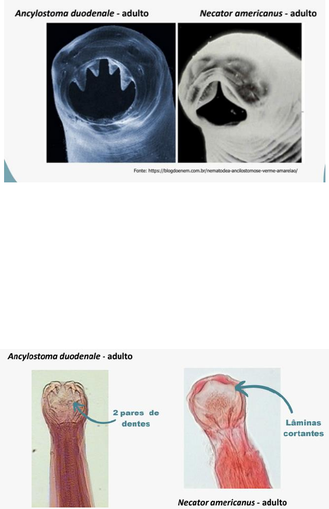 Nematódeos Intestinais Ancilostomíase Acilostomíase tem como agente: • Ancylostoma duodenale – Adulto • Necator Americanus – Adulto Diferença entre Ancylostoma Duodenale e Necator Americanus O Ancylostoma Duodenale - Adulto: • Possui dois pares de dentes (2 dentes de cada lado) • Corpo longo de forma cilíndrica Necator Americanus - Adulto: • Não possui dentes possui lâminas cortantes (Banguela) • Corpo longo de forma cilíndrica Outros Agentes causadores de Ancilostomíase Ancylostoma Caninum Adulto: • Possui 3 Pares de Dentes (3 de cada lado) • Corpo longo de forma cilíndrica Ancylostoma Braziliense – Adulto: • Possui apenas 1 Par de dente (1 de cada lado) • Corpo longo de forma cilíndrica Ovo de Ancilostomíase Ovo de Ancylostomatidae que é da família de Ancilostomíase, não vai se diferenciar por espécie O ovo de Ancylosmatidae possui uma casca lisa e transparente em volta, já no meio se concentra as Células Embrionárias Larva Larva Filarióide: Também da família que não vai ser diferenciada entre cada espécie é só da família, o nome Filarióide se dá por conta do esôfago Filarioide que ela vai ter, possui uma Bainha em volta que é bem hialina Larva Rabditóide: Possui esse nome por conta do Esofago Rabiditóide, possui uma cauda pontiaguda diferente da Filarióide que vem mais gordinha e se afina Imagem da Esquerda é a cauda da Larva Rabditóide enquanto na direita é a cauda da Larva Filarióide Estrongiloidíase Na imagem é uma Fêmea Partenogenética Partenogenética: Partenogenética consiste na produção de filhotes sem que haja fecundação do óvulo (Fonte Google) Extremidade Posterior Afilada (Final) e Anterior Arredondada (Cabeça) possui corpo cilíndrico 1,7 a 2,5 mm (Adulto), não há machos durante sua vida parasitaria só as fêmeas Partenogenética, produzindo assim em média 30 há 40 ovos por dia, podendo viver até 5 anos. Strongyloides Stercoralis: Larva Rabditóide Por possuir Esôfago Rabiditóide (Sendo melhor observado nessa imagem) e um primórdio genital proeminente, podendo medir de 0,2 há 0,3mm de comprimento e a cauda pontiaguda Strongyloides Stercoralis: Larva Filarióide Possui esôfago Filarióide, uma cauda que afina gradualmente conhecida como cauda entalhada por conta da ponta dela, é uma larva infectante desse parasita Enterobíase A Enterobíase tem como o agente o Enterobius Vermicularis (Na imagem é possível visualizar a diferença entre a fêmea e o macho, A Fêmea é maior que o Macho) A Cauda do macho normalmente é recurvada ventralmente para facilitar na hora do acasalamento, possui esse nome por conta do Esôfago Oxiuriforme a Fêmea é bem maior que o macho possui uma cauda longa e pontiaguda (ficando reta diferente do macho) na imagem é possível ver os ovos que ela liberou podendo analisar a quantidade exorbitante de ovos liberados deixando assim ela ser conhecida como Saco de Ovos Detalhe para diferenciar o Enterobius é que ele possui “Asas Cefálicas” (Podendo ser observado nas outras imagens como na cabeça do macho na imagem anterior) Ovo do Enterobius Possui um formato de “D” facilitando a diferenciação, ele é bem liso e translucido (Em volta bem transparente) possui uma dupla camada