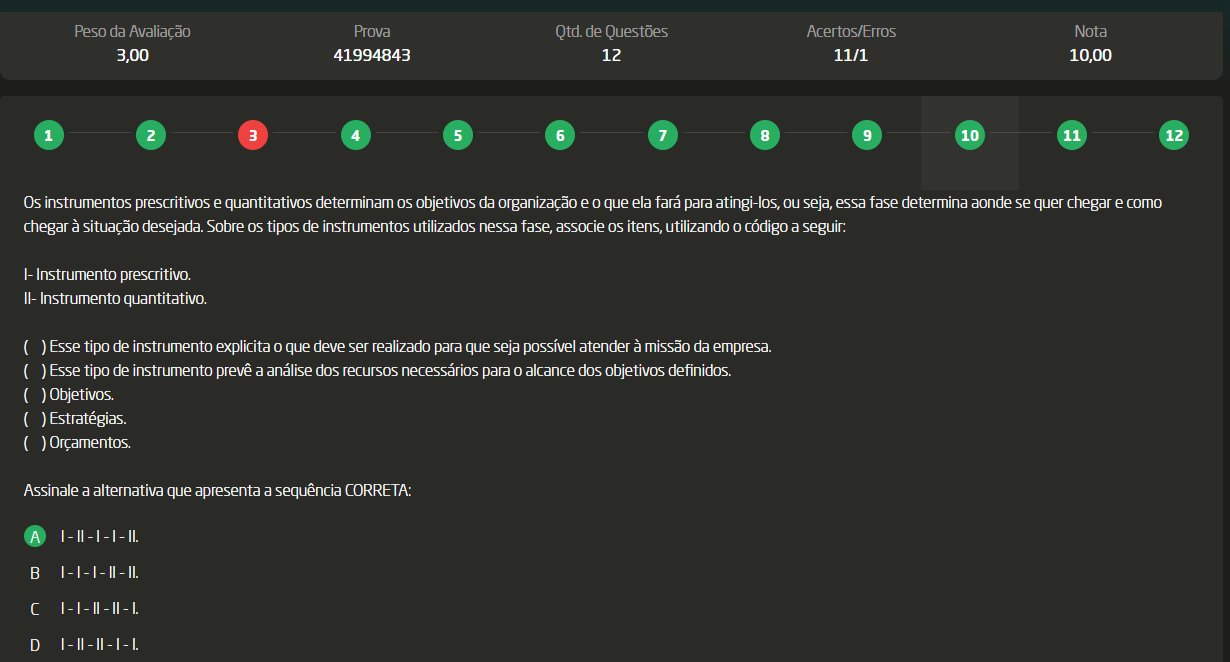 Os instrumentos prescritivos e quantitativos determinam os objetivos da organização e o que ela fará para atingi-los, ou seja, essa fase determina aonde se quer chegar e como chegar à situação desejada. Sobre os tipos de instrumentos utilizados nessa fase, associe os itens, utilizando o código a seguir: Instrumento prescritivo. II- Instrumento quantitativo. Assinale a alternativa que apresenta a sequência CORRETA: ( ) Esse tipo de instrumento explicita o que deve ser realizado para que seja possível atender à missão da empresa. ( ) Esse tipo de instrumento prevê a análise dos recursos necessários para o alcance dos objetivos definidos. ( ) Objetivos. ( ) Estratégias. ( ) Orçamentos. A B C D