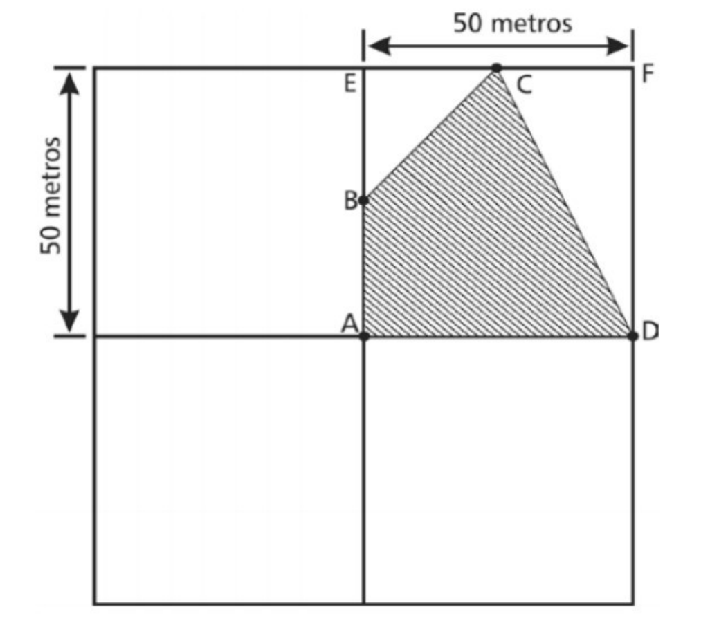 Área de Figuras Planas - Exercícios A área de figuras planas representa a medida da extensão que a figura ocupa no plano. Como figuras planas podemos citar o triângulo, o retângulo, o losango, o trapézio, o círculo, entre outras. Aproveite as questões abaixo para verificar seus conhecimentos sobre esse importante assunto da geometria. Questões de Concursos Resolvidas Questão 1 (Cefet/MG - 2016) A área quadrada de um sítio deve ser dividida em quatro partes iguais, também quadradas, e, em uma delas, deverá ser mantida uma reserva de mata nativa (área hachurada), conforme mostra a figura a seguir. Sabendo-se que B é o ponto médio do segmento AE e C é o ponto médio do segmento EF, a área hachurada, em m2, mede a) 625,0. b) 925,5. c) 1562,5. d) 2500,0. Resposta: Alternativa correta: c) 1562,5. Observando a figura, notamos que a área hachurada corresponde à área do quadrado de lado 50 m menos a área dos triângulos BEC e CFD. A medida do lado BE, do triângulo BEC, é igual a 25 m, pois o ponto B divide o lado em dois segmentos congruentes (ponto médio do segmento). O mesmo acontece com os lados EC e CF, ou seja, suas medidas também são iguais a 25 m, pois o ponto C é o ponto médio do segmento EF. Assim, podemos calcular a área dos triângulos BEC e CFD. Considerando um dois lados conhecidos como a base, o outro lado será igual a altura, pois os triângulos são retângulos. Calculando a área do quadrado e dos triângulos BEC e CFD, temos: Portanto, a área hachurada, em m2, mede 1562,5. Questão 2 (Cefet/RJ - 2017) Um quadrado de lado x e um triângulo equilátero de lado y possuem áreas de mesma medida. Assim, pode-se afirmar que a razão x/y é igual a: Resposta: Alternativa correta: . A informação dada no problema é que as áreas são iguais, ou seja: A área do triângulo é encontrada multiplicando a medida da base pela medida da altura e dividindo o resultado por 2. Sendo o triângulo equilátero e o lado igual a y, o valor da sua altura é dado por: Portanto, pode-se afirmar que a razão x/y é igual a . Questão 3 (IFSP - 2016) Uma praça pública em forma de circunferência tem raio de 18 metros. Diante do exposto, assinale a alternativa que apresenta sua área. a) 1.017,36 m2 b) 1.254,98 m2 c) 1.589,77 m2 d) 1.698,44 m2 e) 1.710,34 m2 Resposta: Alternativa correta: a) 1 017, 36 m2. Para encontrar a área da praça, devemos utilizar a fórmula da área do círculo: A = π.R2 Substituindo o valor do raio e considerando π = 3,14, encontramos: A = 3,14 . 182 = 3,14 . 324 = 1 017, 36 m2 Portanto, a área da praça é de 1 017, 36 m2. Questão 4 (IFRS - 2016) Um retângulo tem dimensões x e y, que são expressas pelas equações x2 = 12 e (y - 1)2 = 3. O perímetro e a área deste retângulo são, respectivamente a) 6√3 + 2 e 2 + 6√3 b) 6√3 e 1 + 2√3 c) 6√3 + 2 e 12 d) 6 e 2√3 e) 6√3 + 2 e 2√3 + 6 Resposta: Alternativa correta: e) 6√3 + 2 e 2√3 + 6. Primeiro vamos resolver as equações, para encontrar os valores de x e y: x2= 12 ⇒ x = √12 = √4.3 = 2√3 (y - 1) 2= 3 ⇒ y = √3 + 1 O perímetro do retângulo será igual a soma de todos os lados: P = 2.2√3 + 2. (√3 + 1) = 4√3 + 2√3 + 2 = 6√3 + 2 Para encontrar a área, basta multiplicar x.y: A = 2√3 . (√3 + 1) = 2√3 + 6 Portanto, o perímetro e a área do retângulo são, respectivamente, 6√3 + 2 e 2√3 + 6. Questão 5 (Aprendiz de Marinheiro - 2016) Analise a figura a seguir: Sabendo que EP é o raio da semicircunferência de centro em E, como mostra a figura acima, determine o valor da área mais escura e assinale a opção correta. Dado: número π=3 a) 10 cm2 b) 12 cm2 c) 18 cm2 d) 10 cm2 e) 24 cm2 Resposta: Alternativa correta: b) 12 cm2. A área mais escura é encontrada somando-se a área da semicircunferência com a área do triângulo ABD. Vamos começar calculando a área do triângulo, para isso, note que o triângulo é retângulo. Vamos chamar o lado AD de x e calcular a sua medida através do teorema de Pitágoras, conforme indicado abaixo: 52= x2 + 32 x2 = 25 - 9 x = √16 x = 4 Conhecendo a medida do lado AD, podemos calcular a área do triângulo: Precisamos ainda, calcular a área da semicircunferência. Note que o seu raio será igual a metade da medida do lado AD, assim, r = 2 cm. A área da semicircunferência será igual a: A área mais escura será encontrada fazendo-se: AT = 6 + 6 = 12 cm2 Portanto, o valor da área mais escura é 12 cm2. Questão 6 (Enem - 2016) Um senhor, pai de dois filhos, deseja comprar dois terrenos, com áreas de mesma medida, um para cada filho. Um dos terrenos visitados já está demarcado e, embora não tenha um formato convencional (como se observa na Figura B), agradou ao filho mais velho e, por isso, foi comprado. O filho mais novo possui um projeto arquitetônico de uma casa que quer construir, mas, para isso, precisa de um terreno na forma retangular (como mostrado na Figura A) cujo comprimento seja 7 m maior do que a largura. Para satisfazer o filho mais novo, esse senhor precisa encontrar um terreno retangular cujas medidas, em metro, do comprimento e da largura sejam iguais, respectivamente, a a) 7,5 e 14,5 b) 9,0 e 16,0 c) 9,3 e 16,3 d) 10,0 e 17,0 e) 13,5 e 20,5 Resposta: Alternativa correta: b) 9,0 e 16,0. Como a área da figura A é igual a área da figura B, vamos primeiro calcular esta área. Para isso, vamos dividir a figura B, conforme imagem abaixo: Note que ao dividir a figura, temos dois triângulos retângulos. Sendo assim, a área da figura B será igual a soma das áreas desse triângulos. Calculando essas áreas, temos: Sendo a figura A um retângulo, sua área é encontrada fazendo-se: AA = x . (x + 7)= x2 + 7x Igualando a área da figura A com o valor encontrado para a área da figura B, encontramos: x2 + 7x = 144 x2 + 7x - 144 = 0 Vamos resolver a equação do 2º grau, usando a fórmula de Bhaskara: Como uma medida não pode ser negativa, vamos considerar apenas o valor igual a