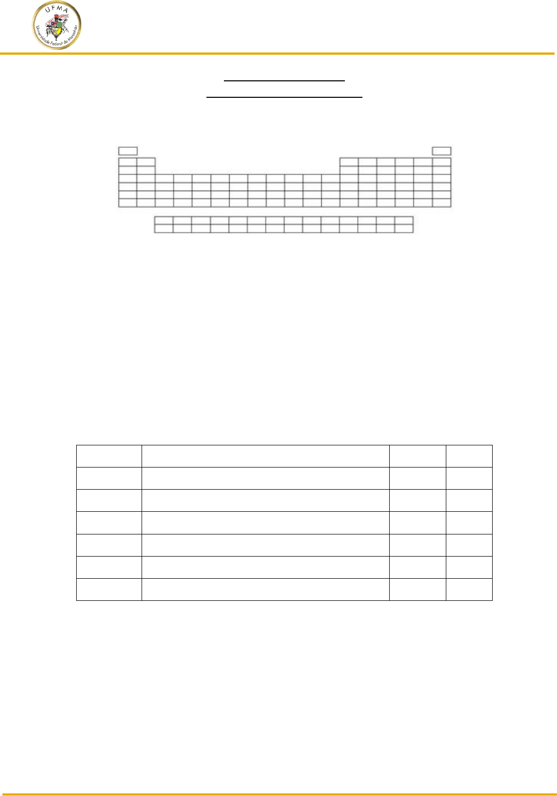 Universidade Federal do Maranhão Bacharelado Interdisciplinar em Ciência e Tecnologia Disciplina CCCT0004: Química Geral e Inorgânica Exercícios de Fixação – Propriedades Periódicas - 1. A figura a seguir é uma representação da classificação periódica dos elementos sem a indicação dos respectivos elementos. Supondo que cada linha seja enumerada de 1 a 7 e que cada coluna de 1 a 18 e seja dada a distribuição eletrônica dos seguintes elementos: Observação: Os símbolos aqui indicados não representam os símbolos verdadeiros. a. W – 1s2 2s2 2p6 3s2 3p3 b. Y – 1s2 2s2 2p6 3s2 3p6 4s2 c. Z – 1s2 2s2 2p6 3s2 3p6 4s2 3d10 4p6 d. T – 1s2 2s2 2p6 3s2 3p6 4s2 3d10 4p6 5s1 Identifique na Tabela Periódica a posição de cada um desses elementos. 2. Com base nas informações constantes do quadro abaixo, analise a configuração eletrônica e identifique a posição (coluna e linha) do elemento na Tabela Periódica. Elemento Configuração eletrônica Período Grupo A 1s2 2s2 2p6 3s2 3p6 4s2 3d10 4p6 B 1s2 2s2 2p6 3s2 3p6 4s2 3d8 C 1s²2s²2p6 3s²3p64s²3d104p3 D 1s2 2s2 2p6 3s2 3p6 4s2 3d10 4p65s24d6 E 1s22s22p63s23p64s2 3d104p65s24d105p66s24f6 F 1s2 2s2 2p6 3s2 3p6 4s2 3d10 4p6 5s1 3. Suponha que um elemento químico esteja localizado na coluna 15 da Tabela Periódica e no 3º período. Sem consultá-la, responda: a. Qual é a configuração eletrônica desse elemento? b. Qual é o seu número atômico? c. Qual será o número atômico do elemento que estiver localizado no mesmo período e no grupo seguinte (16) a esse elemento? 4. Para os elementos abaixo, responda qual o elétron da camada de valência sente maior carga nuclear efetiva? Justifique sua resposta através dos cálculos. Universidade Federal do Maranhão Bacharelado Interdisciplinar em Ciência e Tecnologia Disciplina CCCT0004: Química Geral e Inorgânica (a) Os elétrons de valência do Mg , do Al ou do S. 5. Seguindo as regras de Slater calcule a carga nuclear efetiva para o elétron do Mn que se encontra em: a. 4s b. 3d c. 3p d. 1s 6. Com base nas tendências periódicas, escolha o maior átomo em cada um dos pares a seguir. Explique sua escolha. a. N ou F b. C ou Ge c. N ou Al d. Al ou Ge 7. Escolha o maior átomo ou o maior íon em cada um dos pares a seguir: a. S ou S2─ b. Ca ou Ca2+ c. Br─ ou Kr d. F ou B 8. Com base nas tendências periódicas determine (se possível) o elemento em cada um dos pares vistos a seguir que tem a primeira energia de ionização maior: a. Al ou S b. As ou Sb c. N ou Si d. O ou Cl 9. Disponha os seguintes elementos em ordem crescente de eletronegatividade: Cl, Sn, Si. 10. Com base nas tendências periódicas, escolha o elemento mais metálico em cada um dos grupos: a. Sn ou Te b. P ou Sb c. Ge ou In d. S ou Br.