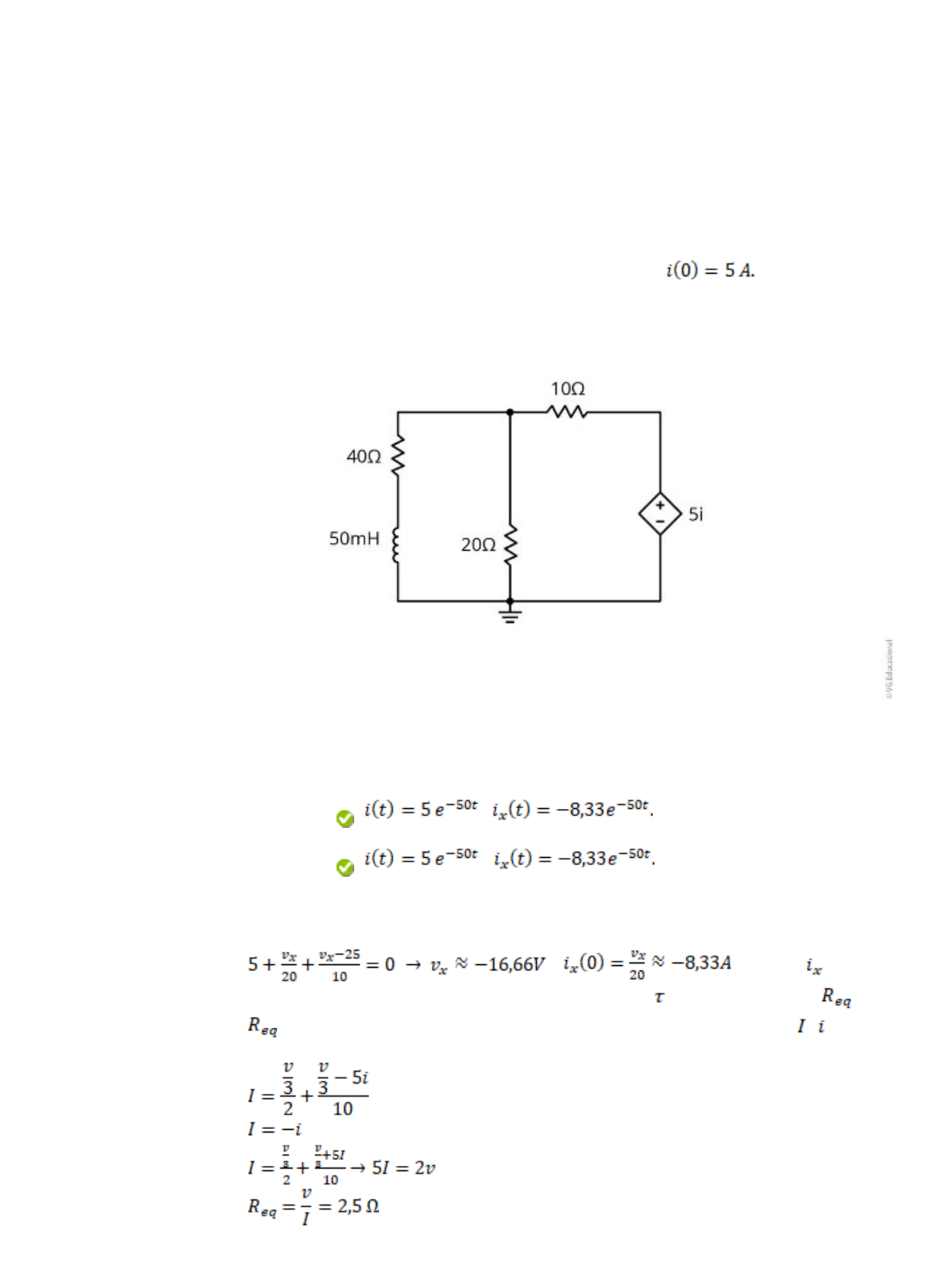 Pergunta 1 Resposta Selecionada: Resposta Correta: Comentário da resposta: A análise de circuitos RL é realizada aplicando-se as leis de Kirchhoff. A aplicação das leis de Kirchhoff em circuitos puramente resistivos resulta em equações algébricas; já a aplicação dessas leis a circuitos RL produz equações diferenciais. ALEXANDER, C. K.; SADIKU, M. N. O. Fundamentos de circuitos elétricos. 5. ed. São Paulo: Bookman, 2013. A partir dessas informações e do conteúdo estudado a respeito de Circuito RL, assinale a alternativa correta, que apresenta os valores das correntes no indutor e no resistor de 20Ω para t>0 no circuito abaixo. (Considere ) Figura - Circuito RL Fonte: Elaborada pelo autor. , , Resposta correta. A alternativa está correta, pois no circuito equivalente no t=0, o indutor pode ser substituído com uma fonte de corrente de 5A. Aplicando-se a lei da corrente de Kirchhoff para a malha com resistores de 20 ohms e 40 ohms, tem-se: , , em que é a corrente sobre o resistor de 20 ohms. Para se calcular , é preciso calcular a . A é a resistência vista pelos terminais do indutor. Considerando-se que e são, respectivamente, corrente do indutor e corrente no resistor de 40 ohms, tem-se: 1 em 1 pontos = Pergunta 2 Resposta Selecionada: Resposta Correta: Comentário da resposta: Leia o trecho a seguir: “Muitas vezes pode acontecer de um determinado elemento em um circuito ser variável, enquanto outros elementos são fixos. Como exemplo característico, temos uma tomada de uma residência onde se pode conectar diferentes aparelhos, constituindo em uma carga variável. Cada vez que o elemento variável for alterado, todo o circuito tem de ser analisado por completo novamente. Para evitar esse problema, o teorema de Thévenin fornece uma técnica pela qual a parte fixa do circuito é substituída por um circuito equivalente” (ALEXANDER; SADIKU, 2013, p. 122). ALEXANDER, C. K.; SADIKU, M. N. O. Fundamentos de circuitos elétricos . 5. ed. São Paulo: Bookman, 2013. Considerando as informações apresentadas e os conteúdos estudados, observe o circuito equivalente de Thévenin visto pela terminal ab no circuito abaixo e responda: qual é a tensão de Thévenin? Assinale a alternativa correta: Figura - Circuito com fonte de tensão e fonte de corrente e resistores Fonte: Elaborada pelo autor. Resposta correta. A alternativa está correta, pois, para calcular a tensão de Thévenin vista pelo terminal ab, consideramos o terminal ab como um circuito aberto. Aplicando 1 em 1 pontos a lei de Kirchhoff para o circuito, teremos a equação abaixo, em que a tensão de Thévenin é representada com e é calculada igual a 21 volts . . Pergunta 3 Resposta Selecionada: Resposta Correta: Comentário da resposta: Leia atentamente o excerto a seguir. “O caso com amortecimento crítico em circuitos RLC é a fronteira entre os casos de subamortecimento e de amortecimento supercrítico e ela cai de forma mais rápida. Com as mesmas condições iniciais, o caso de amortecimento supercrítico tem o tempo de acomodação mais longo, pois ele leva o maior tempo para dissipar a energia inicialmente armazenada”. ALEXANDER, C. K.; SADIKU, M. N. O. Fundamentos de Circuitos Elétricos . 5. ed. São Paulo: Editora Bookman, 2013. Avalie o circuito a seguir e responda, qual é a tensão sobre os terminais do resistor para t>0? Figura - Circuito RLC Fonte: Elaborada pelo autor. A seguir, assinale a alternativa que apresenta a resposta correta. Resposta correta. A alternativa está correta, pois primeiro avaliamos o circuito para t<0. Curto circuitamos o indutor e consideramos o capacitor como circuito aberto. Então, teremos . Depois temos que achar a equação diferencial para que é tensão no resistor igual a: . Logo . Sendo assim, a resposta do circuito é amortecimento crítico e para a tensão temos: 1 em 1 pontos . Analisando o circuito para , calculamos valores de A e B. Pergunta 4 Resposta Selecionada: Resposta Correta: Comentário da resposta: A transformação de fontes da seguinte forma: “Transformação de fontes é o processo de substituir uma fonte de tensão V em série com um resistor R por uma fonte de corrente i em paralelo com um resistor R , ou vice-versa.” ALEXANDER, C. K.; SADIKU, M. N. O. Fundamentos de circuitos elétricos . 5. ed. São Paulo: Bookman, 2013. p. 120. Considerando as informações apresentadas e os conteúdos estudados, qual é a tensão de do circuito abaixo? Assinale a alternativa que apresenta a resposta correta: Figura - Circuito com fonte de tensão e fonte de corrente e resistores Fonte: Elaborada pelo autor. Resposta correta. A alternativa está correta, pois podemos converter a fonte de tensão de 12 volts e o resistor de 6 ohms em série em uma fonte de corrente de 2 amperes com um resistor de 6 ohms em paralelo. Assim, teremos 2 resistores com a resistência de 6 ohms em paralelo e duas fontes de corrente em paralelo. Pergunta 5 Analise a figura a seguir: 1 em 1 pontos 1 em 1 pontos Resposta Selecionada: Resposta Correta: Comentário da resposta: Figura: Circuito com fonte de tensão de e resistores Fonte: Elaborada pelo autor. A entrada e a saída de um circuito podem ser expressas em termos de potência e energia, as quais são consideradas grandezas totalmente relacionadas à tensão e à corrente. Sabe-se, ainda, que potência é a relação entre a multiplicação entre tensão e corrente. ALEXANDER, C. K.; SADIKU, M. N. O. Fundamentos de circuitos elétricos . 5. ed. São Paulo: Bookman, 2013. A partir dessas informações, analise os itens a seguir e assinale a alternativa correta que apresenta qual é a potência dissipada pelo componente eletrônico com resistência de 40 Ω no circuito da figura. 10W. 10W. Resposta correta. A alternativa está correta, pois a resistência equivalente de resistores de 6 Ω e 12 Ω é de 4 Ω (resistores em paralelo). Da mesma forma, para os resistores de 10 Ω e 40 Ω, teremos a resistência equi