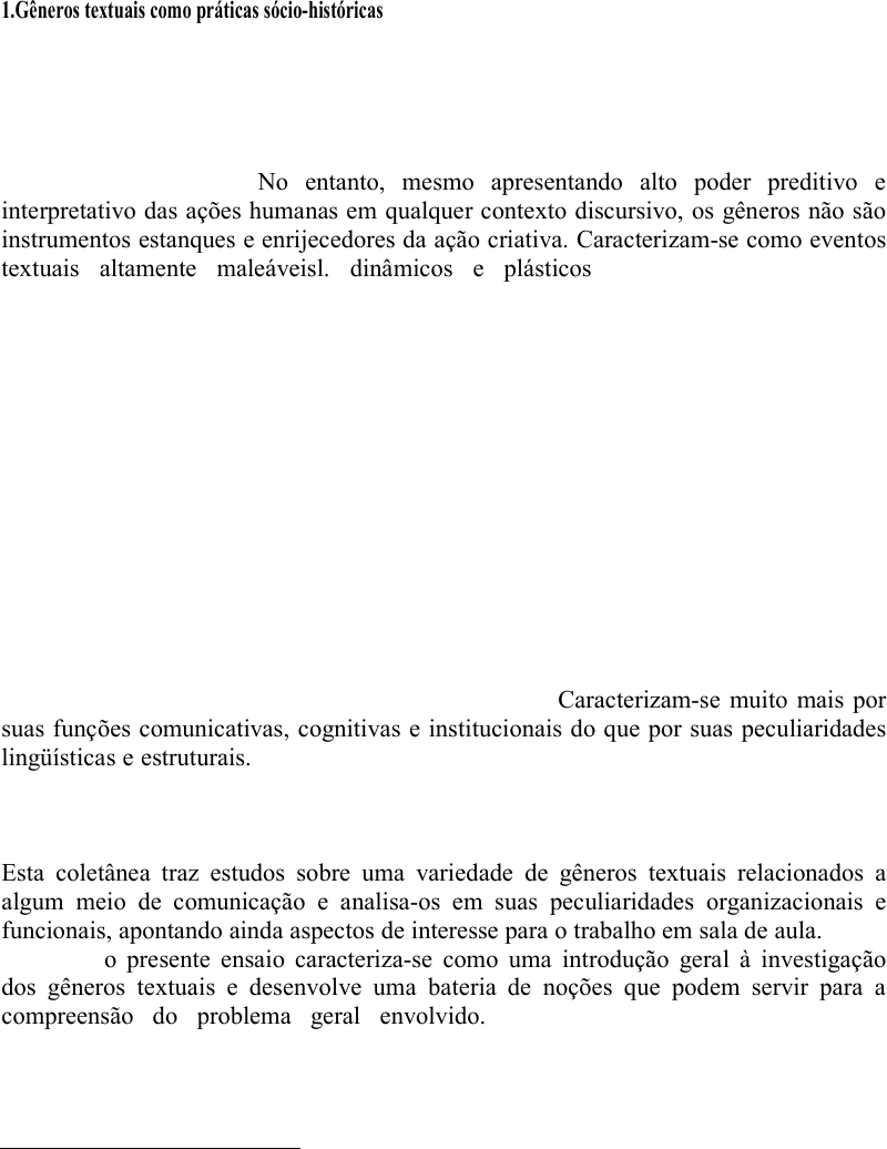 Gêneros textuais1: definição e funcionalidade Luiz Antônio Marcuschi 1.Gêneros textuais como práticas sócio-históricas Já se tornou trivial a idéia de que os gêneros textuais são fenômenos históricos, profundamente vinculados à vida cultural e social. Fruto de trabalho coletivo, os gêneros contribuem para ordenar e estabilizar as atividades comunicativas do dia-a-dia. São entidades sócio-discursivas e formas de ação social incontornáveis em qualquer situação comunicativa. No entanto, mesmo apresentando alto poder preditivo e interpretativo das ações humanas em qualquer contexto discursivo, os gêneros não são instrumentos estanques e enrijecedores da ação criativa. Caracterizam-se como eventos textuais altamente maleáveisl. dinâmicos e plásticos. Surgem emparelhados a necessidades e atividades sócioculturais, bem como na relação com inovações tecnológicas, o que é facilmente perceptível ao se considerar a quantidade de gêneros textuais hoje existentes em relação a sociedades anteriores à comunicação escrita. Quanto a esse último aspecto, uma simples observação histórica do surgimento dos gêneros revela que, numa primeira fase, povos de cultura essencialmente oral desenvolveram um conjunto limitado de gêneros. Após a invenção da escrita alfabética por volta do século VII A. c., multiplicam-se os gêneros, surgindo os típicos da escrita. Numa terceira fase, a partir do século XV, os gêneros expandem-se com o flores cimento da cultura impressa para, na fase intermediária de industrialização iniciada no século XVlII, dar início a uma grande ampliação. Hoje, em plena fase da denominada cultura eletrônica, com o telefone, o gravador, o rádio, a TV e, particularmente o computador pessoal e sua aplicação mais notável, a intemet, presenciamos uma explosão de novos gêneros e novas formas de comunicação, tanto na oralidade como na escrita. Isto é revelador do fato de que os gêneros textuais surgem, situam-se e integram-se funcionalmente nas culturas em que se desenvolvem. Caracterizam-se muito mais por suas funções comunicativas, cognitivas e institucionais do que por suas peculiaridades lingüísticas e estruturais. São de difícil definição formal, devendo ser contemplados em seus usos e condicionamentos sóciopragmáticos caracterizados como práticas sócio- discursivas. Quase inúmeros em diversidade de formas, obtêm denominações nem sempre unívocas e, assim como surgem, podem desaparecer. Esta coletânea traz estudos sobre uma variedade de gêneros textuais relacionados a algum meio de comunicação e analisa-os em suas peculiaridades organizacionais e funcionais, apontando ainda aspectos de interesse para o trabalho em sala de aula. Neste contexto, o presente ensaio caracteriza-se como uma introdução geral à investigação dos gêneros textuais e desenvolve uma bateria de noções que podem servir para a compreensão do problema geral envolvido. Certamente, haveria muitas outras perspectivas de análise e muitos outros caminhos teóricos para a definição e abordagem da questão, mas tanto o exíguo espaço como a finalidade didática desta breve introdução impedem que se façam longas incursões pela bibliografia técnica hoje 1 Este trabalho, elaborado especialmente para o presente livro, incorpora uma série de observações desenvolvidas com grande detalhe em um livro de minha autoria (Marcuschi, no prelo), que está sendo finalizado sob o título: "Gêneros Textuais: Constituição e Práticas Sociodiscursivas" a ser lançado pela Editora Cortez em breve. Joanderson Araújo Joanderson Araújo Joanderson Araújo Joanderson Araújo Joanderson Araújo Joanderson Araújo No presente capítulo, o autor destaca a ideia de gêneros textuais como: ''Ferramenta de ordenamento e estabilização das atividades comunicativas do cotidiano'', que passam a existir e inexistir de acordo com as atividades sócioculturais de determinada época e suas inovações tecnológicas. - altamente maleáveis, dinâmicos e plásticos. - a função comunicativa é colocada como característica mais relevante que suas peculiaridades linguísticas e estruturais. disponível. 2. Novos gêneros e velhas bases Como afirmado, não é difícil constatar que nos últimos dois séculos foram as novas tecnologias, em especial as ligadas à área da comunicação, que propiciaram o surgimento de novos gêneros textuais. Por certo, não são propriamente as tecnologias per se que originam os gêneros e sim a intensidade dos usos dessas tecnologias e suas interferências nas atividades comunicativas diárias. Assim, os grandes suportes tecnológicos da comunicação tais como o rádio, a televisão, o jornal, a revista, a internet, por terem uma presença marcante e grande centralidade nas atividades comunicativas da realidade social que ajudam a criar, vão por sua vez propiciando e abrigando gêneros novos bastante característicos. Daí surgem formas discursivas novas, tais como editoriais, artigos de fundo, notícias, telefonemas, telegramas, telemensagens, teleconferências, videoconferências, reportagens ao vivo, cartas eletrônicas (e-mails), bate-papos virtuais, aulas virtuais e assim por diante. Seguramente, esses novos gêneros não são inovações absolutas, quais criações ab ovo, sem uma ancoragem em outros gêneros já existentes. O fato já fora notado por Bakhtin [1997] que falava na 'transmutação' dos gêneros e na assimilação de um gênero por outro gerando novos. A tecnologia favorece o surgimento de formas inovadoras, mas não absolutamente novas. Veja-se o caso do telefonema, que apresenta similaridade com a conversação que lhe pré-existe, mas que, pelo canal telefônico, realiza-se com características próprias. Daí a diferença entre uma conversação face a face e um telefonema, com as estratégias que lhe são peculiares. O e-mail (correio eletrônico) gera mensagens eletrônicas que têm nas cartas 