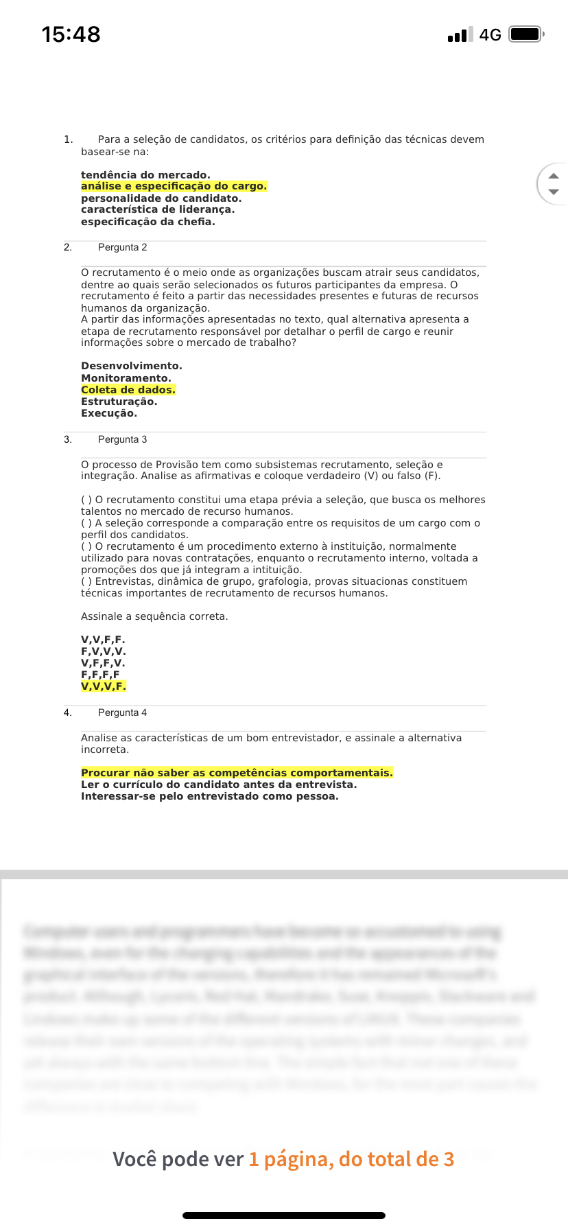 o processo de Provisão tem como subsistemas recrutamento, seleção e integração. Analise as afirmativas e coloque verdadeiro (V) ou falso (F). ( ) recrutamento constitui uma etapa prévia a seleção, que busca os melhores talentos no mercado de recurso humanos. ( ) A seleção corresponde a comparação entre os requisitos de um cargo com o perfil dos candidatos. ( ) o recrutamento é um procedimento externo à instituição, normalmente utilizado para novas contratações, enquanto o recrutamento interno, voltada a promoções dos que já integram a intituição. ( ) Entrevistas, dinâmica de grupo, grafologia, provas situacionas constituem técnicas importantes de recrutamento de recursos humanos. F,V,V,V. V,F,F,V. F,F,F,F.