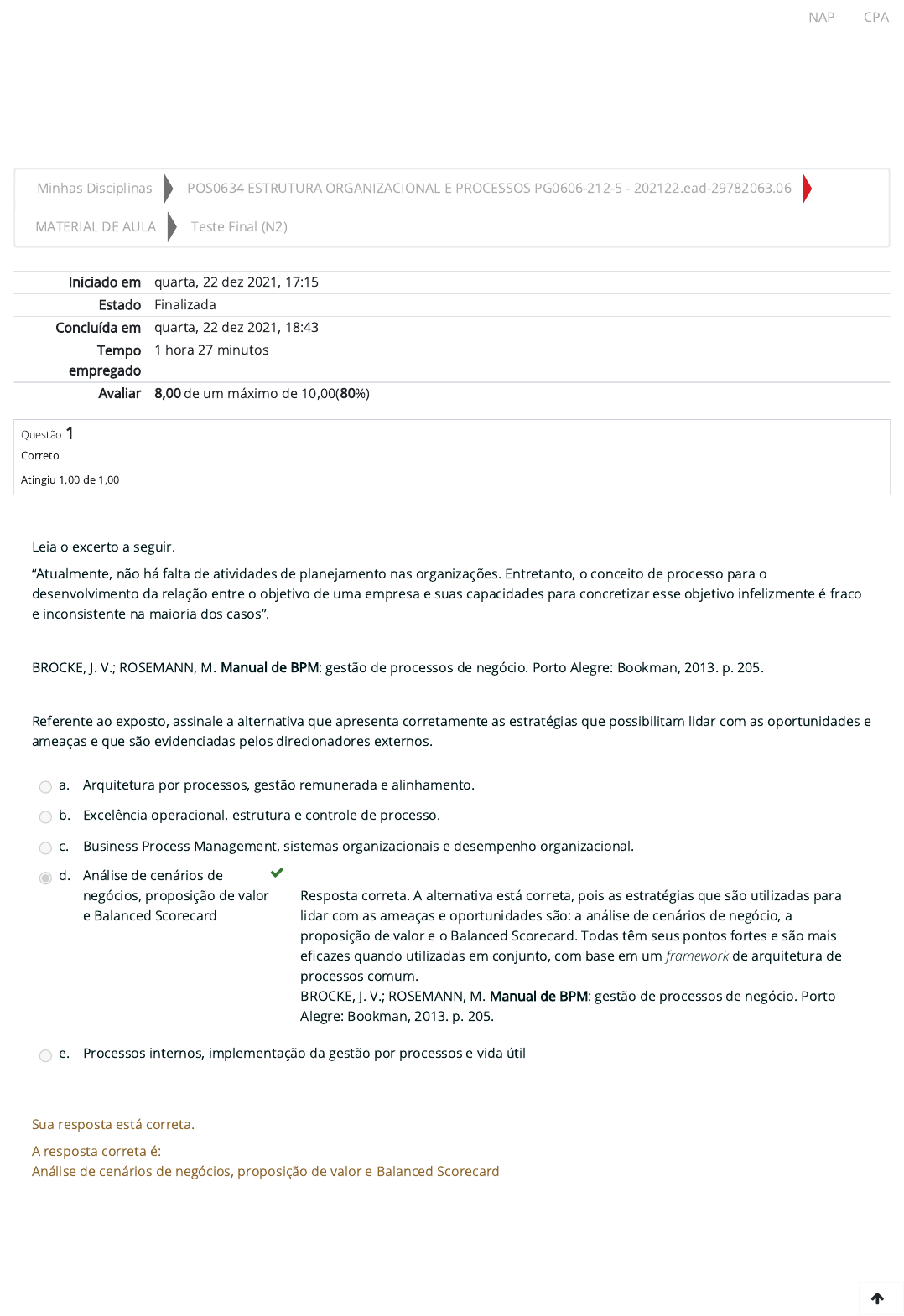Minhas Disciplinas POS0634 ESTRUTURA ORGANIZACIONAL E PROCESSOS PG0606-212-5 - 202122.ead-29782063.06 MATERIAL DE AULA Teste Final (N2) Iniciado em quarta, 22 dez 2021, 17:15 Estado Finalizada Concluída em quarta, 22 dez 2021, 18:43 Tempo empregado 1 hora 27 minutos Avaliar 8,00 de um máximo de 10,00(80%) Questão 1 Correto Atingiu 1,00 de 1,00 Leia o excerto a seguir. “Atualmente, não há falta de atividades de planejamento nas organizações. Entretanto, o conceito de processo para o desenvolvimento da relação entre o objetivo de uma empresa e suas capacidades para concretizar esse objetivo infelizmente é fraco e inconsistente na maioria dos casos”. BROCKE, J. V.; ROSEMANN, M. Manual de BPM: gestão de processos de negócio. Porto Alegre: Bookman, 2013. p. 205. Referente ao exposto, assinale a alternativa que apresenta corretamente as estratégias que possibilitam lidar com as oportunidades e ameaças e que são evidenciadas pelos direcionadores externos. a. Arquitetura por processos, gestão remunerada e alinhamento. b. Excelência operacional, estrutura e controle de processo. c. Business Process Management, sistemas organizacionais e desempenho organizacional. d. Análise de cenários de negócios, proposição de valor e Balanced Scorecard Resposta correta. A alternativa está correta, pois as estratégias que são utilizadas para lidar com as ameaças e oportunidades são: a análise de cenários de negócio, a proposição de valor e o Balanced Scorecard. Todas têm seus pontos fortes e são mais e�cazes quando utilizadas em conjunto, com base em um framework de arquitetura de processos comum. BROCKE, J. V.; ROSEMANN, M. Manual de BPM: gestão de processos de negócio. Porto Alegre: Bookman, 2013. p. 205. e. Processos internos, implementação da gestão por processos e vida útil Sua resposta está correta. A resposta correta é: Análise de cenários de negócios, proposição de valor e Balanced Scorecard NAP CPA https://ambienteacademico.com.br/my/ https://ambienteacademico.com.br/course/view.php?id=172 https://ambienteacademico.com.br/course/view.php?id=172§ion=2 https://ambienteacademico.com.br/mod/quiz/view.php?id=3766 https://codely-fmu-content.s3.amazonaws.com/Moodle/NAP/inicial/nap/fmu/index.html https://codely-fmu-content.s3.amazonaws.com/Moodle/CPA/landing_CPA/index.html Questão 2 Correto Atingiu 1,00 de 1,00 Leia o excerto a seguir. “Muitas organizações [...] tratam cada situação como algo exclusivo, em que os atos heroicos e a improvisação ocupam o lugar da sustentação de um processo bem de�nido. Obviamente, esses atos heroicos não são con�áveis, nem sustentáveis”. HAMMER, M. O que é Gestão de Processos de Negócios? In: BROCKE, J. V.; ROSEMANN, M. (Org.). Manual de BPM: gestão de processo de negócio. Porto Alegre: Bookman, 2013. p. 5. Considerando o excerto apresentado, assinale a alternativa correta acerca dos processos do BPM. a. Tão logo o processo se inicia em uma instituição, é necessário o gerenciamento de tempos em tempos. b. O desempenho da organização deve sempre ser contraposto às regras de cada processo já instituído. c. As metas devem se embasar nas expectativas dos clientes, na concorrência e na necessidade da empresa. Resposta correta. A alternativa está correta, pois as metas de�nidas em um processo podem se embasar em marcos da concorrência (benchmarks), como também na expectativa de clientes, assim como a organização deve levar em consideração suas necessidades. HAMMER, M. O que é Gestão de Processos de Negócios? In: BROCKE, J. V.; ROSEMANN, M. (Org.). Manual de BPM: gestão de processo de negócio. Porto Alegre: Bookman, 2013. p. 5. d. Ao se analisar o padrão de su�ciência de desempenho, é possível indicar se há falhas no desenho ou execução do processo. e. Mesmo com desenho ou execução falhos, os processos correspondem às imposições de desempenho da organização. Sua resposta está correta. A resposta correta é: As metas devem se embasar nas expectativas dos clientes, na concorrência e na necessidade da empresa. NAP CPA https://codely-fmu-content.s3.amazonaws.com/Moodle/NAP/inicial/nap/fmu/index.html https://codely-fmu-content.s3.amazonaws.com/Moodle/CPA/landing_CPA/index.html Questão 3 Correto Atingiu 1,00 de 1,00 A arquitetura orientada a serviços busca oferecer abstrações e princípios que sejam comuns com o objetivo de constituir sistemas uniformes, tanto na ótica da Tecnologia da Informação (TI) como também na ótica de negócios, sempre buscando melhorar os processos. Com base no exposto, assinale a alternativa correta acerca da arquitetura orientada a serviços. a. É uma associação entre a análise de processo com metodologias estatísticas de controle da qualidade com um programa de recompensas organizacionais. b. Refere-se às capacidades que o negócio disponibiliza e às capacidades oferecidas pelos sistemas de aplicação especí�cos. c. É um modelo que visa estruturar sistemas de software e informação pautados nas capabilities que certos fragmentos do sistema oferecem para outros fragmentos. Resposta correta. A alternativa está correta, pois a arquitetura orientada a serviços é um modelo que visa à estrutura de sistemas de software e informação, que se pautam nas capabilities que certas partes do sistema oferecem para outras partes. d. É uma forma sistematizada, racional e consistente de entender, documentar, investigar, efetivar e sempre aprimorar processos de negócios de ponta a ponta. e. É um conjunto de ideias a favor da simpli�cação do trabalho para distinguir a melhor maneira de executar uma atividade e recompensar os resultados. Sua resposta está correta. A resposta correta é: É um modelo que visa estruturar sistemas de software e informação pautados nas capabilities que certos fragmentos do sistema oferecem para outros fragmentos. NAP CPA https://codely-fmu-content.s3.amazonaws.com/Moodle/NAP/inicial/nap/fmu/index.h