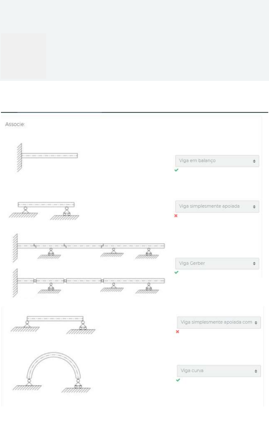 CONCRETO 45A102 - ATIVIDADE 02 Questão 1 Parcialmente correto Atingiu 1,50 de 2,50 Marcar questão Texto da questão Associe: Questão 2 Correto Atingiu 2,50 de 2,50 Marcar questão Texto da questão O dimensionamento das diferentes partes da estrutura é normalmente feito considerando‐se o sistema estrutural completo em sua complexidade. Escolha uma opção: Verdadeiro Falso Questão 3 Correto Atingiu 2,50 de 2,50 Marcar questão Texto da questão Questão 4 Correto Atingiu 2,50 de 2,50 Marcar questão Texto da questão Para realizar a análise estrutural, o arranjo construtivo de uma estrutura é imaginado como sendo constituído por um conjunto de elementos estruturais mais ou menos complexos, aos quais são aplicadas as ações que atuam na construção e cujos efeitos servem para o dimensionamento das diferentes partes dessa estrutura. Escolha uma opção: Verdadeiro Falso