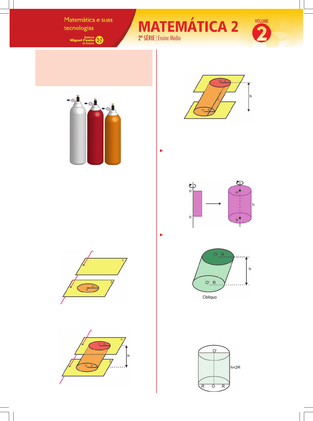 25 PARTE II UNIDADE 3 CILINDROS CILINDROS De grande utilidade no cotidiano, o sólido cilíndrico pode ser visto em muitas situações do dia-a-dia, como latas, tu- bos PVC, seringas, caixas d’água, velas, rolos, peças automotivas, dentre várias outras. Por conta dessa presença significativa, os cilindros são de fácil associação à nossa vida e, por essa razão, mos- tram-se uma importante etapa para estudos na geometria métrica espacial. VEJAMOS OS TEMAS TEÓRICOS Considere dois planos, ααααα e βββββ, paralelos, um circulo de centro O e raio contido num deles, e uma reta r concorrente com os dois. Chamamos cilindro o sólido determinado pela reunião de todos os segmentos paralelos a r, com extremidades no circulo e no outro plano. Qualquer segmento paralelo a r, com extremidades nas duas circunferências, é chamado geratriz do ciclindro, e o segmento com extremidades nos centros O e O’ dos circulos é denominado eixo do cilindro. A distância entros planos ααααα e βββββ é a altura h do cilindro. CLASSIFICAÇÃO Um cilindro é classificado segundo o ângulo formado pela geratirz com os planos das bases: Reto Geratriz perpendicular às bases e igual à altura. O cilindro circular reto também é conhecido por cilin- dro de revolução, pois pode ser obtido pela revolução de 360o de uma região retangular em torno de um eixo. Oblíquo Todo cilindro que não é reto. SEÇÃO MERIDIANA DO CILINDRO Chamamos seção meridina de um cilindro, a interseção do cilindro com um plano que contém seu eixo. Qando a altura de um cilindro reto é igual a 2R, a seção meridiana é um quadrado de lado 2R e esse cilindro é de- nominado cilindro equilátero. 26 ÁREAS E VOLUME DO CILINDRO RETO A área de cada base do cilidro reto depende do raio R e é dada por: Sb=πππππR 2 Como calcular a área lateral: S lllll =2πππππRh A área total será: St=Slllll+2Sb Temos então que a área total é dada por: St=2πππππRh+2πππππR 2 O princípio de Cavalieri também nos permite concluir que o volume do cilindro é dado pelo produto da área da base pela altura ou pela geratriz: V=πππππR2·h NOTA No século XVII o matemático Italiano Bonaventura Cavalieri estabelece um princípio básico para o cálculo de volumes, que diz que dois sólidos que tiverem a mesma altura e, sempre que seccionados por um mesmo plano gerarem áreas iguais, terão o mesmo volume. Se área A=área B, então o volume do cilindro oblíquo é igual o volume do cilindo reto. V=A·h=B·h 01 Qual o volume, em litros, de um cilindro reto com raio da base 3 cm e altura 10 cm, se adotarmos 3 para o valor de π ? 02 Qual a área lateral de um cilindro equilátero. Com raio da base 10 dm ? Adote π = 3,14. 03 Um tipo de maionese é vendido em embalagens cilín- dricas, A e B. A embalagem A tem raio da base R e altura 2H, já a lata B tem raio da base 2R e altura H. Sabendo que ambas são confeccionadas com mesmo tipo de chapa de alumínio, qual delas consome mais material para ser fabricada ? 04 Qual a área da secção meridiana de um cilindro equilátero com altura igual a 30 cm ? 05 A Figura mostra um retângulo ABCD cujos lados me- dem 7 cm e 3 cm. Um cilindro será formado girando-se o retângulo ABCD em torno da reta definida pelo seu lado AB. A medida do volume desse cilindro, em centímetros cú- bicos, é mais próxima de (A) 750 (B) 441 (C) 63 (D) 126 (E) 190 27 06 (UERJ/2017) Um cilindro circular reto possui diâmetro AB de 4 cm e altura AA’ de 10 cm. O plano α, perpendi- cular à seção meridiana ABB’A’, que passa pelos pon- tos B e A’ das bases, divide o cilindro em duas partes, conforme ilustra a imagem. O volume da parte do cilindro compreendida entre o plano α e a base inferior, em cm3, é igual a: (A) 8π (B) 12π (C) 16π (D) 20π 01 (IBMEC SP INSPER/2018) Um cilindro circular reto, branco, possui 20 cm de diâmetro da base e 80 cm de altura. Sobre a lateral desse cilindro, foi pintada uma faixa marrom de largura uniforme igual a 3,14 cm. A faixa completou duas revoluções ao redor do cilindro, como mostra a figura. Nas condições descritas, a faixa marrom ocupou, da área lateral do cilindro, aproximadamente, (A) 5%. (B) 25%. (C) 0,5%. (D) 2,5%. (E) 10%. 02 (UNIFOR CE/2018) Em virtude da grande escassez de água no estado do Ceará, foi decidida em reunião do condomínio do edifício Castel Gandolfo, a construção de uma nova cisterna, a fim de aumentar o volume de água armazenada. A cisterna atual tem formato cilín- drico, com 3m de altura e 2m de diâmetro. Ficou deci- dido que a nova cisterna deverá armazenar 81m3. Mantendo-se o mesmo formato e a mesma altura da atual, qual deve ser o aumento no raio da nova cister- na para atingir o volume desejado? (use π = 3,0). (A) 0,5 metro. (B) 1,0 metro. (C) 2,0 metros. (D) 2,5 metros. (E) 3,0 metros. 03 (UNIFOR CE/2018) Um posto de combustível inaugu- rado recentemente em Fortaleza, usa tanque subterrâ- neo que tem a forma de um cilindro circular reto na posição vertical, como mostra a figura abaixo. O tan- que está completamente cheio com 42m3 de gasolina e 30 m3 de álcool. Considerando que a altura do tanque é de 12 metros, a altura da camada de gasolina é: (A) 6m (B) 7m (C) 8m (D) 9m (E) 10m 04 (ENEM) Em muitas regiões do Estado do Amazonas, o volume de madeira de uma árvore cortada é avaliado de acordo com uma prática dessas regiões: I) Dá-se uma volta completa em torno do tronco com um barbante. II) O barbante é dobrado duas vezes pela ponta e, em seguida, seu comprimento é medido com fita métrica. III) O valor obtido com essa medida é multiplicado por ele mesmo e depois multiplicado pelo comprimento do tron- co. Esse é o volume estimado de madeira. Outra estimativa pode ser obtida pelo cálculo formal do volume do tronco, considerando-o um cilindro perfeito. A diferença entre essas medidas é praticamente equi- valente às perdas de madeira no processo de corte para comercializaç