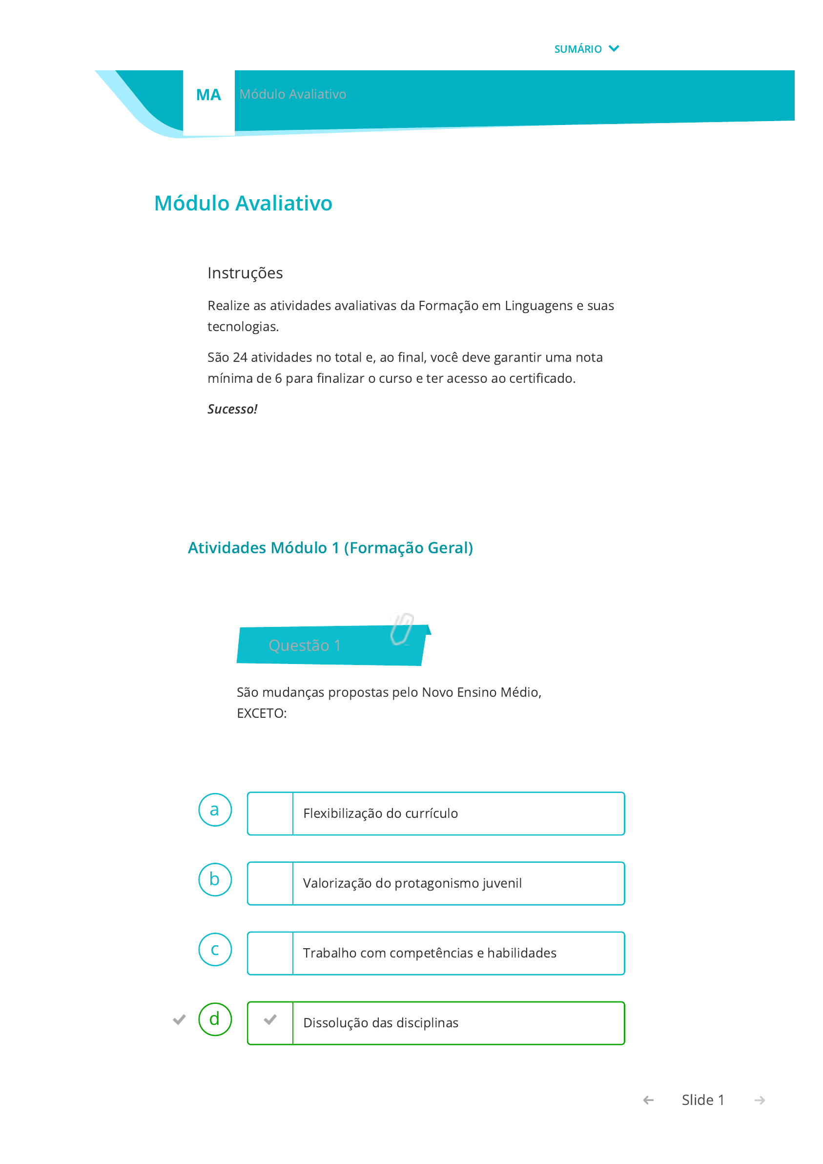 26/12/21, 12:12 Módulo Avaliativo https://avamec.mec.gov.br/#/instituicao/seb/curso/14540/unidade/8111/acessar 1/13 Módulo Avaliativo Instruções Realize as atividades avaliativas da Formação em Linguagens e suas tecnologias. São 24 atividades no total e, ao �nal, você deve garantir uma nota mínima de 6 para �nalizar o curso e ter acesso ao certi�cado. Sucesso! Atividades Módulo 1 (Formação Geral) São mudanças propostas pelo Novo Ensino Médio, EXCETO: Flexibilização do currículoa Valorização do protagonismo juvenilb Trabalho com competências e habilidadesc Dissolução das disciplinas d Questão 1 SUMÁRIO MA Módulo Avaliativo Slide 1 javascript:void(0) https://avamec.mec.gov.br/ava-mec-ws/instituicao/seb/conteudo/modulo/4504/mod3/uni1/slide01.html 26/12/21, 12:12 Módulo Avaliativo https://avamec.mec.gov.br/#/instituicao/seb/curso/14540/unidade/8111/acessar 2/13 São mudanças propostas pelo Novo Ensino Médio, EXCETO: I. Língua Portuguesa e Matemática são as únicas disciplinas com habilidades especí�cas. II. Os componentes da área de Linguagens compreendem as disciplinas de Língua Portuguesa, Língua Estrangeira e Artes. III. Os currículos devem, obrigatoriamente, englobar duas partes: formação geral básica e itinerários formativos. IV. A carga horária total da formação geral básica é �exível. Estão corretas: I e IIa II e IVb I e III c III e IVd Assinale a característica que NÃO se aplica aos itinerários formativos: São constituídos por conjuntos de unidades curriculares a Sua carga horária deve ser entre 1200 e 1800 horas. b Questão 2 Questão 3 Slide 1 javascript:void(0) https://avamec.mec.gov.br/ava-mec-ws/instituicao/seb/conteudo/modulo/4504/mod3/uni1/slide01.html 26/12/21, 12:12 Módulo Avaliativo https://avamec.mec.gov.br/#/instituicao/seb/curso/14540/unidade/8111/acessar 3/13 Podem ser detalhados pelos sistemas, redes e escolas. c Devem ser organizar em torno de eixos estruturantes. d Sobre as Unidades Curriculares, assinale a alternativa correta: Podem ou não ter carga horária de�nida.a Dizem respeito apenas aos itinerários formativos.b Têm como objetivo desenvolver competências especí�cas. c Precisa desenvolver habilidades de ao menos dois eixos estruturantes. d São propostas da BNCC, EXCETO: Privilegia os temas regionais para mobilizar as habilidades. a Deve-se evitar a fragmentação das unidades curriculares. b Questão 4 Questão 5 Slide 1 javascript:void(0) https://avamec.mec.gov.br/ava-mec-ws/instituicao/seb/conteudo/modulo/4504/mod3/uni1/slide01.html 26/12/21, 12:12 Módulo Avaliativo https://avamec.mec.gov.br/#/instituicao/seb/curso/14540/unidade/8111/acessar 4/13 Prevê o ensino baseado em competências e habilidades. c Os currículos devem prezar pela interdisciplinaridade. d No Novo Ensino Médio, espera-se dos estudantes: I. A leitura crítica da realidade. II. O enfrentamento de desa�os atuais. III. A participação cidadã na sociedade. IV. A tomada de decisões acertadas. Nesse sentido, Apenas I e II estão corretas.a Apenas II e III estão corretas.b Apenas I, III e IV estão corretas.c I, II, III e IV estão corretas. d Sobre as competências gerais estabelecidas pela BNCC, é INCORRETO a�rmar que: Buscam promover valores como a empatia, o diálogo e a cooperação. a Questão 6 Questão 7 Slide 1 javascript:void(0) https://avamec.mec.gov.br/ava-mec-ws/instituicao/seb/conteudo/modulo/4504/mod3/uni1/slide01.html 26/12/21, 12:12 Módulo Avaliativo https://avamec.mec.gov.br/#/instituicao/seb/curso/14540/unidade/8111/acessar 5/13 Visam o exercício da curiosidade intelectual e do pensamento crítico. b Privilegiam a comunicação digital em relação a outras linguagens c Valorizam a argumentação na tomada de decisões cotidianas. d Nas questões de 8 a 12, assinale CERTO ou ERRADO. Embora façam parte da área de Linguagens, Arte e Educação Física não são componentes obrigatórios nos três anos do Ensino Médio. CERTO a ERRADOb Os estados da federação puderam escolher adequar ou não os currículos do Ensino Médio à BNCC. CERTOa ERRADO b Questão 8 Questão 9 Slide 1 javascript:void(0) https://avamec.mec.gov.br/ava-mec-ws/instituicao/seb/conteudo/modulo/4504/mod3/uni1/slide01.html 26/12/21, 12:12 Módulo Avaliativo https://avamec.mec.gov.br/#/instituicao/seb/curso/14540/unidade/8111/acessar 6/13 A BNCC do Ensino Médio consolida e amplia as aprendizagens previstas pela BNCC do Ensino Fundamental. CERTO a ERRADOb São 10 as competências especí�cas da área de Linguagens e suas tecnologias. CERTOa ERRADO b O elo entre os componentes curriculares Arte, Educação Física, Língua Inglesa e Língua Portuguesa reside no uso da linguagem. CERTO a ERRADOb Questão 10 Questão 11 Questão 12 Slide 1 javascript:void(0) https://avamec.mec.gov.br/ava-mec-ws/instituicao/seb/conteudo/modulo/4504/mod3/uni1/slide01.html 26/12/21, 12:12 Módulo Avaliativo https://avamec.mec.gov.br/#/instituicao/seb/curso/14540/unidade/8111/acessar 7/13 Módulo 2 (Itinerários integrados) Sobre os eixos estruturantes e as habilidades associadas às competências gerais da área de Linguagens, faça a correspondência correta. EIXOS ESTRUTURANTES Investigação Cientí�ca1 Processos Criativos2 Mediação e Intervenção Cultural 3 Empreendedorismo4 HABILIDADES: Difundir novas ideias, propostas, obras ou soluções por m de diferentes linguagens, mídias e plataformas, analógica digitais, com con�ança e coragem, assegurando que alcan os interlocutores pretendidos. 3 Identi�car, selecionar, processar e analisar dados, fatos e evidências com curiosidade, atenção, criticidade e ética, inclusive utilizando o apoio de tecnologias digitais. 1 Re�etir continuamente sobre seu próprio desenvolvimen sobre seus objetivos presentes e futuros, identi�cando aspirações e oportunidades, inclusive relacionadas ao mu do trabalho, que orientem escolhas, esforços e ações em relação à sua vida pessoal, pro
