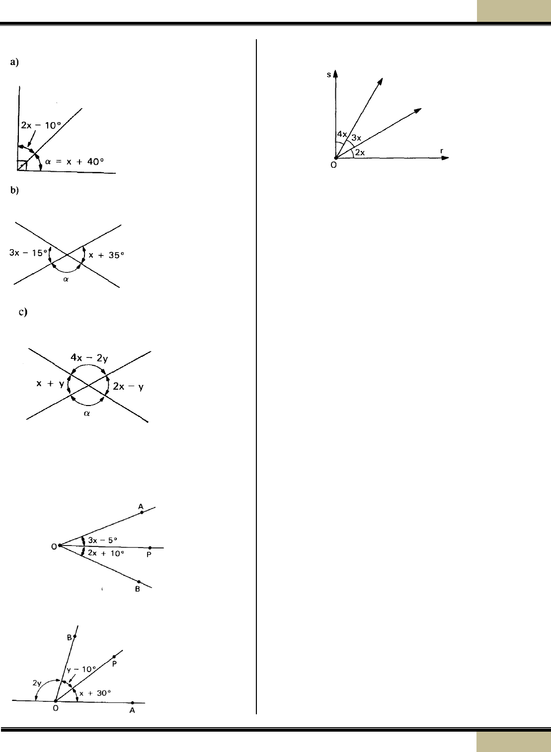 LLiissttaa ddee eexxeerrccíícciiooss –– 22001122 // ÂÂnngguullooss ee ttrriiâânngguullooss 2 º Ano profalexandreassis@hotmail.com 1 (01) Determine o valor de a nos casos: (02) Se OP é a bissetriz de AÔB, determine x nos casos: (a) (b) (03) Calcule o valor de x no caso seguinte, em que m(rÔs) = 90o. (04) A soma de dois ângulos adjacentes é 120o. Calcule a medida de cada ângulo, sabendo que a medida de um deles é a diferença entre o triplo do outro e 40o. (05) Dê a medida do ângulo que vale o dobro do seu complemento. (06) Determine a medida do ângulo igual ao triplo do seu complemento. (07) Calcule o ângulo que vale o quádruplo de seu complemento. (08) Calcule um ângulo, sabendo que um quarto do seu suplemento vale 36o. (09) Qual é o ângulo que excede o seu complemento em 76o. (10) Qual é o ângulo que somado ao triplo do seu complemento dá 210 o. (11) Um ângulo excede o seu complemento em 48 o. Determine o suplemento desse ângulo. (12) O suplemento de um ângulo excede este ângulo em 120 o. Determine esse ângulo. (13) O complemento da terça parte de um ângulo excede o complemento desse ângulo em 30 o. Determine esse ângulo. (14) Dois ângulos estão na relação 4/9. Sendo 130 o sua soma, determine o complemento do menor. (15) Determine dois ângulos suplementares, sabendo que um deles é o triplo do outro. LLiissttaa ddee eexxeerrccíícciiooss –– 22001122 // ÂÂnngguullooss ee ttrriiâânngguullooss 2 º Ano profalexandreassis@hotmail.com 2 (16) Dois ângulos são suplementares. Um deles é o complemento da quarta parte do outro. Calcule esses ângulos. (17) A razão entre dois ângulos suplementares é igual a 2/7. Determine o complemento do menor. (18) A soma de um ângulo com a terça parte do seu complemento resulta 46 o. Determine o suplemento desse ângulo. (19) Determine dois ângulos complementares tais que o dobro de um, aumentado da terça parte do outro, seja igual a um ângulo reto. (20) Na figura seguinte, o ângulo x mede a sexta parte do ânguloy, mais a metade do ângulo z. Calcule o ângulo y. (21) Cinco semirretas partem de um mesmo ponto V, formando cinco ângulos que cobrem todo o plano e são proporcionais aos números 2, 3, 4, 5 e 6. Calcule o mais dos ângulos. (22) As retas r e s são paralelas, determine x nos caos: (a) (b) (23) As retas r e são paralelas. Determine x e y. (a) (b) (24) Na figura seguinte, sendo r//s, calcule x e y. LLiissttaa ddee eexxeerrccíícciiooss –– 22001122 // ÂÂnngguullooss ee ttrriiâânngguullooss 2 º Ano profalexandreassis@hotmail.com 3 (25) na figura temos os ângulos e de lados respectivamente paralelos. Sendo = 8x e = 2x + 300, determine o suplemento de . (26) se as retas r e s são paralelas, determine x, y e z nos casos: (a) (b) (27) Calcule o valor de x, sendo r//s. (28) na figura seguinte, as retas r e s são paralelas. Calcule . (28) Sendo r e s retas paralelas e DE = 2AB, determine x. (29) Determine x nos casos: (a) (b) (30) Determine x e y nos casos seguintes: (a) LLiissttaa ddee eexxeerrccíícciiooss –– 22001122 // ÂÂnngguullooss ee ttrriiâânngguullooss 2 º Ano profalexandreassis@hotmail.com 4 (b) (c) (31) Determine o valor da incógnita (os segmentos com “marcas iguais” são congruentes). (a) AB = AC (b) (c) (d) (e) (32) Na figura, o triângulo ABC é isósceles de base BC. Calcule o valor de x. (33) Calcule o valor de x em função de m. LLiissttaa ddee eexxeerrccíícciiooss –– 22001122 // ÂÂnngguullooss ee ttrriiâânngguullooss 2 º Ano profalexandreassis@hotmail.com 5 (34) Na figura, calcule o ângulo x, sendo o triplo de e o sêxtuplo de . LLiissttaa ddee eexxeerrccíícciiooss –– 22001122 // ÂÂnngguullooss ee ttrriiâânngguullooss 2 º Ano profalexandreassis@hotmail.com 6