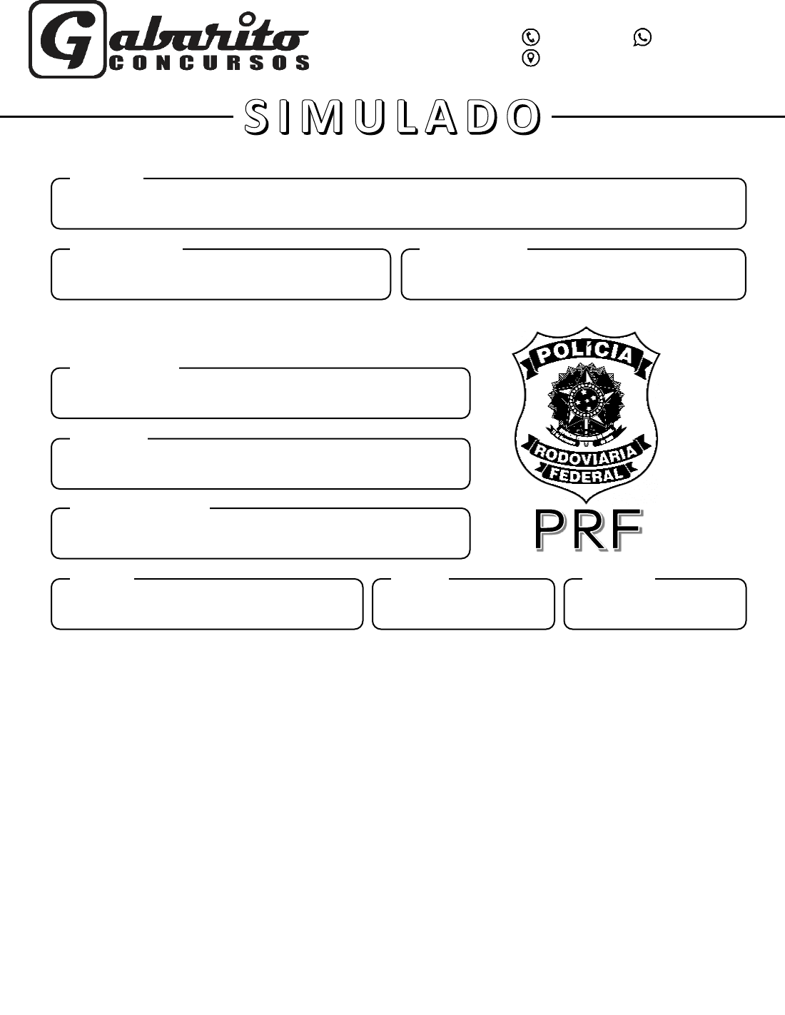 POLÍCIA RODOVIÁRIA FEDERAL INSTITUIÇÃO: CARGO: LOCAL DA PROVA: SALA: ANDAR: 27/01/2019 DATA: DADOS DA PROVA NOME: DADOS DO ALUNO DOCUMENTO: ASSINATURA: ORIENTAÇÕES LEIA COM ATENÇÃO AS TODAS AS INSTUÇÕES A SEGUIR. 1. Ao receber este caderno de provas, confira se contém a quantidade de itens indicado em sua folha de respostas, acompanhada de espaço para rascunho. Caso o caderno esteja incompleto, tenha qualquer defeito ou apresente discordância, solicite ao fiscal de sala mais próximo que tome as providências cabíveis, pois não serão aceitas reclamações posteriores nesse sentido. 2. Não se comunique com outros candidatos nem se levante sem autorização de um fiscal de sala. 3. Não serão distribuídas folhas suplementares de rascunho. 4. Na duração das provas, está incluído o tempo destinado a identificação – que será realizado no decorrer das provas –, ao preenchimento da cartão de respostas. 5. Ao terminar as provas, chame o fiscal de sala mais próximo, devolva-lhe a sua prova e deixe o local de provas. 6. O não cumprimento das determinações constantes em edital, no presente caderno, implicará na anulação das suas respostas. 7. Não serão conhecidos recursos em desacordo com o estabelecido em edital. Todas as questões deste simulado foram retiradas de provas anteriores aplicadas em outros concursos. R. Salgado Filho, 3091, Porto Velho - RO (69) 99292-5006 (69) 3302-0779 Gabarito Concursos Polícia Rodoviária Federal 1 PORTUGUÊS Com relação às ideias e aos sentidos do texto CB1A1-I, julgue os próximos itens. 1 - São os bons fundamentos da acusação que convencem o acusado a confessar sua conduta criminosa. 2 - Ao declarar-se autor da conduta criminosa, o réu legitima a acusação. 3 - A confissão é um ato secreto e voluntário, segundo o texto. 4 - A palavra “Daí” (l.22) faz referência ao trecho “No interior do crime reconstituído por escrito” (l.18). 5 - A correção gramatical do texto seria preservada se o trecho “sábia e obscuramente” (l.16) fosse isolado por vírgulas. 6 - O trecho “que não há (...) indícios” (l. 7 e 8) exprime uma noção de consequência. 7 - A substituição da palavra “só” (l.26) por somente não alteraria os sentidos do texto, já que ambas são sinônimos no contexto linguístico considerado. 8 - Para o autor, a confissão sobressai entre as provas construídas pela investigação, mas não é condição para a determinação da verdade. 9 - A investigação penal deve ser encerrada quando há confissão do acusado, uma vez que este ato pressupõe a culpa do criminoso confesso e implica a sua condenação. 10 - Infere-se do texto que o autor não concorda com a ideia de que a confissão seja apenas mais uma prova entre tantas outras. 11 - Do trecho “se não tiver em sua posse mais do que a confissão regular do culpado, o juiz deverá então fazer investigações complementares” (ℓ. 29 a 31) depreende-se que, diante da ausência de confissão, é dever do juiz buscar outros indícios de autoria. 12 - A correção gramatical do texto seria prejudicada se o trecho “a regras rigorosas” (ℓ.2) fosse substituído por sob regras rigorosas BLOCO I Gabarito Concursos Polícia Rodoviária Federal 2 Em relação às finalidades dos textos oficiais, julgue o item seguinte. 13 - O ofício é o documento adequado para o tratamento de assuntos oficiais pelos órgãos da administração pública entre si e também com particulares. Assunto: Convite para cerimônia de posse do presidente do Superior Tribunal Militar Senhor Juiz-Auditor titular, da 12.ª Circunscrição Judiciária Militar, Convido-o para a cerimônia de posse do presidente do Superior Tribunal Militar, a realizar-se na sede do órgão, em Brasília, no dia 1.º de março de 20XX. Por favor, confirme sua presença até o dia 1.º de fevereiro de 20XX. Considerando o trecho de documento hipotético apresentado anteriormente, julgue o item a seguir. 14 - Caso o documento hipotético em questão tenha sido enviado pela Assessoria de Cerimonial da Presidência do Superior Tribunal Militar, no documento de confirmação enviado à autoridade emissora, deverá ser empregado o pronome de tratamento Vossa Senhoria. MATEMÁTICA 15 - Para percorrer 630 km, um automóvel consome 50 litros de gasolina, e cada litro custa R$ 5,00. Mantendo- se a mesma média de consumo, gasta-se, aproximadamente,200 reais para percorrer 500 km. 16 - A tabela apresenta as frequências acumuladas das notas de 70 alunos, obtidas em uma avaliação. A frequência absoluta da 2ª classe é igual a 38. Uma avenida retilínea terá um trecho de 3,6 km recapeado, e isso será feito em 3 etapas, conforme mostra a figura. 17 - O comprimento do trecho a ser recapeado na 2ª etapa é de 400 metros. 18 - Um determinado produto, se for comprado a prazo, terá 10% de acréscimo sobre o valor da etiqueta, e passará a custar R$ 93,50. Se esse produto for comprado à vista, terá 20% de desconto sobre o valor da etiqueta. O preço desse produto à vista é R$68,00. 19 - Em um depósito há um determinado número de caixas que deverão ser empilhadas, de modo que cada pilha tenha o mesmo número de caixas. Na realização da tarefa foi constatado que, se cada pilha tiver 5 caixas, ou 6 caixas ou 8 caixas, sempre restarão 2 caixas fora das pilhas. O menor número de caixas que deverão ser empilhadas nesse depósito é 120 20 - José comprou um sítio de 14 hectares, reservando, para a construção da casa e área de lazer, 1/4 do terreno. O restante, José usou para plantar arroz, milho e feijão. Se a área plantada tem 2/7 de arroz e 3/5 de milho, o número de metros quadrados do terreno foram ocupados com a plantação de feijão é superior a 12.000. Dado: 1 hectare = 10000 m² Texto 11A1AAA Se x ≥ 0 representa a quantidade de quilômetros percorridos por um veículo em determinado dia, então: • representa a quantidade de litros de combustível consumido p