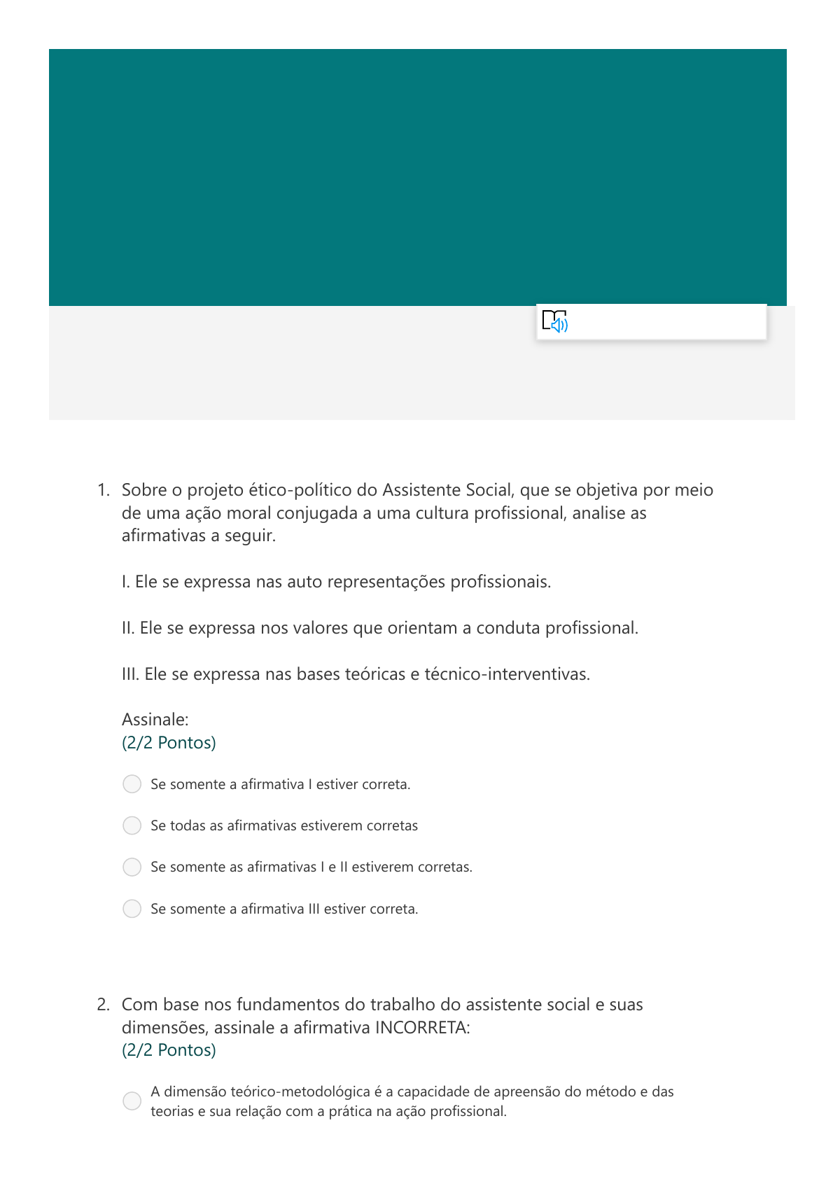28/12/2021 16:07 Tarefas | Microsoft Teams https://teams.microsoft.com/_#/apps/66aeee93-507d-479a-a3ef-8f494af43945/sections/classroom 1/4 Pontos: 19/20 Avaliação Online (21-Passos- ServiçoSocial-21-SSO-3UN-0) 20 pontos Sobre o projeto ético-político do Assistente Social, que se objetiva por meio de uma ação moral conjugada a uma cultura profissional, analise as afirmativas a seguir. I. Ele se expressa nas auto representações profissionais. II. Ele se expressa nos valores que orientam a conduta profissional. III. Ele se expressa nas bases teóricas e técnico-interventivas. Assinale: (2/2 Pontos) 1. Se somente a afirmativa I estiver correta. Se todas as afirmativas estiverem corretas Se somente as afirmativas I e II estiverem corretas. Se somente a afirmativa III estiver correta. Com base nos fundamentos do trabalho do assistente social e suas dimensões, assinale a afirmativa INCORRETA: (2/2 Pontos) 2. A dimensão teórico-metodológica é a capacidade de apreensão do método e das teorias e sua relação com a prática na ação profissional. Desabilitar a leitura avançada 28/12/2021 16:07 Tarefas | Microsoft Teams https://teams.microsoft.com/_#/apps/66aeee93-507d-479a-a3ef-8f494af43945/sections/classroom 2/4 A dimensão técnico-operativa é a capacidade de utilização dos instrumentos do serviço social no exercício profissional. Devido seu caráter prático de intencionalidade na ação visando respostas concretas, esta não se relaciona com as demais. A instrumentalidade do serviço social é constituída por dimensões profissionais, onde cada uma com suas particularidades formam uma totalidade. A competência teórico-metodológica, técnico-operativa e ético-política são requisitos fundamentais que permite ao profissional colocar-se diante das situações com as quais se defronta, vislumbrando com clareza os projetos societários, seus vínculos de classe, e seu próprio processo de trabalho. A Questão Social tratada como expressão concreta das contradições entre capital e trabalho no interior do modo de produção capitalista, pode se AFIRMAR que: (2/2 Pontos) 3. A Questão Social eclodiu, no Brasil, a partir da década de 1980 com os movimentos de redemocratização do país. As expressões da Questão Social passaram a ser objeto de intervenção do Serviço Social somente nos anos de 1990 com a revisão do Código de Ética. A Questão Social se traduz em um conjunto de problemas políticos, sociais e econômicos resultante da exploração desmedida da força de trabalho pelo capital. O enfrentamento das expressões da Questão Social se constitui como objeto de intervenção exclusivo do Serviço Social. O projeto ético-político do Serviço Social na atualidade está pautado na defesa dos direitos o que significa que para os assistentes sociais: (2/2 Pontos) 4. A luta pelos direitos se coloca sob o ponto de vista da classe trabalhadora. A definição de direitos humanos formuladas no século XX supera as definições anteriores sobre os direitos. Os assistentes sociais rejeitam as formulações sobre direitos humanos, pois não expressam as lutas dos trabalhadores. Todos têm direitos iguais na sociedade e por isso o compromisso ético independe da classe social. 28/12/2021 16:07 Tarefas | Microsoft Teams https://teams.microsoft.com/_#/apps/66aeee93-507d-479a-a3ef-8f494af43945/sections/classroom 3/4 O domínio teórico-metodológico somente se atualiza e adquire eficácia quando aliado à pesquisa da realidade, isto é, dos fenômenos históricos particulares que são objetos do conhecimento e da ação do(a) assistente social. (2/2 Pontos) 5. Certo Errado O exercício profissional do assistente social é composto de três dimensões que compreendem níveis diferenciados de apreensão da realidade da profissão: teórico-metodológica, ético-política e técnico-operativa. Discorra sobre essas três dimensões e qual a relação entre elas. (3/4 Pontos) 6. Insira sua resposta A complexidade da realidade social na contemporaneidade traz para o Serviço Social novos desafios para a intervenção profissional, exigindo uma redefinição nos parâmetros teóricos, metodológicos, éticos e políticos. Dentre esses desafios, analise as assertivas abaixo e assinale aquela que não apresenta qualquer impacto para o exercício profissional do assistente social em seu cotidiano de trabalho: (2/2 Pontos) 7. O agravamento da nova questão social diante da consolidação e da crise do capitalismo no mundo e do processo de reestruturação produtiva. O acirramento das desigualdades sociais, a exclusão social e o empobrecimento das populações. A inflação, o desemprego, a violência, a crise na proteção social, o déficit orçamental, a dívida externa, a crise financeira e o afastamento do Estado frente às demandas sociais Uma manifestação do processo de exploração do trabalho é o chamado empreendedorismo, que frequentemente se configura como forma oculta de trabalho assalariado e instável. 28/12/2021 16:07 Tarefas | Microsoft Teams https://teams.microsoft.com/_#/apps/66aeee93-507d-479a-a3ef-8f494af43945/sections/classroom 4/4 Muitas vezes a condição de trabalhador assalariado do assistente social limita seu trabalho profissional, pois como trabalhador assalariado ele não se encontra livre das amarras do capital que explora, aliena, domina e tenta sempre controlar as ações dos trabalhadores. (2/2 Pontos) 8. Verdadeiro Falso Em relação à "questão social" e suas múltiplas expressões é CORRETO afirmar que: (2/2 Pontos) 9. A pobreza e exclusão social são alguns dos resultantes da questão social, são indicadores de uma forma de inserção na vida social, de uma condição de classe e de outras condições reiteradoras da desigualdade (como gênero, etnia, procedência etc) expressando as relações vigentes na sociedade. São produtos dessas relações, que produzem e reproduzem a desigualdade no plano social, político, econômico e cultur