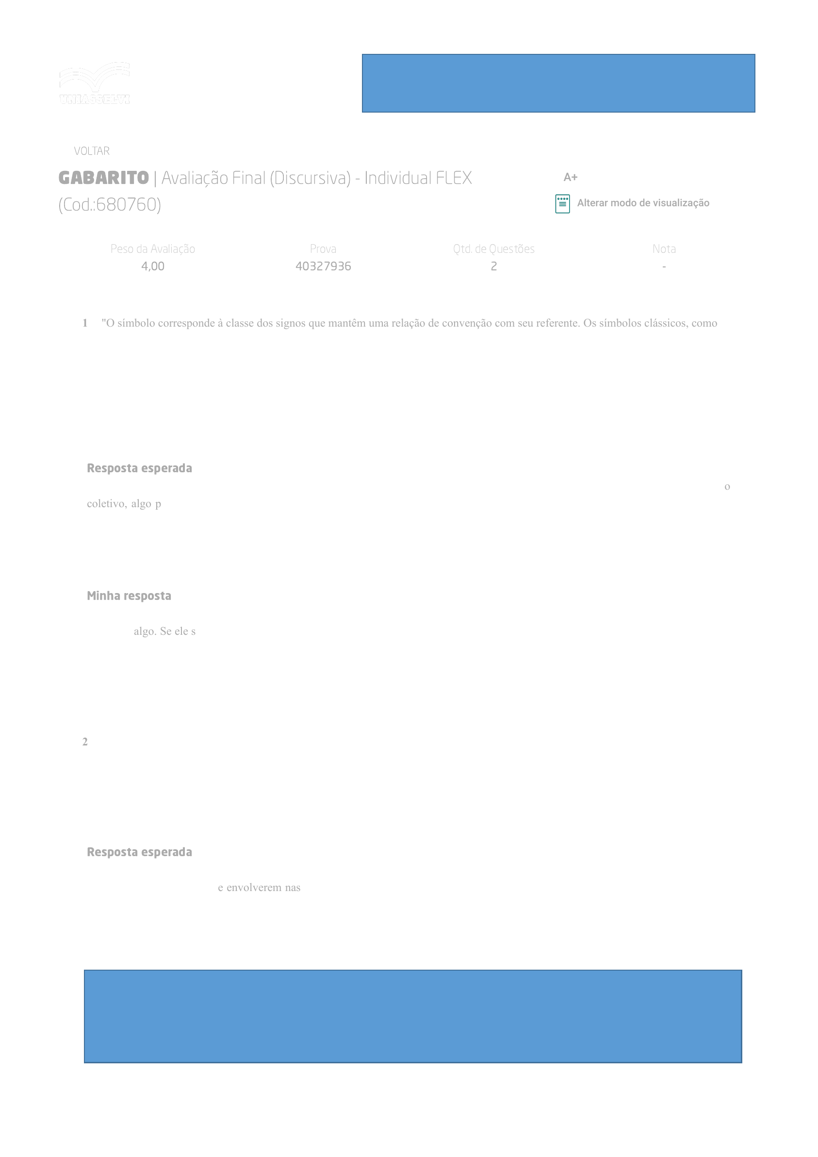 29/12/2021 09:49 AVA https://ava2.uniasselvi.com.br/subject/grades-and-tests/answer-book/eyJ0ZXN0Ijp7InRlc3RDb2RlIjoiNjgwNzYwIiwiZGVzY3JpcHRpb24iOiJBdmFsaWHDp8OjbyBGaW5hbCAoRGlzY3Vyc2l2YSkgLSBJbmRpdmlkdW… 1/1 GABARITO | Avaliação Final (Discursiva) - Individual FLEX (Cod.:680760) Peso da Avaliação 4,00 Prova 40327936 Qtd. de Questões 2 Nota - "O símbolo corresponde à classe dos signos que mantêm uma relação de convenção com seu referente. Os símbolos clássicos, como a bandeira para o país ou a pomba para a paz, entram nessa categoria junto com a linguagem, aqui considerada como um sistema de signos convencionais" (JOLY, 1996, p. 36). Ao falarmos em signos, recorremos à Semiótica. A partir dela, poderemos realizar algumas reflexões. Uma delas: o que seria a característica "convencional" (pacto coletivo) de um símbolo? Disserte sobre a característica convencional de um símbolo - forma de abordagem em sala de aula. FONTE: JOLY, M. Introdução à análise da imagem. Campinas, SP: Papirus, 1996. Resposta esperada O símbolo precisa precisa ser coletivo. Deve existir um grupo que o reconheça, que compreenda e o aceite. A partir desse acordo coletivo, algo passa a significar. Se ele precisa ser convencional, não há como um só sujeito decidir utilizar sozinho o símbolo. Dessa maneira, ninguém o entenderia. A sala de aula pode utilizar o símbolo, observando se todos reconhecem os sentidos. Da mesma forma, pode construir símbolos com regras das salas de aula. Minha resposta O símbolo deve ser coletivo. Deve existir um grupo que o reconheça, o compreenda e o aceite. A partir desse acordo coletivo, passa a significar algo. Se ele ser convencional, não há como apenas um sujeito decidir e utiliza lo sozinho. Dessa maneira, ninguém entenderia o símbolo. Na sala de aula podemos utilizar o símbolo, observando se todos reconhecem os sentido.s. Da mesma forma, pode construir símbolos com as regras da sala de aula. Há autores de outras áreas que contribuem com a área da Educação. Um deles é Foucault. "Um único e mesmo indivíduo pode ocupar [...] diferentes posições e assumir o papel de diferentes sujeitos" (FOUCAULT, 2002, p. 107). A partir dessa compreensão do autor, disserte sobre o mundo acelerado, as formas de ser e estar no mundo: a constante mudança dos sujeitos, impelidos a se moverem. FONTE: FOUCAULT, M. A arqueologia do saber. Rio de Janeiro: Forense, 2002. Resposta esperada Na presente época, os sujeitos são impelidos a se moverem, a estarem em constante modificação de si mesmos. Nessa sociedade, há a necessidade de os sujeitos se envolverem nas variadas práticas sociais. Elas podem envolver fala (oralidade), leitura (textos verbais, não verbais e híbridos) e também a escrita (dos mais variados gêneros existentes). Dessa forma, os sujeitos adquirem mais flexibilidade em sociedade na participação dos sujeitos nessas práticas existentes. De acordo com cada contexto e situação, várias posições são assumidas. Minha resposta O caráter dos sujeitos do tempo atual é este: flexível, acelerados nos movimentos sociais e subjetivos, movidos pelas mídias e redes sociais que autalizam-se e em pouco tempo serão substituídas por novas e mais excêntricas. Os sujeitos são impelidos a seguirem este mesmo movimento atualizando se para não ser tornarem obsoletos, na forma de ser e agir, estamos inseridos e fazemos parte dessa sociedade acelerada. VOLTAR A+ Alterar modo de visualização 1 2 Paulo Carlos de Guadalupe Formação Pedagógica em Letras-Português (2941422) 0