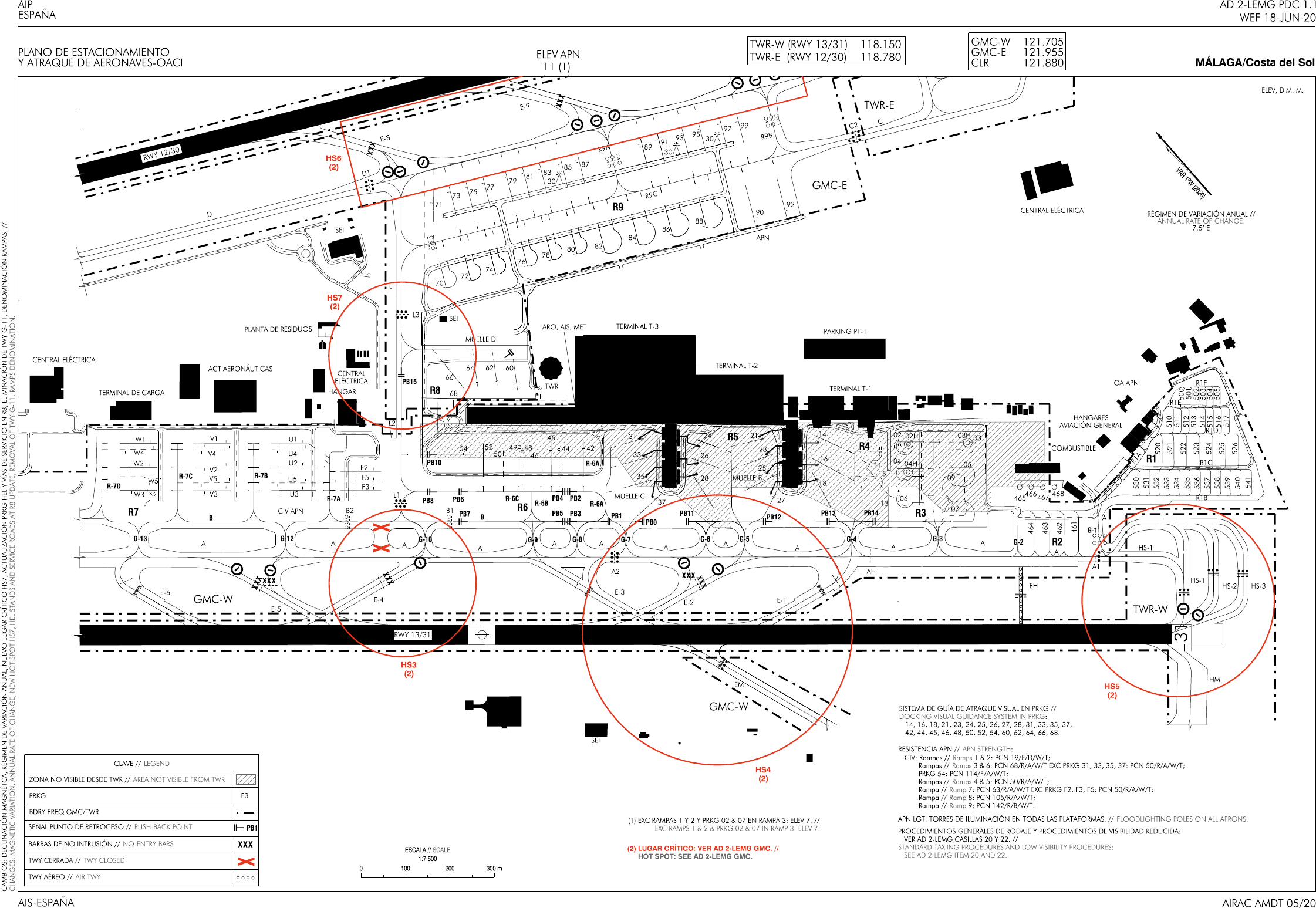 CENTRAL ELÉCTRICA TERMINAL DE CARGA ACT AERONÁUTICAS HANGAR PLANTA DE RESIDUOS MUELLE D MUELLE C TWR TERMINAL T-3 TERMINAL T-2 MUELLE B COMBUSTIBLE AIS, MET SEI ELÉCTRICA CENTRAL AVIACIÓN GENERAL HANGARES TERMINAL T-1 PARKING PT-1 CENTRAL ELÉCTRICA SEI SEI APN ARO, AIS, MET 30 30 30 G-1 G-2G-10 G-9 G-3G-4G-8 G-5G-7 G-6G-12G-13 31 14 16 18 21 23 25 27 24 26 28 33 35 37 F2 F3 W4 W3 W2 W1 U5 U3 U2 U1 11 15 05 07 06 4244 45 46 4849 50 5254 60 V5 V4 V3 V2 V1 F5 W5 HS-1 HS-2 HS-3 HS-1 A A A AA E-2 E-3 A A AA A E-4 E-5 E-6 E-8 E-9 E-10 L EM A1 HM X X X D1 X X X C2 R9A R9B R9C L3 L1 B2 B1 A2 AH E-1 L2 04 03 09 13 U4 EH A A A AIP ESPAÑA PLANO DE ESTACIONAMIENTO Y ATRAQUE DE AERONAVES-OACI AIS-ESPAÑA 0 300 m200100 AD 2-LEMG PDC 1.1 ELEV MÁLAGA/Costa del Sol 11 (1) ELEV, DIM: M. APN AIRAC AMDT 05/20 118.150 GMC-E GMC-W CLR TWR-W (RWY 13/31) TWR-E (RWY 12/30) 118.780 121.705 121.955 121.880 VER AD 2-LEMG CASILLAS 20 Y 22. // PROCEDIMIENTOS GENERALES DE RODAJE Y PROCEDIMIENTOS DE VISIBILIDAD REDUCIDA: SEE AD 2-LEMG ITEM 20 AND 22. STANDARD TAXIING PROCEDURES AND LOW VISIBILITY PROCEDURES: WEF 18-JUN-20 VAR 1ºW (2020) ANNUAL RATE OF CHANGE 7.5' E : RÉGIMEN DE VARIACIÓN ANUAL // DOCKING VISUAL GUIDANCE SYSTEM IN PRKG 42, 44, 45, 46, 48, 50, 52, 54, 60, 62, 64, 66, 68. 14, 16, 18, 21, 23, 24, 25, 26, 27, 28, 31, 33, 35, 37, : SISTEMA DE GUÍA DE ATRAQUE VISUAL EN PRKG // APN STRENGTH:RESISTENCIA APN // Ramp Ramp Ramp Ramps Ramps Ramps 9: PCN 142/R/B/W/T. Rampa // 8: PCN 105/R/A/W/T; Rampa // 7: PCN 63/R/A/W/T EXC PRKG F2, F3, F5: PCN 50/R/A/W/T; Rampa // 4 & 5: PCN 50/R/A/W/T; Rampas // PRKG 54: PCN 114/F/A/W/T; 3 & 6: PCN 68/R/A/W/T EXC PRKG 31, 33, 35, 37: PCN 50/R/A/W/T; Rampas // 1 & 2: PCN 19/F/D/W/T;CIV: Rampas // FLOODLIGHTING POLES ON ALL APRONS.APN LGT: TORRES DE ILUMINACIÓN EN TODAS LAS PLATAFORMAS. // (1) EXC RAMPAS 1 Y 2 Y PRKG 02 & 07 EN RAMPA 3: ELEV 7. // EXC RAMPS 1 & 2 & PRKG 02 & 07 IN RAMP 3: ELEV 7. SCALE 1:7 500 ESCALA // F3 CLAVE // LEGEND PRKG BDRY FREQ GMC/TWR ZONA NO VISIBLE DESDE TWR // AREA NOT VISIBLE FROM TWR SEÑAL PUNTO DE RETROCESO // PUSH-BACK POINT BARRAS DE NO INTRUSIÓN // NO-ENTRY BARS TWY CERRADA // TWY CLOSED TWY AÉREO // AIR TWY C A M B IO S : D E C LI N A C IÓ N M A G N É T C A , R É G IM E N D E V A R IA C IÓ N A N U A L, N U E V O L U G A R C R ÍT IC O H S 7 , A C T U A LI Z A C IÓ N P R K G H E L Y V ÍA S D E S E R V IC IO E N R 8 , E LI M IN A C IÓ N D E T W Y G -1 1 , D E N O M IN A C IÓ N R A M P A S . // C H A N G E S : M A G N E T IC V A R IA T IO N , A N N U A L R A T E O F C H A N G E , N E W H O T S P O T H S 7 , H E L S T A N D S A N D S E R V IC E R O A D S A T R 8 U P D A T E , R E M O V A L O F T W Y G -1 1 , R A M P S D E N O M IN A T IO N . 3 1 A319 A319 4 6 3 4 6 2 4 6 1 R1 A R1B R1C R1D R1E R1F 5 3 0 5 3 1 5 3 2 5 3 3 5 3 4 5 3 5 5 3 6 5 3 7 5 3 8 5 3 9 5 4 0 5 4 1 5 2 0 5 1 0 5 0 0 5 2 1 5 2 2 5 2 3 5 2 4 5 2 5 5 2 6 5 1 1 5 1 2 5 1 3 5 1 4 5 1 5 5 1 6 5 1 7 5 0 1 5 0 2 5 0 3 5 0 4 5 0 5 RWY 13/31 RWY 12/ 30 XXX X X X 468 467 466 465 TWR-E GMC-E GMC-W TWR-W GMC-W 6264 66 68 70 72 74 76 78 80 82 84 86 88 90 92 99 97 95 93 91 89 8785 83 81 79 77 75 73 71 X X X XXX XX X 4 6 4 XXX C D 02 03H02H 04H LUGAR CRÍTICO: VER AD 2-LEMG GMC. // HOT SPOT: SEE AD 2-LEMG GMC. (2) HS3 (2) HS4 (2) HS5 (2) HS6 (2) HS7 X X X (2) B PB10 PB6 PB7 PB4 PB5 PB1 PB2 PB3 B R8 R7 R6 R5 R4 R2 R1 PB14 PB8 R9 PB0 PB11 PB12 PB13 PB15 GA APN CIV APN R-6A R-6A R-6B R-6CR-7A R-7BR-7C R-7D R3 PB1 INT EN CIO NA DA ME NT E EN B LA NC O INT EN TIO NA LLY B LA NK AIS-ESPAÑA AIRAC AMDT 05/20 AIP AD 2-LEMG PDC 1.3 ESPAÑA WEF 18-JUN-20 CARACTERÍSTICAS DE LOS PUESTOS DE ESTACIONAMIENTO AIRCRAFT STANDS CHARACTERISTICS 02 R3 36º40ˊ20.04˝N 004º29ˊ17.05˝W A A321 – (2) (3) (4) 02H R3 36°40´19.59˝N 004°29´16.81˝W A 25 m INCOMP. 02. Uso exclusivo HEL // Exclusive HEL use 03 R3 36º40ˊ16.41˝N 004º29ˊ11.96˝W A A321 – INCOMP. 01 (2) (4) 03H R3 36°40´16.76˝N 004°29´12.53˝W A 25 m INCOMP. 03. Uso exclusivo HEL // Exclusive HEL use 04 R3 36º40ˊ18.59˝N 004º29ˊ18.65˝W A A321 – (2) (3) (4) 04H R3 36°40´18.12˝N 004°29´18.56˝W A 27 m INCOMP. 04. Uso exclusivo HEL // Exclusive HEL use 05 R3 36º40ˊ14.91˝N 004º29ˊ15.78˝W A B763 – INCOMP. 09 (4) 06 R3 36º40ˊ17.13˝N 004º29ˊ20.25˝W A A321 – INCOMP. 15 (3) (4) 07 R3 36º40ˊ14.08˝N 004º29ˊ16.93˝W A B764 – INCOMP. 09 (4) 09 R3 36º40ˊ15.57˝N 004º29ˊ15.05˝W A B744 – INCOMP. 05, 07 (4) 11 R4 36°40ˊ20.32˝N 004°29ˊ20.11˝W A B38M – (4) 13 R4 36°40ˊ17.77˝N 004°29ˊ20.69˝W A A321 – INCOMP. 15 (2) (4) 14 R4 36°40ˊ24.00˝N 004°29ˊ22.00˝W R B753 NW/SE 400 Hz - A/C (1) (5) (6) 15 R4 36º40ˊ19.31˝N 004º29ˊ20.81˝W A B764 – INCOMP. 06, 13 (4) 16 R4 36º40ˊ22.93˝N 004º29ˊ23.76˝W R B753 NW/SE 400 Hz - A/C (1) (5) (6) 18 R4 36º40ˊ22.16˝N 004º29ˊ24.88˝W R B744 NW/SE 400 Hz - A/C (5) (6) MAX ACFT LEN 75.36 m 21 R5 36°40ˊ26.89˝N 004°29ˊ26.19˝W R A321 NW/SE 400 Hz - A/C (2) (5) (7) 23 R5 36°40ˊ25.68˝N 004°29ˊ26.82˝W R B752 NW/SE 400 Hz - A/C (1) (5) (8) 24 R5 36°40ˊ29.83˝N 004°29ˊ30.50˝W R A321 SE 400 Hz - A/C (2) (5) (9) 25 R5 36°40ˊ24.29˝N 004°29ˊ27.63˝W R B763 NW/SE 400 Hz - A/C (1) (5) (10) 26 R5 36°40ˊ28.99˝N 004°29ˊ31.92˝W R B753 SE 400 Hz - A/C (1) (5) (11) 27 R5 36°40ˊ23.20˝N 004°29ˊ28.62˝W R B744 SE 400 Hz - A/C (5) (12) MAX ACFT LEN 73.86 m 28 R5 36°40ˊ27.99˝N 004°29ˊ33.05˝W R B77L SE 400 Hz - A/C (5) (12) 31 R6 36°40ˊ32.81˝N 004°29ˊ34.51˝W R A321 SE 400 Hz - A/C (2) (5) (13) 33 R6 36°40ˊ31.45˝N 004°29ˊ35.08˝W R B753 SE 400 Hz - A/C (1) (5) (13) 35 R6 36°40ˊ30.09˝N 004°29ˊ36.39˝W R B763 SE 400 Hz - A/C (5) (13) 37 R6 36°40ˊ28.74˝N 004°29ˊ36.83˝W R B744 SE 400 Hz - A/C (5) (14) MAX ACFT LEN 75.36 m 42 R6 36°40ˊ35.19˝N 004°29ˊ38.67˝W R B764 SE 400 Hz - A/C (5) (15) 44 R6 36°40ˊ36.27˝N 004°29ˊ40.15˝W R B739 NW 400 Hz - A/C (1) INCOMP. 45 (5) (16) 45 R6 36°40ˊ36.75˝N 