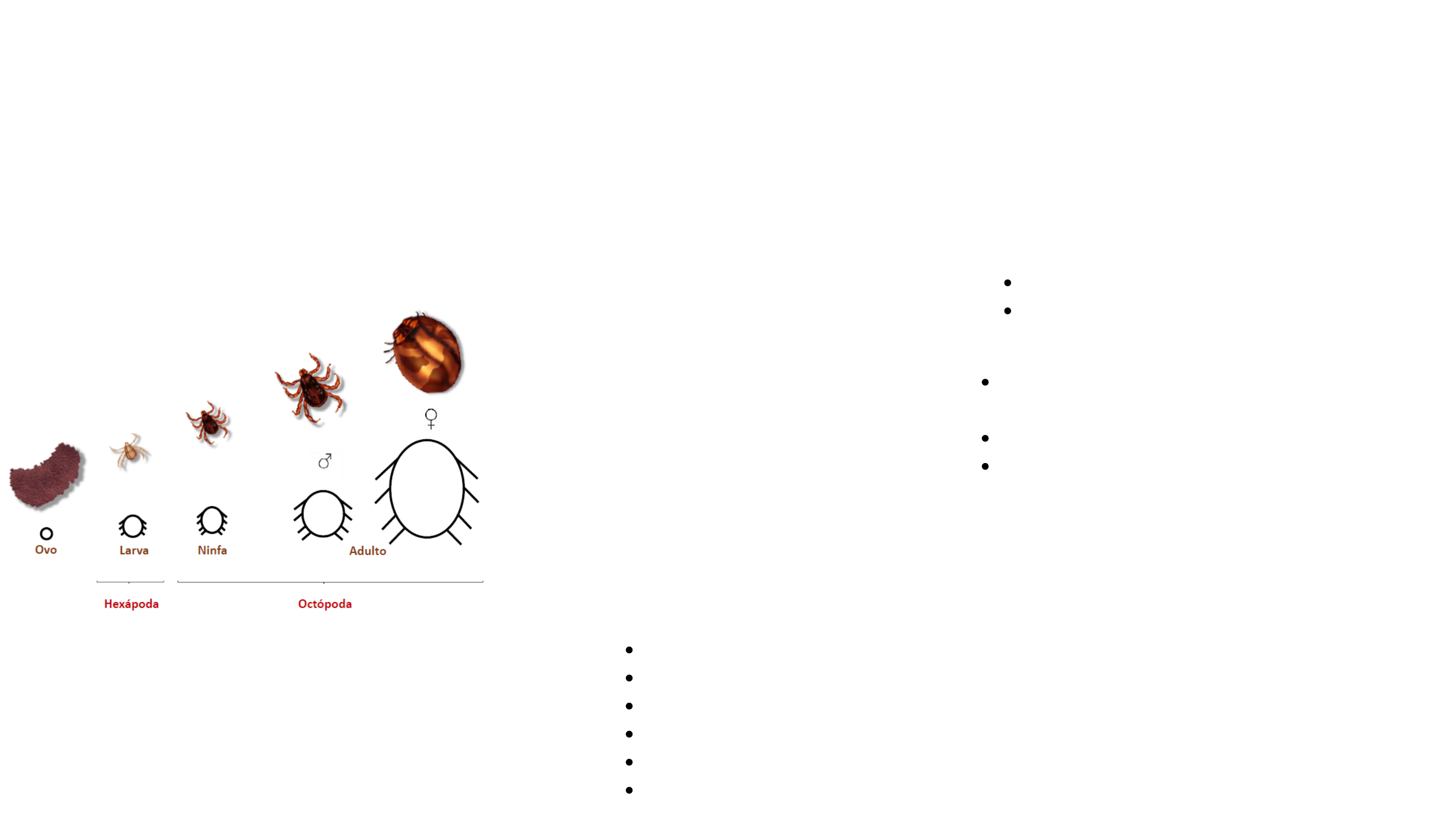 Reino Animalia Filo Arthropoda Subfilo Chelicerata Classe Arachnida Subclasse Acari Superordem Parasitiformes Ordem Ixodida Família Ixodidae Família Argasidae carrapatos Família Ixodidae Carrapatos duros (escudo dorsal) Estágios evolutivos Fêmeas ficam maiores quando alimentadas (ingurgitadas) Generalidades Ectoparasitas obrigatórios; Parasitam diferentes hospedeiros Alta concentração de hospedeiros (CO 2 liberado na respiração); Umidade relativa do ar (alta); Temperatura favorável (tropical e temperado) Habitat favorável Importância geral Parasitismo danos diretos e indiretos aos animais;; Anemia , irritação e hipersensibilidade; Redução de produtividade (carne e leite); Lesões no couro; Predisposição a miíases secundárias; Vetoração de agentes patogênicos 3 pares de patas 4 pares de patas ninfas e adultos (estigmática) carrapatos Família Ixodidae Carrapatos duros (escudo dorsal) escudo dorsal ⅓ corpo - Larvas Dorso completo - Macho Ninfas Fêmeas não alimentadas Gnatossoma Extremidade anterior do corpo Estigma respiratório Após pata IV (Mesostigmata) respiração larvas (percutânea) Gêneros presentes no Brasil Amblyomma sp. Rhipicephalus sp. Dermacentor sp. carrapatos Família Ixodidae Carrapatos duros (escudo dorsal) morfologia geral gnatossoma (sustentação) (fixação e sucção) (laceração) (sensitivo) idiossoma carrapatos Família Ixodidae Carrapatos duros (escudo dorsal) Alimentação Hematofagismo (lento) Laceração da pele pelas quelíceras Introdução e fixação do hipostômio Inoculação da saliva (substâncias anticoagulantes e anestésicas) Sucção do sangue Remoção Uso de pinça (preconizado) ou girando o aparelho bucal; NUNCA comprimir/estourar os espécimes (risco de contato com patógenos) Retirar SEMPRE o aparelho bucal completo (vestígios de aparelho bucal podem induzir à inflamação e irritação) Reprodução Dimorfismo sexual nítido (adultos - fêmea é maior) Realizam a cópula no hospedeiro Postura única após ingurgitamento (colocam muitos ovos) Após postura as fêmeas morrem Não têm órgão reprodutor carrapatos Família Ixodidae Carrapatos duros (escudo dorsal) ciclo reprodutivo MONOXENO 1 hospedeiro (saem apenas para postura dos ovos) 2 ou 3 hospedeiros (faz a ecdise no ambiente e depois volta pro hospedeiro) HETEROXENO Rhipicephalus microplus Dermacentor nitens Amblyomma spp. Rhipicephalus sanguineus Rhipicephalus microplus macho Base do capítulo hexagonal Palpos curtos Cone opistossomal 2 pares de placas adanais fêmea Corpo ovalado Escudo dorsal reduzido Parasita preferencialmente bovinos; Podem produzir de três a quatro gerações por ano locais de predileçãogeneralidades Base da cauda; Barbela; Peito; Posterior das coxas Ciclo biológico Monoxeno; Postura total com cerca de 3000 a 4000 ovos (aglutinados); Fase Parasitária - em torno de 21 dias; sobem no ápice do capim nas horas mas frescas do dia (mais fácil acessar hospedeir0) - geotropismo negativoImportância Médico Veterinária Danos ao couro; Alta infestação (redução na produção); Estresse, anemia e até morte; Transmissão dos agentes da Tristeza Parasitária Bovina Peritrema em forma de vírgula Rhipicephalus sanguineus macho Base do capítulo hexagonal Palpos curtos 1 par de placas adanais generalidades Parasita principalmente cão e gatos domésticos; Mais encontrado próximo ao coxim palmar e orelhas Ciclo biológico Trioxeno; Fase Parasitária - curta; Fase não Parasitária - mudança de estágio no ambiente; Postura total com cerca de 2000 a 3000 ovos (aglutinados); Geotropismo negativo (encontrados em muros e frestas) Importância em Medicina Veterinária Anemias; Transmissão de hemoparasitas; Grande importância para animais domiciliados Dermacentor nitens macho generalidades Parasita preferencialmente equinos, muares e asininos; Encontrado em pavilhão auricular, divertículo nasal, crina e base da cauda Ciclo biológico Monoxeno; Fase Parasitária - em torno de 28 dias; Postura total com cerca de 3400 ovos (aglutinados) Importância em Medicina Veterinária Causa ferimentos na pele e predispõe a infecções secundárias, miíases e até perda da orelha; Transmissão de patógenos Base capítulo retangular Palpos robustos Peritremas circulares (dial de telefone) Não tem placas adanais fêmea "Acinturada" Festões Amblyomma spp. macho generalidades Parasita a maioria dos animais domésticos (equinos, bovinos e HOMEM) além de animais silvestres; BAIXA ESPECIFICIDADE PARASITÁRIA; Picada dolorida por conta do aparelho bucal longo Ciclo biológico Trioxeno; Ciclo completo - aproximadamente 1 ano; Postura total com cerca de 6000 a 8000 ovos (aglutinados) Importância em Medicina Veterinária Transmissão de patógenos, como: Babesiose Equina, Piroplasmose Equina, Borreliose de Lyme, Febre Maculosa, Febre Q Base capítulo retangular Hipóstomos e palpos longos Escudo ornamentado fêmea Peritrema com forma de vírgula Escudo ornamentado e reduzido Família Argasidae Morfologia Tegumento coriáceo, rugoso e granuloso Gnatossoma ventral (identificação da família) Carrapatos moles (sem escudo dorsal) generalidades Vivem em ninhos e tocas dos hospedeiros (habitat associado ao homem) alimentação Larvas: permanecem fixadas no hospedeiro; Ninfa e adultos: alimentação rápida (20 60 min) Reprodução Dimorfismo sexual não acentuado; Realizam a cópula no ambiente; Postura parcionada em função do ingurgitamento (ovos em pequenas quantidades) Espiráculo respiratório após coxa 3; Borda reticulada(dorso- ventral) - grânulos; Capítulo ventral Argas miniatus Morfologia generalidades Parasitam principalmente galinhas em criação doméstica com precárias medidas sanitárias; Hábitos noturnos (líquido coxal após alimentação) - pode carregar patógenos; importância veterinária Anemia e morte de aves jovens (perda da produtividade) Ciclo biológico Heteroxeno; Ciclo de aproximadamente 2 meses; Podem apresentar de 2 a 4 í