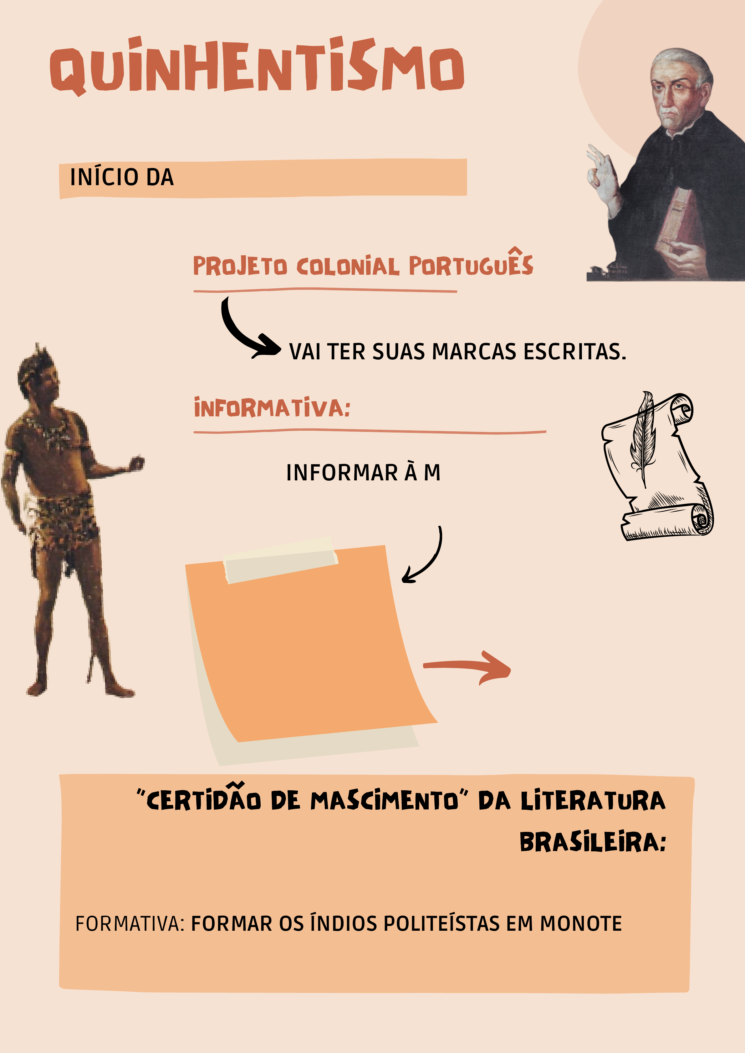 PROJETO COLONIAL PORTUGUÊS INFORMATIVA: VAI TER SUAS MARCAS ESCRITAS. QUINHENTISMO INÍCIO DAS PRODUÇÕES NO BRASIL. CARTAS: INFORMAR À METRÓPOLE O QUE ERA FEITO NA COLÔNIA. COLÔNI A: VISÕE S DO PARA ÍSO. FAUNA, FLORA , ÍNDIOS . CENÁRIO TROPICAL. “CERTIDÃO DE MASCIMENTO” DA LITERATURA BRASILEIRA: CARTA DE PERO VAZ DE CAMINHA (01 DE MAIO DE 1500). FORMATIVA: FORMAR OS ÍNDIOS POLITEÍSTAS EM MONOTEÍSTA, SENDO ASSIM, VINCULADOS A RELIGIÃO CATÓLICA. (1500-1600) LITERATURA JESUÍTICA. MISSÕES CONTRARREFORMISTAS. CIA DE JESUS. PADRE JOSÉ DE ANCHIETA. POEMAS. DRAMATIZAÇÕES. ENTÃO: O PADRE CRIAVA NOS ÍNDIOS UMA PERSPECTIVA DE FORMAÇÃO CATÓLICA. OBS: O QUINHENTISMO NÃO É UMA ESCOLA LITERÁRIA, MAS SIM UM MOMENTO QUE FAZ DO MARCO DE INÍCIO DA PRODUÇÃO LITERÁRIA SOBRE O BRASIL. DESCOBRIMENTO DO BRASIL