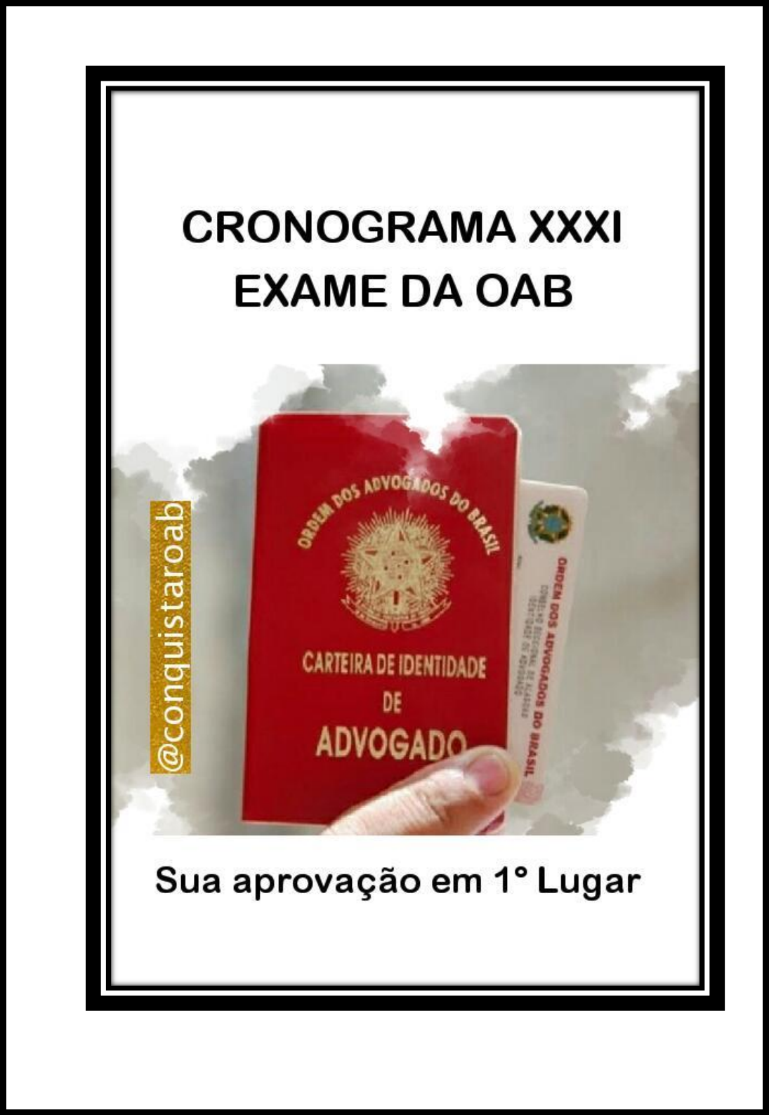 @CONQUISTAROAB 2 SOBRE O CRONOGRAMA O Cronograma @ConquistarOAB surgiu com o intuito de auxiliar estudantes na busca pela aprovação no exame da ordem. Meu nome é Priscila Viviane Gradisse, tenho 26 anos, sou advogada e realizei o exame da ordem quanto ainda cursava o 9° periodo do curso de direito, e obtive a aprovação na primeira tentativa. Apesar de não ter passado pela reprovação, não digo que foi fácil, foi necessario uma organização dos estudos e principalmente manter a confiança. Com o cronograma @ConquistarOAB, você terá a oportunidade de organizar seus estudos e estudar materias importantes que realmente são cobradas no exame. O estudo é baseado na minha preparação para o exame, com esse metodo de estudos me senti preparada, e espero que possa lhe garantir a mesma sensação de dever cumprido quando meu nome constava na lista dos aprovados. @CONQUISTAROAB 3 Observações ✓ O valor cobrado pelo cronograma é simbólico e inferior a outros materiais similares! Pedimos que NÃO COMPARTILHE o material! Para que possamos continuar desenvolvendo mais conteúdos como esse e ajudar cada vez um número maior de pessoas na busca pelo seu sonho é fundamental a contribuição simbólica de quem adquirir esse material. ✓ Dúvidas, comentários e sugestões podem ser enviados através do e-mail de contato consquistaroab@gmail.com ou através do nosso Instagram: @consquistaroabdeprimeira Se você quer conquistar um sonho, não pare até alcança-lo. Não importa quantas vezes você tentou, e sim a certeza de que nunca irá desistir. @CONQUISTAROAB 4 Sumário 1- Como funciona o Planejamento de estudos_________________pág.5 2- Ambiente de estudo_____________________________________pág.6 3- Calendário do XXXI Exame_______________________________pág.7 4- Disciplinas cobradas na 1ª Etapa _________________________ pág.8 5- Ciclo de estudos________________________________________pág.9 6- Matérias cobradas no exame: Divisão por disciplina__________pág.12 7- Cronograma ___________________________________________pág.17 8- Acompanhamento Semanal de Rendimento_________________pág.40 9-Como funciona a 1º etapa da OAB__________________________pág.42 10- Posição das questões na prova__________________________pág. 44 11- Dicas ________________________________________________pág.45 12- Assuntos mais cobrados no Exame_______________________pág.59 13- Alteração Legislativa Regulamento OAB___________________pág.62 @CONQUISTAROAB 5 1- Como funciona o Planejamento de estudos: O planejamento dos estudos consiste em definir a rotina a ser seguida, esse cronograma se fundamenta em: Teoria, Legislação e resolução de questões. Criar uma rotina é essencial para o melhor desempenho dos estudos, portanto, você deve ter o cronograma como um aliado para conquistar sua aprovação. Veja o gráfico abaixo: Essa rotina é diária, você deve compreender que em seu tempo disponível de estudo será necessário que se faça essa divisão. Nem todos possuem 12, 13 ou 15 horas de estudos para se dedicar, mas isso não se será um problema se você tiver em mente que o tempo que tiver será utilizado com eficiência. O bom estudo, focado, concentrado e sem distrações rende o que é necessário. Se você tratar seu estudo como trabalho, o resultado será satisfatório, cumpra corretamente o horário que você definiu para estudar, e cumpra todas as etapas, trata-se de um ciclo que não deve ser interrompido. 40% 30% 30% Rotina de Estudos Resolução de questões Teoria Legislação @CONQUISTAROAB 6 2- Como deve ser o ambiente de estudo? O ambiente de estudos é fundamental, você deve reservar um ambiente 3- tranquilo e confortável, se possível sem ruídos, enfim um local que você e todos saibam que no momento em estiver lá precisa de se concentrar e não ser interrompido. Um ambiente organizado é favorável aos estudos é muito importante para garantir motivação e bom aproveitamento do tempo. Deixe o celular longe desse local de estudos, o celular é a melhor ferramenta de distração, portanto mantenha-o longe. O uso do celular no momento dos estudos vai dispersar sua atenção para coisas que não irá acrescentar em seus estudos. Vamos fazer um acordo: AO ESTUDAR, PROIBIDO CELULAR. CERTO?! @CONQUISTAROAB 7 3- Calendário do XXXI Exame: 4- Disciplinas cobradas na 1ª Etapa: @CONQUISTAROAB 8 Observe que a disciplina de ética profissional garante a você 10% da pontuação, por isso é importante gabaritar ética, as matérias que caem apenas duas questões não devem ser menosprezadas, mas o tempo dedicado a elas pode ser menor do que as demais disciplinas. A divisão dos estudos abrange todas as matérias cobradas, claro que o Estudo de Ética exige mais tempo do que o de Filosofia, por exemplo, mas todas as 17 questões devem ser estudadas. 5- Ciclo de estudos: 10% 9% 6% 8% 9% 9%8% 8% 8% 6% 3% 6% 3% 3% 3% 3% 3% Numero de Questões Ética Profissional Direito Constitucional Direito Tributário Direito Administrativo Direito Civil Processo Civil Direito Penal Processo Penal Direito Do Trabalho Processo do Trabalho Direito Ambiental Empresarial Filosofia ECA CDC Direito Internacional Direitos Humanos @CONQUISTAROAB 9 Como colocar o ciclo de estudos em prática? O ciclo de estudos consiste em Estudo da Teoria, Legislação e Resolução de questões : FAÇA RESUMOS DE TODAS AS ETAPAS, anote o que achar necessário, de forma RESUMIDA, e utilize essas anotações para dar suporte em suas revisões. 5.1 Estudo da Teoria: Procure por materiais atualizados, e objetivos, não adianta a essa altura do campeonato você ler doutrinas extensas, ao longo do seu curso você já fez isso, agora é o momento de sintetizar todo o conteúdo de forma eficiente. Ao iniciar o primeiro ciclo, você inicia a leitura do material teórico (atualizado), caso esteja fazendo algum curso preparatório acompanhe o material juntamente com as aulas. Eu particularmente não fiz cursinho para a 1º eta
