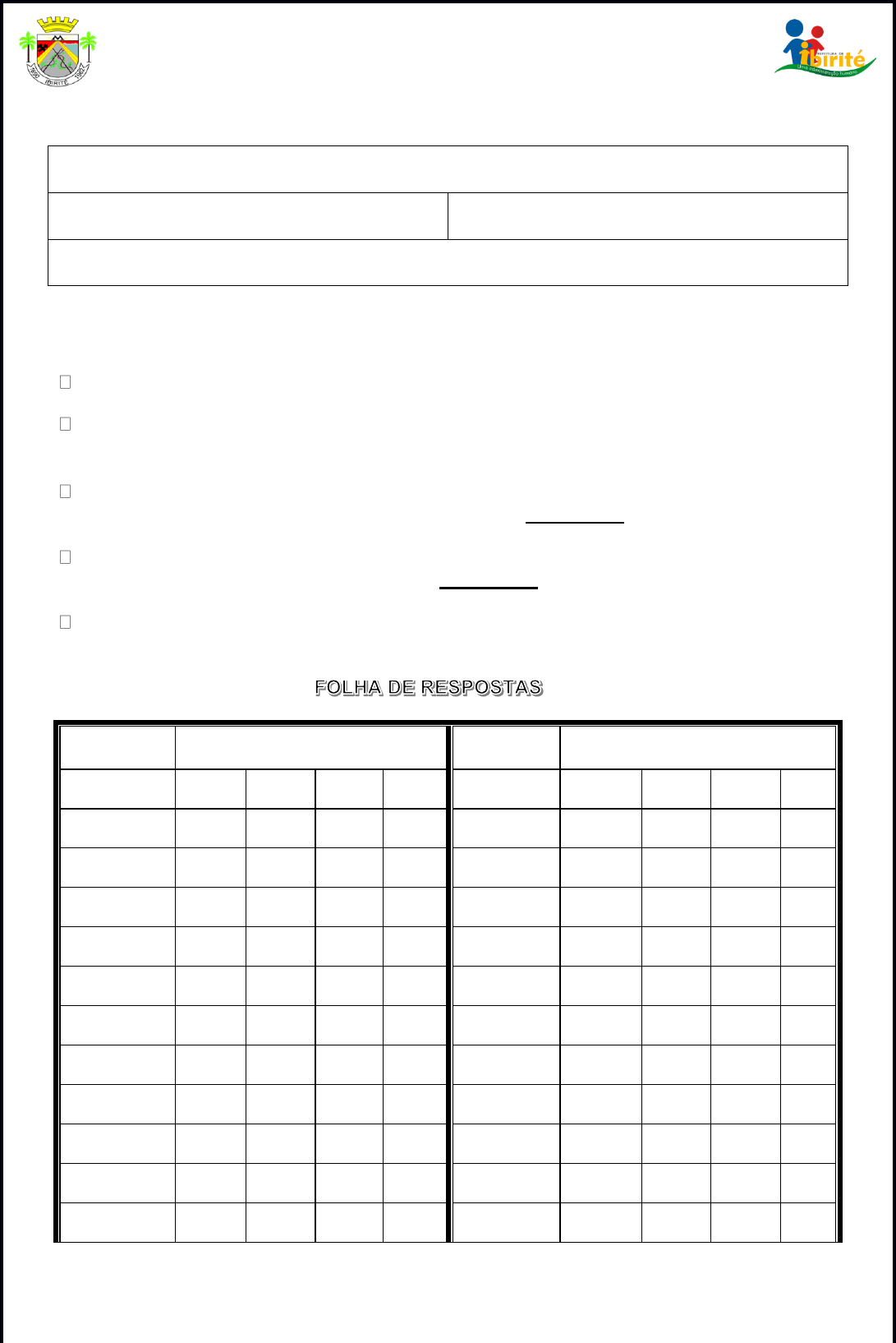 1 PREFEITURA MUNICIPAL DE IBIRITÉ SECRETARIA MUNICIPAL DE EDUCAÇÃO ATIVIDADE AVALIATIVA – 2º TRIMESTRE/2021 ESCOLA: ANO DE ESCOLARIDADE: 5ºANO DATA: ___/___/___ NOME COMPLETO: INSTRUÇÕES PARA O (A) ALUNO (A): Preencha seu nome completo no cabeçalho com atenção. Marque as alternativas corretas na FOLHA DE RESPOSTAS, no campo correspondente a cada questão com um X. A FOLHA DE RESPOSTAS é o único documento que será entregue pelo(a) aluno(a) na escola. Essa entregar deverá ocorrer até o dia 08/09/2021. A avaliação ficará com o(a) aluno(a) para posterior correção. O gabarito será disponibilizado pela escola e no site dia 15/09/2021. Não amasse, não dobre nem rasure a sua FOLHA DE RESPOSTAS. As marcações na FOLHA DE RESPOSTAS só podem ser feitas com caneta esferográfica de tinta preta e só ela. QUESTÕES ALTERNATIVAS QUESTÕES ALTERNATIVAS 01 A B C D 13 A B C D 02 A B C D 14 A B C D 03 A B C D 15 A B C D 04 A B C D 16 A B C D 05 A B C D 17 A B C D 06 A B C D 18 A B C D 07 A B C D 19 A B C D 08 A B C D 20 A B C D 09 A B C D 21 A B C D 10 A B C D 22 A B C D 11 A B C D 23 A B C D 12 A B C D 24 A B C D 2 LÍNGUA PORTUGUESA O garoto das meias vermelhas (Carlos Heitor Cony) Ele era um garoto triste. Procurava estudar muito. Na hora do recreio ficava afastado dos colegas, como se estivesse procurando alguma coisa. Todos os outros meninos zombavam dele, por causa das suas meias vermelhas. Um dia, o cercaram e lhe perguntaram porque ele só usava meias vermelhas. Ele falou, com simplicidade: " No ano passado, quando fiz aniversário, minha mãe me levou ao circo. Colocou em mim essas meias vermelhas. Eu reclamei. Comecei a chorar. Disse que todo mundo ia rir de mim, por causa das meias vermelhas. Mas ela disse que tinha um motivo muito forte para me colocar as meias vermelhas. Disse que se eu me perdesse, bastaria ela olhar para o chão e quando visse um menino de meias vermelhas, saberia que o filho era dela." "Ora", disseram os garotos, "mas você não está num circo. Por que não tira essas meias vermelhas e as joga fora?" O menino das meias vermelhas olhou para os próprios pés, talvez para disfarçar o olhar lacrimoso e explicou: "É que a minha mãe abandonou a nossa casa e foi embora. Por isso eu continuo usando essas meias vermelhas. Quando ela passar por mim, em qualquer lugar em que eu esteja, ela vai me encontrar e me levará com ela." 01. Qual é o tema do texto? ( A ) O garoto que continuava usando meias vermelhas na esperança da sua mãe lhe encontrar. ( B ) O garoto que gostava de meias vermelhas. ( C ) A implicância dos colegas de escola. ( D ) O garoto das meias vermelhas. 02. A frase: Por que não tira essas meias vermelhas e as joga fora? ( A ) Frase afirmativa ( B ) Frase exclamativa ( C ) Frase interrogativa ( D ) Frase imperativa 03. São grupos de palavras paroxítona: ( A ) chão, está, você. ( B ) levará, aniversário, filho. ( C ) próprios, pés, lugar. ( D ) aniversário, menino, colegas. 04. Na frase: Todos os outros meninos zombavam dele. Possui: ( A ) Artigo indefinido ( B ) Artigo definido ( C ) Artigos definido e indefinido ( D ) Nenhuma das alternativas 3 MATEMÁTICA 05. Observe o número: Uma das decomposições desse número é: (A) 8.000.000 + 200.000 + 30.000 + 4.000 + 600 + 80 + 6 (B) 8.000.000 + 20.000 + 3.000 + 4.000 + 600 + 80 + 6 (C) 8.000.000 + 200.000 + 30.000 + 40 + 60 + 80 + 6 (D) 8.000.000 + 200.000 + 30.000 + 4.000 + 6 + 8 + 6 _____________________________________________________________________________ 06.Qual é o quíntuplo do numeral ao lado? (A) 6.632.835 (B) 6.622.835 (C) 6.622.735 (D) 6.622.845 _____________________________________________________________________________ 07. Observe a figura geométrica abaixo: Essa figura é um? (A) pentágono (B) quadrado (C) hexágono (D) triângulo _____________________________________________________________________________ 08. Observe o polígono abaixo: Quantos lados e quantas vértices ele possui? (A) 5 lados e 6 vértices. (B) 6 lados e 6 vértices (C) 5 lados e 4 vértices (D) 5 lados e 5 vértices 8.234.686 1.324.567 4 Ciências 09. Observe a imagem ao lado. A ação que melhor representa o aproveitamento do lixo é: a) Economizar água. b) Realizar a coleta seletiva para reciclagem. c) Evitar o desperdício de energia elétrica. d) Fazer o plantio de novas mudas. CHICO BENTO – 364 10 DE JANEIRO DE 2016 / NEIAEJOAO 10.Observe o esquema do ciclo da água e indique o que significa, respectivamente, os números 1 e 2. a) Precipitação e transpiração. b) Infiltração e condensação. c) Precipitação e vaporização. d) Infiltração e sublimação. 11.Enumere a segunda coluna de acordo com a primeira sobre os tipos de solo: ( 1 ) Solo argiloso ( ) Apresenta grande quantidade de material em decomposição, é muito bom para a plantação. ( 2 ) Solo arenoso ( ) Deixa a água passar rapidamente. É seco e pode apresentar cores variadas. ( 3 ) Solo Humífero ( ) É muito utilizado para a fabricação de tijolos, pois contém partículas de rochas no solo. Muito ruim para agricultura, pois é rica em cálcio. ( 4 ) Solo calcário ( ) Muito utilizado na produção de cerâmicas, consistência fina e impermeável a água. É uma terra fofa e macia. Marque a sequência numérica que você registrou acima: a) 1,2,3,4 b) 3,4,2,1 c) 4,2,3,1 d) 3,2,4,1 https://scanqueninguemfez.wordpress.com/2016/01/10/cascao-364/ https://scanqueninguemfez.wordpress.com/author/neiaejoao/ https://www.google.com.br/url?sa=i&rct=j&q=&esrc=s&source=images&cd=&ved=0ahUKEwjfwd2ZgYDVAhXJlJAKHe5KAkcQjRwIBw&url=http://www.brunopinheiro.com.br/maju/urbanoxrural.htm&psig=AFQjCNFweShK2Mtvi3GVU1IKYMGnZqrKBw&ust=1499820577714189&cad=rjt 5 HISTÓRIA Observe o mapa: 12.O mapa acima mostra duas teorias que os historiadores estudaram sobre os possíveis caminhos que o homo Sapiens realizou para se chegar ao continente: a) Africano b) Europeu c) Americano d) Asiático 13. Sabe-se que os primeiros habitantes 