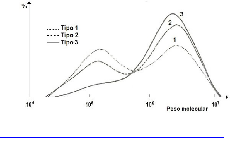 Peso Molecular nos Polímeros O peso molecular é um critério para determinar o tamanho da cadeia polimérica, dado que a maior peso molecular corresponde um maior tamanho da cadeia. Devido à natureza estatística que rege as reações de polimerização, o tamanho das cadeias não é o mesmo para todas elas. O peso molecular tem alguma importância nas propriedades mecânicas e propriedades térmicas e reológicas, mas também na afinidade que o polímero tem com solventes. Se o número de cadeias for comparado com o seu peso molecular e representado graficamente teremos uma curva conhecida como curva de distribuição de pesos moleculares. Essa curva vai depender de: · Tipo de catalisador; · Concentração de ; · Temperatura de reação; Figura 1- Curva de Distribuição de Pesos Moleculares https://www.ctborracha.com/borracha-sintese-historica/materias-primas/borrachas/borracha-natural/peso-molecular-e-distribuicao-do-peso-molecular-borracha-natural/ (imagem) Para os polímeros, o peso molecular é descrito como a massa molecular média das cadeias, podendo ser calculada de diversas formas: 1. Peso molecular médio em número (): Este processo de calculo do peso molecular muito simples, basta somar todas as moléculas poliméricas contidas numa amostra e dividir pelo número total de moléculas poliméricas dessa amostra. (1) 2. Peso molecular médio em peso (): Este processo de calculo do peso molecular baseia-se no facto que uma molécula maior contém maior massa total, logo tem mais maior peso molecular. Em comparação a uma molécula mais pequena. (2) 3. Polidispersão (IP): Quantifica a amplitude da curva de distribuição de pesos moleculares e representa o quociente entre o peso molecular médio em peso () e o peso molecular médio em número (). Figura 2- Como Calcular o Peso Molecular por Polidispersão http://www.petrocuyo.com/br/tecnologia/polipropileno/pesos-moleculares (imagem) http://www.petrocuyo.com/br/tecnologia/polipropileno/pesos-moleculares (site) PP do professor
