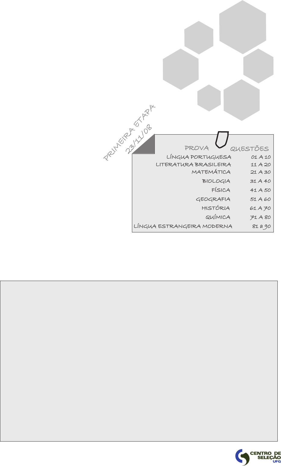 UNIVERSIDADEFEDERALDEGOIÁS PRÓ-REITORIADEGRADUAÇÃO CENTRODESELEÇÃO UFG TIPO 1 SÓ ABRA QUANDO AUTORIZADO LEIA ATENTAMENTE ASINSTRUÇÕES 1. Quando for permitido abrir o caderno, verifique se ele está completo ou se apresenta imperfeições gráficas que possam gerar dúvidas. Em seguida, verifique se ele contém 90 questões. 2. Cada questão apresenta cinco alternativas de resposta, das quais apenas uma é a correta. Preencha no cartão-resposta a letra correspondente à resposta assinalada na prova. 3. O cartão-resposta será distribuido às 16 horas. Ele é personalizado e não haverá substituição, em caso de erro. Ao recebê-lo, verifique se seus dados estão impressos corretamente; se for constatado algum erro, notifique ao aplicador de prova. 4. As provas terão a duração de cinco horas, já incluídas nesse tempo a marcação do cartão-resposta e a coleta da impressão digital. 5. A tabela periódica dos elementos químicos está disponível, para consulta, na segunda- capa deste caderno. 6. Você só poderá se retirar definitivamente da sala e do prédio a partir das 17h30min. 2 9 1 00 - P r o c e s s o S e le ti v o PR IM EI R A ET A PA 23 /1 1/ 08 LÍNGUAPORTUGUESA01A10 LITERATURABRASILEIRA11A20 MATEMÁTICA21A30 BIOLOGIA31A40 FÍSICA41A50 GEOGRAFIA51A60 HISTÓRIA61A70 QUÍMICA71A80 LÍNGUAESTRANGEIRAMODERNA81a90 PROVA QUESTÕES C LA SS IF IC A Ç Ã O P ER IÓ D IC A D O S EL EM EN TO S (c om m as sa s a tô m ic as re fe rid as a o is ót op o 12 d o ca rb on o) 1 18 1 2 1 H H e 1, 00 8 4, 00 3 4 5 6 7 8 9 10 2 L i B e B C N O F N e 6, 94 9, 01 10 ,8 12 ,0 14 ,0 16 ,0 19 ,0 20 ,2 11 12 13 14 15 16 17 18 3 N a M g A l Si P S C l A r 23 ,0 24 ,3 27 ,0 28 ,1 31 ,0 32 ,1 35 ,5 39 ,9 19 20 21 22 23 24 25 26 27 28 29 30 31 32 33 34 35 36 4 K C a Sc T i V C r M n Fe C o N i C u Zn G a G e A s Se B r K r 39 ,1 40 ,1 44 ,9 47 ,9 50 ,9 52 ,0 54 ,9 55 ,8 58 ,9 58 ,7 63 ,5 65 ,4 69 ,7 72 ,6 74 ,9 78 ,9 79 ,9 83 ,8 37 38 39 40 41 42 43 44 45 46 47 48 49 50 51 52 53 54 5 R b Sr Y Zr N b M o T c R u R h Pd A g C d In Sn Sb T e I X e 85 ,5 87 ,6 88 ,9 91 ,2 92 ,9 95 ,9 98 ,9 10 1, 1 10 2, 9 10 6, 4 10 7, 9 11 2, 4 11 4, 8 11 8, 7 12 1, 8 12 7, 6 12 6, 9 13 1, 3 55 56 57 - 71 72 73 74 75 76 77 78 79 80 81 82 83 84 85 86 6 C s B a Sé rie d os La nt an íd io s H f T a W R e O s Ir Pt A u H g T l Pb B i Po A t R n 13 2, 9 13 7, 3 17 8, 5 18 0, 9 18 3, 8 18 6, 2 19 0, 2 19 2, 2 19 5, 1 19 7, 0 20 0, 6 20 4, 4 20 7, 2 20 9, 0 20 9 (2 10 ) (2 22 ) 87 88 89 - 10 3 10 4 10 5 10 6 10 7 10 8 10 9 7 Fr R a Sé rie d os A ct in íd io s R f D b Sg B h H s M t (2 23 ) (2 26 ) (2 61 ) (2 62 ) (2 63 ) (2 64 ) (2 65 ) (2 66 ) Sé rie d os L an ta ní di os 57 58 59 60 61 62 63 64 65 66 67 68 69 70 71 L a C e Pr N d Pm Sm E u G d T b D y H o E r T m Y b L u 13 8, 9 14 0, 1 14 0, 9 14 4, 2 (1 45 ) 15 0, 4 15 2, 0 15 7, 3 15 8, 9 16 2, 5 16 4, 9 16 7, 3 16 8, 9 17 3, 0 17 5, 0 Sé rie d os A ct in íd io s 89 90 91 92 93 94 95 96 97 98 99 10 0 10 1 10 2 10 3 A c T h Pa U N p Pu A m C m B k C f E s Fm M d N o L r (2 27 ) 23 2, 0 (2 31 ) 23 8, 0 (2 37 ) (2 44 ) (2 43 ) (2 47 ) (2 47 ) (2 51 ) (2 52 ) (2 57 ) (2 58 ) (2 59 ) (2 60 ) 2 1 3 14 15 1 6 17 3 4 5 6 7 8 9 1 0 11 1 2 Z Sí m bo lo A UFG PROCESSO SELETIVO/2009-1 TIPO 1 LÍNGUA PORTUGUESA Leia a charge para responder às questões de 01 a 03. SINAL DOS TEMPOS - Sinto muito, mas o senhor deveria estar na área reservada para carnívoros. ANGELI. Folha de S. Paulo, São Paulo, p. 2, 08 set. 2008. ▬ QUESTÃO 01 ▬▬▬▬▬▬▬▬▬▬▬▬▬▬▬▬▬▬ Na charge, o termo carnívoro sugere uma classificação que (A) presume uma dieta alimentar baseada tanto em proteína animal quanto em proteína vegetal. (B) compara os humanos que se alimentam de carne aos animais que são carnívoros. (C) separa os animais da ordem dos herbívoros dos da ordem dos carnívoros. (D) denuncia a fragilidade física daqueles que se alimen- tam de carne. (E) mostra que as diferenças alimentares não impedem a convivência social em um restaurante. ▬ QUESTÃO 02 ▬▬▬▬▬▬▬▬▬▬▬▬▬▬▬▬▬▬ A charge faz uma crítica aos defensores da alimentação vege- tariana, produzindo um efeito de humor e ironia por (A) prever novas formas de restrição a práticas de consumo ainda aceitáveis. (B) sugerir hábitos sociais que estão de acordo com as previsões do Apocalipse. (C) recuperar antigos costumes alimentares abandonados pela sociedade atual. (D) propor regras como garantia de boas maneiras à mesa. (E) discriminar o indivíduo que foge dos padrões de vida saudável. ▬ QUESTÃO 03 ▬▬▬▬▬▬▬▬▬▬▬▬▬▬▬▬▬▬ É possível associar a crítica feita na charge à seguinte opinião sobre o tabagismo: (A) “Hoje, sabe-se como os receptores cerebrais funcio- nam. Quem não entende isso, o nervosismo, a ansie- dade, não pode combater o tabagismo [...] 'Respira fundo, conta até dez que passa – a vontade vem, mas depois passa'. Depois de quanto tempo? Isso é um papo idiota”. (J. I., cardiologista. Folha de S. Paulo, 07 set. 2008). (B) “Pelo que me falou, você fuma mais depois do almoço e depois do café. Então você precisa reduzir o café e evitar fumar após o almoço”. (Atendente do 0800 do Mi- nistério da Saúde, respondendo a indagações de um suposto fumante. Idem). (C) “Você não pode obrigar o fumante a parar de fumar. Como você não pode obrigar o prefeito a fazero programa [de prevenção]”. (L. W. L., diretora do Cratod. Idem). (D) “Considerar o fumante um sintoma de um problema social é desumanizar suas necessidades e direitos. Isso leva a uma cultura em que as pessoas implicam com as outras para obter mudanças”. (T. C., prof. da Universidade de Panw (Indiana-EUA). Idem). (E) “A gente faz [campanha] educacional sempre. Eu mesmo, no Ministério da Saúde, proibi a propaganda, que era propaganda enganosa (...). Introduzimos as fotos nos maços de cigarro como adver