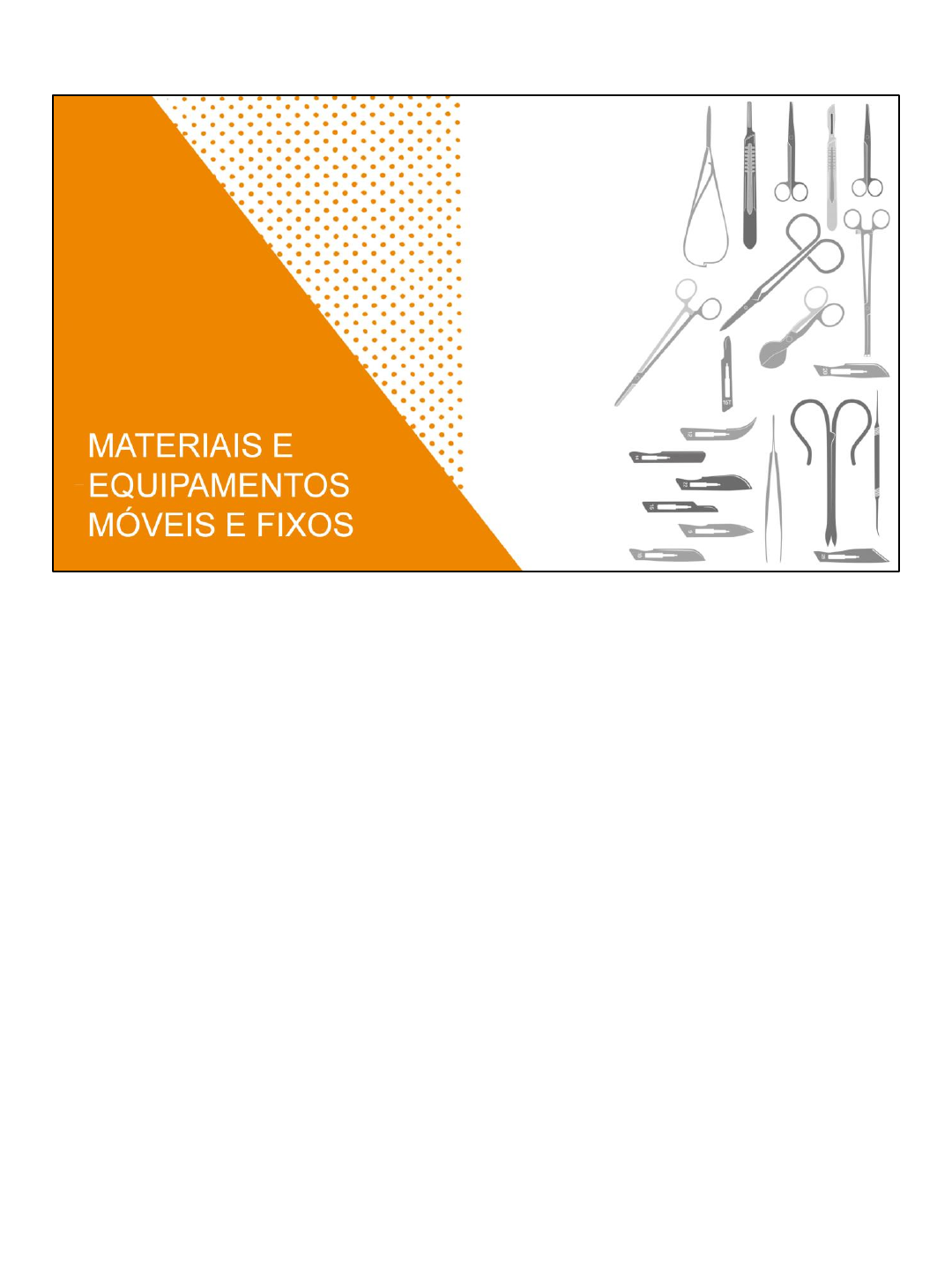 1 São aqueles que podem ser deslocados de uma para outra sala de operação, a fim de atender o planejamento do ato cirúrgico de acordo com a especificidade, ou mesmo serem acrescidos durante o desenvolvimento da cirurgia. São estes: • mesa cirúrgica e acessórios: colchonete de espuma, perneiras metálicas, suporte de ombros e arco para narcose. Atualmente, já estão no mercado mesas cirúrgicas totalmente automatizadas, o que permite várias configurações, a partir da simples troca de acessórios e módulos, e possibilita movimentos suaves e precisos em todas as direções e em ângulo de quase 180º. aparelho de anestesia, contendo “kits” de cânulas endotraqueais e de Guedel: laringoscópios; pinças de Magil e esfigmomanômetro; mesas auxiliares para instrumental cirúrgico, de Mayo e para pacotes de roupas estéreis; bisturi elétrico ou termocautério; aspirador de secreções; foco auxiliar; banco giratório; balde inoxidável com rodízios; suportes: de braço, hamper, bacia e soro; 2 escada de dois degraus; estrado; equipamentos utilizados para ajudar no posicionamento do paciente, tais como: coxins de areia ou espuma de diferentes tamanhos e talas; carro para materiais de consumo e soluções antissépticas (o qual pode ser dispensado, quando houver local adequado para a colocação destes materiais como, por exemplo, prateleiras); carro para materiais estéreis; aparelhos monitores; balança para pesar compressas e gazes. São exemplos de equipamentos moveis que podem ser acrescentados à sala cirúrgica: suporte de trépano, microscópio, máquina para circulação extracorpórea e outros. Equipamentos fixos: Foco central Negatoscópio Sistema de canalização de ar e gases Prateleira Suporte de soro fixo Ar condicionado Móveis Mesa cirúrgica e acessórios Aparelho de anestesia Mesas auxiliares Bisturi elétrico Aspirador de secreções Foco auxiliar Banco giratório 2 3 Móveis: Mesa cirúrgica e acessórios Aparelho de anestesia Mesas auxiliares Bisturi elétrico Aspirador de secreções Foco auxiliar Banco giratório Balde inoxidável com rodízio; Suportes: de braço, hamper Escada de dois degraus; Aparelhos monitores; Carro ou mesa para material 4 estéreis; Equipamentos utilizados para ajuda no posicionamento do paciente: coxins de espuma ou areia de diferentes tamanhos e talas. 4 Para iniciar uma cirurgia, alguns materiais são básicos e essenciais, entre eles: Pacote de aventais Pacote de campos cirúrgicos Pacote de compressas Caixa de instrumental (conforme cirurgia que será realizada) Material de anestesia Medicações 5 6
