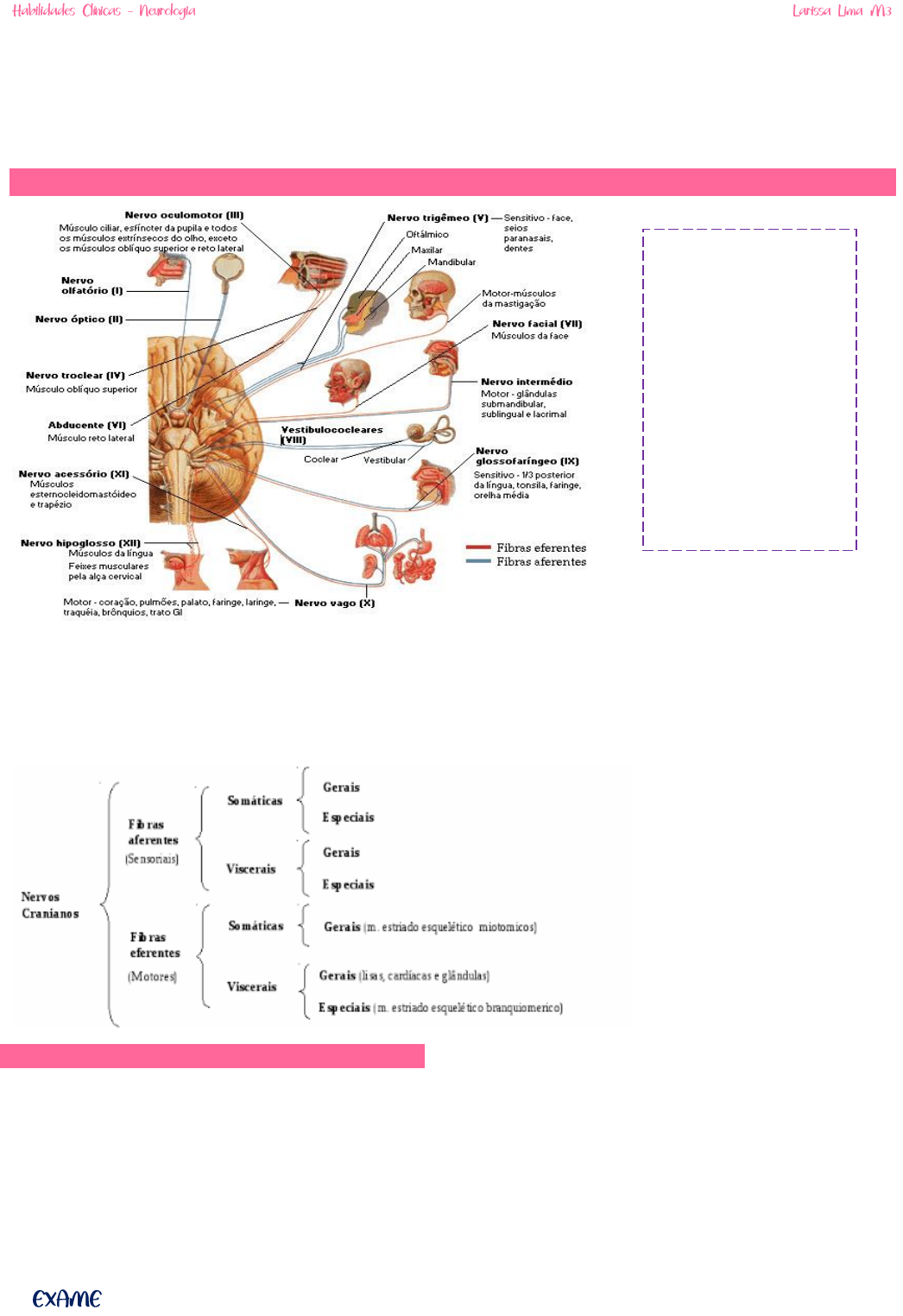 Nervos Cranianos Pares Cranianos ↪ 12 pares de nervos cranianos -> associados ao encéfalo, sendo o I e II relacionados ao prosencéfalo e os demais ao tronco encefálico. ↪ Se estendem em diferentes partes da cabeça e pescoço, com exceção do vago que chegam ao abdome. Classificação Funcional I – Nervo Olfatório ↪ Origem no encéfalo – bulbo olfatório ↪ Origem no crânio – lâmina crivosa do osso etmoide ↪ Responsável pelo sentido do olfato ↪ Supõe-se que a função do nervo esteja normal quando o paciente detecta o odor, mesmo não sendo capaz de identifica-lo corretamente. ↪ Geralmente é o par craniano que é mais acometido por contusões cranianas : ↪ Examinar uma narina por vez utilizando odores típicos/conhecidos (café, canela, cravos, hortelã...). ↪ Examinar o paciente em pé ou sentado ↪ Examinar se a alteração é unilateral ou bilateral ↪ Investigar alterações do olfato, se presente, buscar causas/patologias. ➘Anosmia (diminuição ou perda absoluta do olfato) em ambas as narinas -> resfriados, traumas e obstrução das narinas ➘Anosmia unilateral -> narina bloqueada, tumores frontais (meningeomas e gliomas). ➘Hiposmia: diminuição da sensibilidade olfativa -> pode ocorrer devido a rinite, uso excessivo de remédios para desentupir o nariz. I – Olfatório II – Óptico III – Oculomotor IV – Troclear V – Trigêmeo VI – Abducente VII – Facial VIII – Vestíbulo coclear IX – Glossofaríngeo X – Vago XI – Acessório XII - Hipoglosso ➘Parosmia: perversão do olfato; é uma sensação distorcida do olfato, geralmente resultando em sensação de cheiros que não existem ou cheiros desagradáveis ➘Cacosmia: condição alterada de cheiro em que a pessoa aprecia ou se sente atraída por cheiros desagradáveis. Pode referir-se também a uma sensação constante ou frequente de estar emitindo odor desagradável, devido a causas fisiológicas ou psiquiátricas (alucinação sensorial). O indivíduo em causa sente odores desagradáveis em situações em que o restante das pessoas percebe odores normais ou mesmo não percebem nenhum odor. . II – Nervo Óptico ↪ Origem no encéfalo – quiasma óptico ↪ Origem no crânio – canal óptico ↪ Transmite informação visual a partir da retina, através do quiasma óptico, para então trafegar pelos tratos ópticos para o núcleo geniculado lateral do tálamo. ↪ Sua função é avaliada separadamente para cada olho. : - Oftalmoscopia: feita em sala escura para a dilatação das pupilas, para observar o fundo do olho. ↪ Examina-se o fundo do olho para observar se tem alterações nas artérias, coloração do nervo óptico e mácula. ↪ A anormalidade mais importante nesse exame é o edema de disco óptico (papiledema). - Avaliação do campo visual: (campometria por confrontação) ↪ Verifica-se cada olho separadamente e pede para o paciente olhar para um ponto fixo. Após, coloca-se um objeto (de cor) equidistante do paciente e examinador e movimenta-o em quadrantes (superior, inferior, lateral direito e lateral esquerdo) para observar até onde o paciente vai perceber o objeto. ↪ As alterações indicam neoplasias, infecções e demielinização, sendo que são caracterizadas de acordo com a porção do campo atingido (amaurose unilateral, hemianopsia, heterônima bitemporal, hemianopsia homônima esquerda, quadrantonopsia homônima esquerda. - Acuidade visual: é avaliada ao pedir para o paciente que veja e nomeie os objetos da sala ou leia algo, cada olho, separadamente. É testada usando a tabela de Snellen. Podem ocorrer alterações unilateral ou bilateral, como na ambliopia ou abolida na amaurose, indicando neoplasias, hipertensão intracraniana e neurite retrobulbar. - Reação consensual: avaliar se as pupilas são fotorreagentes - Posição de pálpebra – ptose e retração; - Protusões – exoftalmia e enoftalmia (olhos pra dentro).. Hemianopsias bitemporais: defeito nos campos temporais de ambos os olhos. Quadrantanopsias homônimas: defeito do mesmo quadrante de visão de ambos os olhos; ↳ Quadrante superior: lesão temporal ↳ Quadrante inferior: lesão parietal Hemianopsias homônimas: defeito do mesmo hemicampo em ambos os olhos; Lesão do trato óptico; Lesão posterior do corpo geniculado lateral; Córtex visual – área 17 OLHO NORMAL: Mácula Disco óptico Vasos sanguíneos https://www.abc.med.br/p/psicologia-e-psiquiatria/355369/alucinacoes+o+que+sao+quais+os+tipos.htm ↪ Olho normal: disco óptico amarelado e oval, situado em posição nasal; vasos sanguíneos bem demarcados e veias com pulsação espontânea; mácula é mais pálida que o restante da retina, situada em região temporal. PAPILEDEMA ATROFIA ÓPTICA GLAUCOMA RETINOPATIA HIPERTENSIVA RETINOPATIA DIABÉTICA ↪ OBSERVAÇÃO: (QUEIXAS NEUROLÓGICAS) Paciente com dor de cabeça: - Modo súbito/aguda -> doença vascular; - Modo progressivo -> doença degenerativa, processo expansivo (doença que ocorre em curso) III – IV – VI : Oculomotor ↪ Estes 3 nervos controlam a ação dos músculos intraoculares (esfíncter da pupila) e dos músculos extraoculares. III – Origem no encéfalo: sulco medial do pedúnculo cerebral; Origem no crânio: fissura orbital superior IV – Origem no encéfalo: véu medular superior; Origem no crânio: fissura orbital superior VI – Origem no encéfalo: sulco bulbopontino Origem no crânio: fissura orbital superior - É um inchaço do disco óptico que é causado por uma pressão intracraniana aumentada. - Artérias dilatadas, disco óptico embaçado. - Perda de algumas ou da maioria das fibras do nervo óptico. - Nervo óptico opaco/pálido, há dilatação dos vasos sanguíneos. - Causas: esclerose múltipla, aumento da PIC e hereditária. - Causada principalmente pela elevação da pressão intraocular que provoca lesões no nervo ótico. - Disco óptico aumentado, brilho intenso, artérias dilatadas. - Lesão vascular da retina 