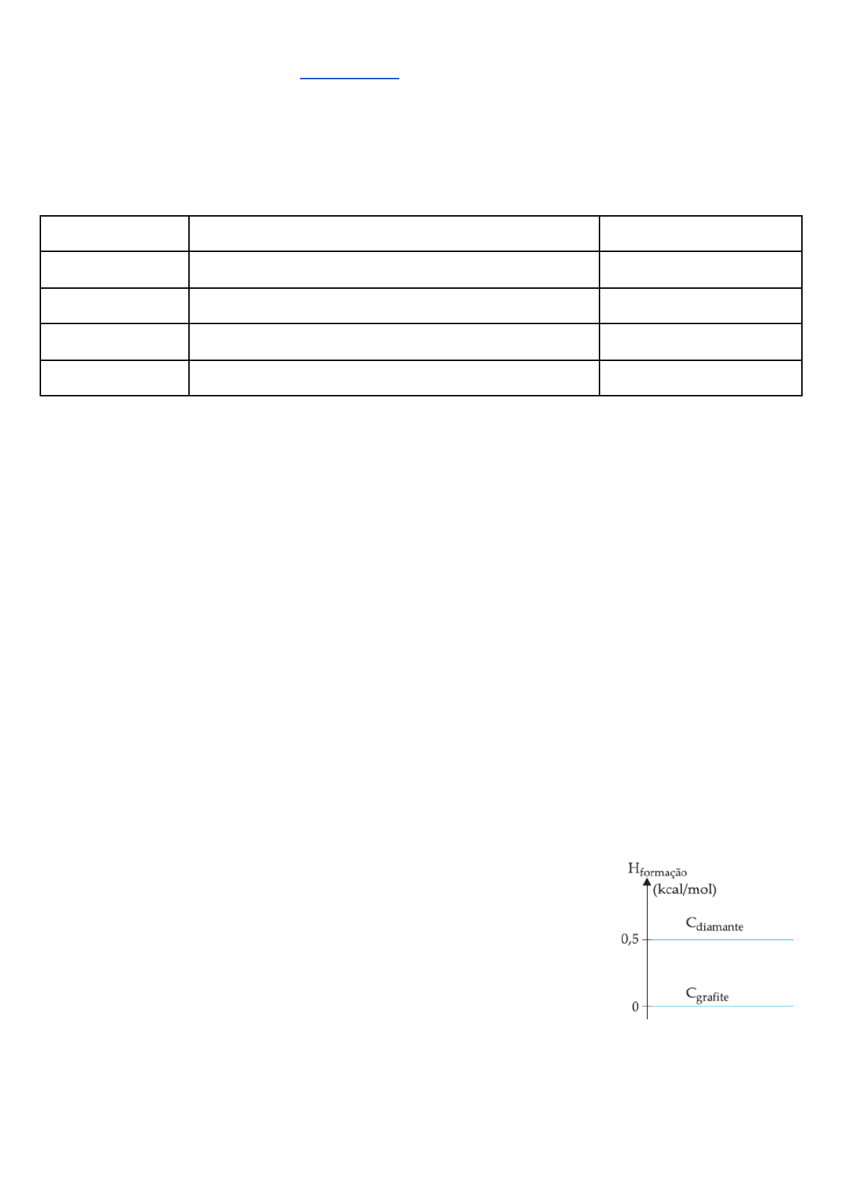 QUÍMICA DO SCHNO 2.4.03 – ENTALPIA PADRÃO DE FORMAÇÃO 2ª SÉRIE Responda esta lista no formulário em bit.ly/3JHLI2g e receba a resposta imediata com comentários. A entalpia padrão de formação de uma substância é nula quando é simples (se apresentar alotropia, sempre a forma mais estável), está no estado padrão e nas condições normais de temperatura e pressão (CNTP) que correspondem a 0 °C (273 K) e 1 atm. Alotropia é o fenômeno associado à substâncias simples, quando um elemento químico da tabela periódica é capaz de se combinar e formar mais de uma substância simples. Os quatro comumente citados são: Elemento Formas Alotrópicas Mais Estável Oxigênio Oxigênio Molecular (O2), Ozônio (O3) Gás oxigênio (O2) Carbono Grafite, Diamante, Nanotubos de carbono e Fulerenos Grafite Enxofre Rômbico (Ortorrômbico Sr) e Monoclínico (Sm) Rômbico Fósforo Branco (P4), Vermelho (P4n) e Preto (Pn) Preto (Pn) 1) (UfrgsRs) A reação cujo efeito térmico representa o calor de formação do ácido sulfúrico é: a) H2O(ℓ) + SO3(g) → H2SO4(ℓ) b) H2(g) + S(m) + 2 O2(g) → H2SO4(ℓ) c) H2O(g) + S(r) + O2(g) → H2SO4(ℓ) d) H2S(g) + 2 O2(g) → H2SO4(ℓ) e) H2(g) + S(r) + 2 O2(g) → H2SO4(ℓ) 2) Considere as seguintes equações termoquímicas I. 3 O2(g) → 2 O3(g) ∆H1 = + 284,6 kJ II. C(graf) + O2(g) → CO2(g) ∆H2 = - 393,3 kJ III. C2H4(g) + 3 O2(g) → 2 CO2(g) + 2 H2O(ℓ) ∆H3 = - 1410,8 kJ IV. C3H6(g) + H2(g) → C3H8(g) ∆H4 = - 123,8 kJ V. I(g) → I2(g) ∆H5 = - 104,6 kJ Qual é a variação de entalpia que pode ser designada calor de formação? a)∆H1 b)∆H2 c)∆H3 d)∆H4 e)∆H5 3) (FeparPr) Assinale a alternativa que representa apenas substâncias com entalpia padrão (H°) igual a zero: a) Cℓ2(g); H2O(ℓ); Cdiam; H2(g). b) Hg(ℓ); O3(g); H2(g); Cu(s). c) Cℓ2(g); Hg(ℓ); Cgraf; H2(g). d) Cℓ2(g); H2O(ℓ); S8(mon); O2(g). e) Cℓ2(g); Cu(ℓ); Cgraf; O2(g). 4) (UnisaSp) Considerando-se o diagrama de entalpia ao lado: a) o Cgrafite é mais estável e mais abundante do que o Cdiamante. b) o Cdiamante é mais estável e mais abundante do que o Cgrafite. c) o Cgrafite é o alótropo mais estável e o Cdiamante é o alótropo mais abundante. d) o Cdiamante é o alótropo mais estável e o Cgrafite é o alótropo mais abundante. e) o Cgrafite e o Cdiamante são alótropos igualmente estáveis e abundantes. 5) Identifique a reação que define a variação da entalpia-padrão de formação: a) 2 C(grafite) + 2 O2(g) → 2 CO2(g) b) C(diamante) + O2(g) → CO2(g) c) C(grafite) + O2(g) → CO2(g) d) CaO(s) + 3 CO2(g) → CaCO3(g) e) N2(g) + 3 H2(g) → 2 NH3(g) https://bit.ly/3JHLI2g 6) Do conjunto de substâncias abaixo, quais devem ter entalpia-padrão de formação (∆H°f) igual a zero: a) água líquida. b) nitrogênio gasoso. c) oxigênio gasoso. d) grafita. e) diamante. 7) (MackSp) C grafite (s) + O2(g) → CO2(g) DH = - 94,0 kcal C diamante (s) + O2(g) → CO2(g) DH = - 94,5 kcal Relativamente às equações anteriores, fazem-se as seguintes afirmações: I - C (grafite) é a forma alotrópica menos energética. II - As duas reações são endotérmicas. III - Se ocorrer a transformação de C (diamante) em C (grafite) haverá liberação de energia. IV - C (diamante) é a forma alotrópica mais estável. São corretas: a) I e II, somente. b) I e III, somente. c) I, II e III, somente. d) II e IV, somente. e) I, III e IV, somente. 8) (Fei) A fabricação de diamante pode ser feita comprimindo-se grafite a uma temperatura elevada empregando-se catalisadores metálicos como o tântalo e o cobalto. Analisando os dados obtidos experimentalmente em calorímetros: C grafite (s) + O2(g) → CO2(g) DH = - 393,5kJ/mol C diamante (s) + O2(g) → CO2(g) DH = - 395,6kJ/mol a) a formação de CO2 é sempre endotérmica b) a conversão da forma grafite na forma diamante é exotérmica c) a forma alotrópica estável do carbono nas condições da experiência é a grafite d) a variação de entalpia da transformação do carbono grafite em carbono diamante nas condições da experiência é DH= -2,1 kJ/mol e) a forma alotrópica grafite é o agente oxidante e a diamante é o agente redutor das reações de combustão 9) (PucRj) Considere a seguinte reação termoquímica e assinale a alternativa falsa. 2 NO(g) + O2(g) → 2 NO2(g) DH= - 13,5 kcal/mol de NO a) A reação é exotérmica. b) São libertados 13,5 kcal para cada mol de NO(g) que reagir. c) A entalpia padrão de formação do O 2(g) é diferente de zero nas condições–padrão. d) A reação de oxidação do NO (g) pode ocorrer no ar atmosférico. e) Nenhuma das alternativas é falsa. 10) (Faap) O enxofre constitui-se na matéria prima essencial na fabricação de H2SO4. No estado sólido, o enxofre apresenta as formas alotrópicas rômbica e monoclínica. Sabendo que: S(monoclínico) + O2(g) → SO2(g) DH = - 71,1 Kcal/mol S(rômbico) + O2(g) → SO2(g) DH = - 71,0 Kcal/mol podemos afirmar que: a) a transformação da forma monoclínica para a rômbica se dá com a liberação de 71,0 Kcal/mol b) o enxofre sólido, em temperaturas mais baixas, apresenta-se na forma monoclínica c) a transformação da forma rômbica para a monoclínica se dá com a liberação de 0,1 Kcal/mol d) a forma rômbica precede à monoclínica quando o enxofre sólido é aquecido e) a transformação do enxofre sólido de uma forma alotrópica para outra, não envolve variação de energia Professor Lucas Schnorrenberger de Oliveira Química do Schno