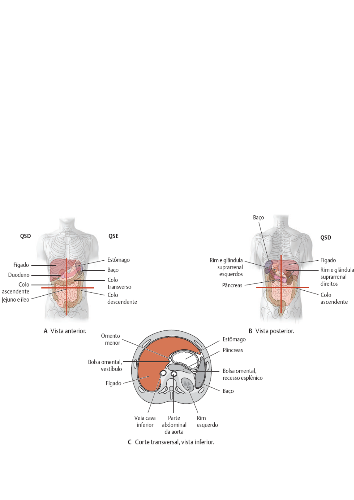 Bruna Siqueira de Arruda - Medicina AN����I� D� �ÍGA�� � �A V��ÍCU�� ��LI�� ────────────────── Fíga�� ─────────────────── Loc����ação O fígado ocupa o quadrante superior direito (QSD) e o quadrante superior esquerdo (QSE); está localizado nas seguintes regiões abdominais: hipocôndrio direito (quase totalmente), epigástrio e hipocôndrio esquerdo (pouco). Localiza-se abaixo do diafragma, dominando a topografia da parte superior do abdome. Obs.: Em recém nascidos, o fígado possui um tamanho muito maior devido a sua função hematopoiética na vida fetal. 1 Bruna Siqueira de Arruda - Medicina O fígado é quase que inteiro protegido pelas costelas (principalmente pelo arco costal direito, como pode ser observado na imagem). Porém, por ter sua posição determinada pelo diafragma e pelos pulmões, nem sempre há o aumento do órgão quando ele pode ser palpado. Fac�� �� fíga�� FACE DIAFRAGMÁTICA: face em forma de cúpula, que inclui áreas lisas (peritoneais) e a área nua áspera; relaciona-se com a face inferior do diafragma; recoberto por peritônio visceral, exceto na área nua. FACE VISCERAL: face relativamente plana e côncava, direcionada para baixo, para trás e para esquerda; está em contato com as vísceras (é marcado por diversas impressões resultantes desses contatos) e é onde se encontra o hilo hepático. Face diafragmática Face visceral 2 Bruna Siqueira de Arruda - Medicina Áre� ��a O fígado é revestido por peritônio visceral, mas há uma parte livre de revestimento, denominada área nua. Esta área é demarcada pela reflexão do peritônio do diafragma para o fígado e está à direita da VCI e posterior ao órgão (face diafragmática). Possui aspecto áspero. Refl�xões ����to���i� Na região superior do fígado, abaixo do diafragma, o peritônio rebate e reveste o fígado. Essa reflexão forma os recessos subfrênicos (direito e esquerdo), entre a face diafragmática do fígado (parte anterior e superior) e o diafragma. Abaixo do fígado, o peritônio sofre outra reflexão e reveste o rim direito, formando o recesso hepatorrenal, situado mais especificamente entre a face visceral do fígado e o rim e a glândula suprarrenal direitos. O recesso hepatorrenal se comunica anteriormente com o recesso subfrênico pelo espaço sub-hepático (abaixo do fígado, onde outros órgãos estão localizados). Vistos em exames de imagem, os recessos são bem pequenos, preenchidos por uma fina camada de líquido peritoneal (que impedem o colabamento). 3 Bruna Siqueira de Arruda - Medicina Lob�� ��atômi��� d� �íga�� DIREITO: maior lobo hepático ESQUERDO: pequeno e pontiagudo à esquerda CAUDADO: visto somente em face visceral; posterior e superior QUADRADO: visto somente em face visceral; anterior e inferior. 4 Bruna Siqueira de Arruda - Medicina 5 Bruna Siqueira de Arruda - Medicina Observe a área nua em aspecto mais opaco que o restante do órgão (pela falta de peritônio visceral). Lig����to� ��páti��� Ligamento falciforme: dobra de peritônio que limita lobo esquerdo e lobo direito; responsável por fixar o fígado à porção inferior do diafragma e à parede anterior do abdome. Ligamento falciforme = união anterior entre os ligg. triangular esquerdo e coronário 6 Bruna Siqueira de Arruda - Medicina Ligamento coronário: dobra peritoneal que fixa a área nua (lobo direito) ao diafragma; circunda a superfície superior do lobo direito como uma coroa. Vista inferior Ligamento triangular esquerdo: dobra peritoneal muito pequena que fixa a parte superior do lobo esquerdo ao diafragma. Ligamento triangular direito: pequena dobra de peritônio que fixa a superfície lateral direita do fígado ao diafragma; especialização do ligamento coronário. Localizado no ápice da área nua (a pontinha inferior). 7 Bruna Siqueira de Arruda - Medicina Ligamento redondo: localizado dentro do ligamento falciforme. É um fragmento (resquício) fibroso da veia umbilical e fixa o fígado à parede anterior do abdome. Vista inferior 8 Bruna Siqueira de Arruda - Medicina Ligamento venoso: resquício fibroso da comunicação entre a veia cava inferior (VCI) e a veia porta do fígado, denominada ducto venoso (período fetal). Ligamento da veia cava inferior: fixa o lobo caudado do fígado à VCI. Observar os ligamentos nas imagens do tópico “Lobos anatômicos do fígado". 9 Bruna Siqueira de Arruda - Medicina Im��es�ões ���c��a�� Impressão gástrica: impressão do estômago no lobo esquerdo e no lobo quadrado. Impressão renal: impressão do rim direito no lobo direito. Impressão suprarrenal: impressão da suprarrenal/adrenal no lobo direito. Impressão cólica: impressão do colo transverso no lobo direito (inferior); observa-se a impressão de saculações. Seg���t�� �o fíga�� O fígado é subdividido em 8 segmentos funcionais. Como traçar os segmentos? - Traçar uma linha transversal → o que está ↑ é posterior e o que está ↓ é anterior. - Traçar uma linha vertical (centro) → segmentos direito e esquerdo. Subdivisões das extremidades: lateral. Subdivisões centrais medial. O segmento I é lobo caudado, também chamado de segmento posterior. A partir do I, começa-se a enumerar pela extremidade e segue em sentido horário. 10 Bruna Siqueira de Arruda - Medicina Hil� ���áti�� Pelo hilo hepático entram e saem estruturas. Segundo Moore: artéria hepática, veia porta e ducto colédoco Segundo Sobotta e Prometheus: artéria hepática própria, veia porta e ducto hepático comum Essas três estruturas formam a TRÍADE PORTAL (anatômica). 11 Bruna Siqueira de Arruda - Medicina Cir����ções ���áti��� CIRCULAÇÃO NUTRICIONAL Artéria hepática própria: o fígado tem o seu parênquima nutrido pe