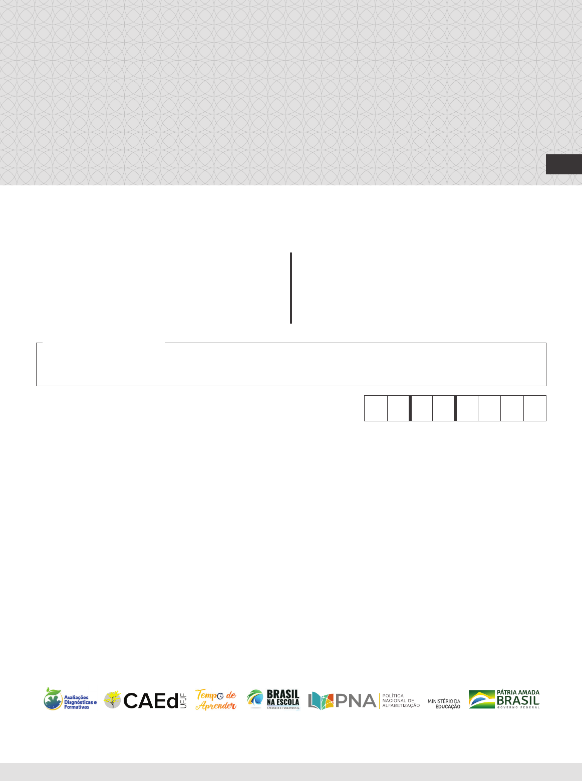 Caderno M0101 MATEMÁTICA Nome do(a) estudante Data de Nascimento do(a) estudante Caro(a) estudante, Você está participando da 1ª Avaliação Formativa MEC 2021. Sua participação é muito importante. • Este caderno é composto de questões de Matemática. • Responda com calma, procurando não deixar nenhuma questão em branco. Bom teste! CADERNO DO APLICADOR 1º ano do Ensino Fundamental 2021 1ª Avaliação Formativa MEC EXEMPLO Vamos fazer juntos um exemplo de uma atividade. Aplicador, ler SOMENTE a(s) informação(ões) que apresenta(m) o desenho de um megafone . Observe abaixo a conta que a professora Ana escreveu no quadro. Não deve ser lido. 15 + 4 Qual é o resultado dessa conta? 11 Não deve ser lido. 18 19 55 BL01M01 Aplicador, ler SOMENTE a(s) informação(ões) que apresenta(m) o desenho de um megafone . Questão 01 M010855H6 Observe abaixo a imagem dos enfeites que Joana comprou para sua árvore de Natal. A forma desses enfeites lembra qual figura geométrica? M0101_APLIC 1 BL01M01 Aplicador, ler SOMENTE a(s) informação(ões) que apresenta(m) o desenho de um megafone . Questão 02 M010065I7 Observe abaixo os aquários com peixes que quatro amigas têm. PAULA SARA MARINA LUÍZA Qual dessas amigas tem a maior quantidade de peixes no aquário? LUÍZA. MARINA. PAULA. SARA. M0101_APLIC 2 BL01M01 Aplicador, ler SOMENTE a(s) informação(ões) que apresenta(m) o desenho de um megafone . Questão 03 M011019I7 Observe os números no quadro abaixo. 6 – 2 – 8 – 4 Qual desses números é o maior? 6 2 8 4 M0101_APLIC 3 BL01M01 Aplicador, ler SOMENTE a(s) informação(ões) que apresenta(m) o desenho de um megafone . Questão 04 M011037H6 Observe abaixo o desenho de um trem feito por Mirela. Ela coloriu uma parte do trem de cinza. A parte desse trem, colorida de cinza, lembra qual figura geométrica? M0101_APLIC 4 BL02M01 Aplicador, ler SOMENTE a(s) informação(ões) que apresenta(m) o desenho de um megafone . Questão 05 M011229H6 Observe abaixo os animais na fazenda de Júlio. Qual é o animal que está mais perto da árvore? M0101_APLIC 5 BL02M01 Aplicador, ler SOMENTE a(s) informação(ões) que apresenta(m) o desenho de um megafone . Questão 06 M010569I7 Observe os números no quadro abaixo. 6 – 3 – 9 – 1 Qual desses números é o menor? 6 3 9 1 M0101_APLIC 6 BL02M01 Aplicador, ler SOMENTE a(s) informação(ões) que apresenta(m) o desenho de um megafone . Questão 07 M011010I7 Observe abaixo as flores que Cláudia ganhou. I II III IV Qual dessas flores é a mais alta? I II III IV M0101_APLIC 7 BL02M01 Aplicador, ler SOMENTE a(s) informação(ões) que apresenta(m) o desenho de um megafone . Questão 08 M011200I7 Sara levou 5 mudas de árvore para plantar no sítio, Davi levou 2 mudas. Quantas mudas de árvore Sara e Davi levaram juntos para plantar? 3 5 7 8 M0101_APLIC 8 BL03M01 Aplicador, ler SOMENTE a(s) informação(ões) que apresenta(m) o desenho de um megafone . Questão 09 M010564I7 Observe abaixo o quarto de João. Qual é o objeto que está em cima da cama? M0101_APLIC 9 BL03M01 Aplicador, ler SOMENTE a(s) informação(ões) que apresenta(m) o desenho de um megafone . Questão 10 M010114I7 Observe abaixo os brinquedos que Luciana organizou na estante. Quantos brinquedos Luciana organizou no total? 9 8 7 4 M0101_APLIC 10 BL03M01 Aplicador, ler SOMENTE a(s) informação(ões) que apresenta(m) o desenho de um megafone . Questão 11 M030561I7 Observe abaixo as caixas de presente que Luana possui. I II III IV Qual dessas caixas é a maior? I II III IV M0101_APLIC 11 BL03M01 Aplicador, ler SOMENTE a(s) informação(ões) que apresenta(m) o desenho de um megafone . Questão 12 M011225I7 Carla tinha 7 mantas em sua casa. Ela doou 3 mantas para um abrigo. Com quantas mantas Carla ficou em sua casa? 4 5 7 10 M0101_APLIC 12 BL04M01 Aplicador, ler SOMENTE a(s) informação(ões) que apresenta(m) o desenho de um megafone . Questão 13 M011202I7 Observe abaixo o desenho de um tronco de árvore. A forma desse tronco lembra qual figura geométrica? M0101_APLIC 13 BL04M01 Aplicador, ler SOMENTE a(s) informação(ões) que apresenta(m) o desenho de um megafone . Questão 14 M010594I7 Sara tinha 8 bonecas. Ela deu 2 dessas bonecas para sua prima. Com quantas bonecas Sara ficou? 5 6 7 8 M0101_APLIC 14 BL04M01 Aplicador, ler SOMENTE a(s) informação(ões) que apresenta(m) o desenho de um megafone . Questão 15 M010146I7 Observe abaixo os lápis que Bela tem. Quantos lápis Bela tem no total? 2 3 4 5 M0101_APLIC 15 BL04M01 Aplicador, ler SOMENTE a(s) informação(ões) que apresenta(m) o desenho de um megafone . Questão 16 M011207I7 Observe abaixo os coelhos que Jorge desenhou. I II III IV Qual desses coelhos tem as orelhas mais compridas? I II III IV M0101_APLIC 16 BL05M01 Aplicador, ler SOMENTE a(s) informação(ões) que apresenta(m) o desenho de um megafone . Questão 17 M010932H6 Observe abaixo a imagem de uma bandeirinha. A forma dessa bandeirinha lembra qual figura geométrica? M0101_APLIC 17 BL05M01 Aplicador, ler SOMENTE a(s) informação(ões) que apresenta(m) o desenho de um megafone . Questão 18 M010137I7 Observe abaixo a quantidade de balões que quatro crianças ganharam em uma festa. MARCELA EVERTON MARLON LUÍSA Qual dessas crianças ganhou a menor quantidade de balões nessa festa? EVERTON. LUÍSA. MARCELA. MARLON. M0101_APLIC 18 BL05M01 Aplicador, ler SOMENTE a(s) informação(ões) que apresenta(m) o desenho de um megafone . Questão 19 M010024I7 Observe abaixo as borboletas ao redor do vaso de planta. Qual é a borboleta que está mais próxima do vaso de planta? M0101_APLIC 19 BL05M01 Aplicador, ler SOMENTE a(s) informação(ões) que apresenta(m) o desenho de um megafone . Questão 20 M011215I7 Observe os números no quadro abaixo. 4 – 2 – 8 – 6 Qual desses números é o menor? 4 2 8 6 M0101_APLIC 20 BL05M01 Aplicador, ler SOMENTE a(s) informação(ões) que apresenta(m) o desenho de um megafone . Questão 21 M011158H6 Observe abaixo o dese