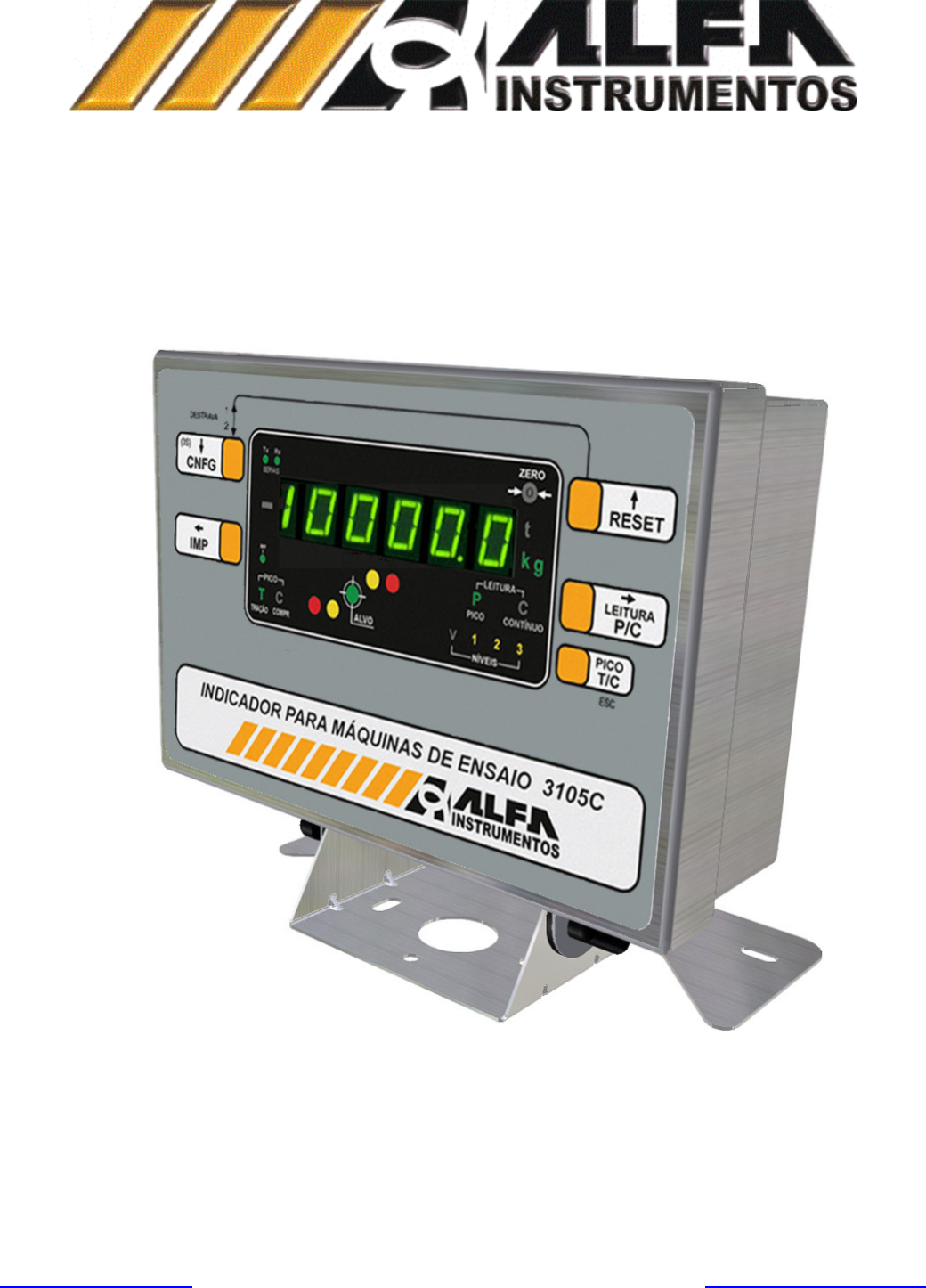 ALFA INSTRUMENTOS ELETRÔNICOS LTDA Rua Cel. Mário de Azevedo, 138 - São Paulo – SP 02710-020 Brasil Fax: (11) 3961-4266 Fone: (11) 3952-2299 SAC: 0800-772-2910 www.alfainstrumentos.com.br E-mail: vendas@alfainstrumentos.com.br INDICADOR PARA MÁQUINAS DE ENSAIO Modelo 3105C MANUAL DE INSTALAÇÃO E OPERAÇÃO REVISÃO 1.24 INDICADOR PARA MÁQUINAS DE ENSAIO MOD. 3105C 2/38 ÍNDICE 1. Introdução .................................................................................................................................................................. 3 2. Visão Geral ................................................................................................................................................................. 3 3. Instalação e Conexões ............................................................................................................................................... 4 3.1. Condições Elétricas ............................................................................................................................................. 5 3.2. Condições Locais ................................................................................................................................................ 5 3.3. Instalação ............................................................................................................................................................ 6 3.4. Conex ões ............................................................................................................................................................ 6 4. Descrição e Operação ................................................................................................................................................ 8 4.1. Modos de Operação ............................................................................................................................................ 12 4.2. Unidade Central de Processamento – Interface BASE ....................................................................................... 12 4.2.1. Funções de Ensaio ....................................................................................................................................... 13 4.2.2. Comandos Remotos ..................................................................................................................................... 14 4.2.3. Filtros Digitais ............................................................................................................................................... 14 4.2.4. Funções de Controle .................................................................................................................................... 15 4.2.5. Saída para Impressão .................................................................................................................................. 15 4.2.6. Número de Série .......................................................................................................................................... 16 4.2.7. Senha do Operador ...................................................................................................................................... 17 4.2.8. Células de Carga ......................................................................................................................................... 17 4.3. Interface SINALIZAÇÃO ...................................................................................................................................... 18 4.4. Saídas de Nív eis ................................................................................................................................................. 19 4.5. Interfaces Seriais ................................................................................................................................................. 22 4.6. Saída Paralela ..................................................................................................................................................... 26 4.7. Interface Relógio-Calendário ............................................................................................................................... 27 5. Calibração do Indicador ............................................................................................................................................. 27 6. Mensagens do Sistema .............................................................................................................................................. 30 7. Guia Rápido de Programação .................................................................................................................................... 31 8. Especificações ........................................................................................................................................................... 35 INDICADOR PARA MÁQUINAS DE ENSAIO MOD. 3105C 3/38 HISTÓRICO DE REVISÕES DE PROGRAMA REVISÃO DATA FUNÇÕES 1.24 06/2006 Função ZINI desabilitada no modo DEFAULT (fábrica) Escrita de ZERO a cada 10segs e não mais a cada 1 seg Rotina para garantir intervalo mínimo de 10ms entre escritas na E2P 1.23 05/10/05 Alterado formato do PESO na impressão e comunicação serial no modo ZERO FIXO Inclusão de opções de atuação do BUZZER no modo SOBRA/FALTA Inclusão de configuração de 1 ou 2 STOP BITS para protocolos MODBUS-RTU Transmissão de PESO + TARA sob demanda nos protocolos RTU e modo TR-3102 Implementado tratamento de curto entre os sinais de alimentação das células 1.22 26/07/05 Modificado modo de atuação do COMANDO REMOTO quando há código inválido 1.21 04/07/05 Otimização da comunicação serial para todos os protocolos 1.20 22/06/05 Otimizado o processo de calibração do conversor A/D 1.19 06/06/05 Otimizado o envio do pacote no formato BCD com a interface 3050 1.18 31/05/05 Otim