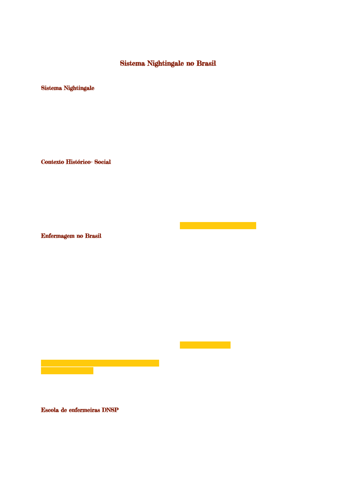 A enfermagem moderna Sistema Nightingale no Brasil Sistema Nightingale O sistema Nightingale chegou ao Brasil na década de 20, trazido por uma Missão de Cooperação Técnica para o Desenvolvimento da Enfermagem no Brasil liderada por Ethel Parsons, enfermeira chefe da divisão de Higiene Infantil e Enfermagem de Saúde Pública do Estado do Texas. Ethel Parsons (1887 - 1971) Contexto Histórico- Social Em 1919 foi criado o Departamento Nacional de Saúde Pública (DNSP) e seu primeiro diretor, Carlos Chagas, deu início a uma reforma sanitária denominada “Reforma Carlos Chagas” onde as ações sanitárias voltaram-se para a prevenção de epidemias e para a higiene materno-infantil. Carlos Chagas (1879-1934) Enfermagem no Brasil A fundação Rockefeller, criada nos EUA por um bilionário que criou uma série de instituições filantrópicas de ajuda, tendo como principal finalidade às questões de saúde pública, escolheu o Brasil para sediar um estudo ligado a doenças prevalentes, a organização hospitalar e a educação médica tendo aqui se instalado em 1916. Foi o diretor da Fundação Rockefeller que estimulou Carlos Chagas em conhecer a contribuição das enfermeiras americanas dentro das campanhas profiláticas nos EUA e quem intermediou as negociações para a vinda de uma missão de enfermeiras norte-americanas para criar uma escola de enfermagem nos moldes modernos. Construção da identidade profissional da enfermagem no Brasil A Fundação Rockefeller registrou que não existia no Brasil enfermeiras nos moldes americanos, que em muito auxiliaram a reforma sanitária nos EUA. Escola de enfermeiras DNSP O Departamento Nacional de Saúde Pública (DNSP) garante três movimentos principais: - A inspetoria de tuberculose; - A inspetoria de doenças venéreas; - Os serviços de enfermeiras, as americanas além de formarem as alunas também atuavam no trabalho de enfermeira; - Escolas de enfermagem; A escola de enfermeiras do DNSP inicia seu funcionamento em 1923, tendo com a sua primeira diretora, Clara Louise Kieninger, enfermeiras americana que também organizou o Hospital Geral da Assistência (DNSP), servindo o de campo de estágio para as alunas, além do Curso de Enfermeiras que tinha uma duração de 2 anos, havia também o Curso de Visitadoras de Higiene, com duração de 6 meses que atuavam nas visitas domiciliares, inspeção do ambiente para orientação da população. Curso de Visitadoras de Higiene O curso de visitadoras constava de ensino teórico-prático e colocava as visitadoras sob "disciplina e controle” para que não se destruísse a imagem da enfermeira de saúde pública que deveria ser implantada no Brasil. Tais visitadoras não podiam assumir cargos de responsabilidade e deveriam trabalhar sempre sob supervisão de uma enfermeira e logo que possível deveriam ser substituídas por enfermeiras diplomadas pela escola de enfermagem. Essa exigência era para provar aos médicos do (DNSP) que o alto padrão da enfermagem americana era essencial e possível no Brasil. Curso de enfermeiras Os critérios de seleção das alunas eram rígidos, e somente moças com instrução poderiam ingressar no curso de enfermeiras, o que significava moças de famílias ricas. A seleção adotava critérios rígidos: - mulheres; - solteiras; - fazer uma redação com motivo para ser enfermeira; - entrevistas com a diretora americana; Yana Sheila - Enfermagem (UFRJ) 3° período - ficha com antecedente como uma espécie de carta de indicação feita por alguém importante como médicos e diploma do curso estudantil. Houve um trabalho árduo de propaganda para recrutar candidatas: As alunas moravam em uma residência da escola, tinham direito a transporte para deslocamento de casa para a escola, recebiam alimentação, cuidado com a roupa, ou seja, ganhavam o uniforme e uma remuneração. A residência ficava sob a direção da superintendente de enfermeiras, responsável perante o diretor do hospital e perante os pais das alunas, pela manutenção da disciplina e elevada moral na atmosfera social conforme nos melhores colégios de moças. A diretora da escola chefiava o serviço de enfermagem do Hospital Geral de Assistência. A escola assumia um número progressivo de enfermarias até que o hospital ficasse sob seu controle. Modelo anglo-americano de Enfermagem O projeto de implantar uma escola de enfermeiras, nos moldes das escolas mais modernas existentes nos Estados Unidos, decorreu do entendimento de que a eficiência do serviço de enfermeiras do DNSP dependeria da formação de tais profissionais e de que não havia, em toda a América Latina, uma escola que pudesse ser considerada como padrão. Com a formatura das primeira turma “As pioneiras”, em 1925, teve início a inserção de enfermeiras diplomadas no serviço do DNSP e o aperfeiçoamento em cursos no exterior para se especializarem. Em 126 ocorreu a fundação da Associação Nacional de Enfermeiras Diplomadas (que deu origem a ABEn), o serviço de enfermeiras passou a ser independente e as enfermeiras assumiram as chefias de enfermagem nos dispensários. Em 1926 a Escola de Enfermeiras do DNSP passa a chamar-se Escola de Enfermeiras D. Anna Nery e depois ocorreram várias mudanças de nome relacionadas a Anna Nery. 1. Escola de enfermeiras D. Anna Nery; 2. Escola de Enfermeiras Anna Nery; 3. Escola de Enfermagem Anna Nery. Na Escola de Enfermeiras D. Anna Nery foram instituídos rituais e cerimônias como “A recepção de toucas e o ritual da lâmpada”. Os uniformes das enfermeiras e das alunas era considerado quase sagrado, simbolizando a imagem da enfermeira moderna na sociedade brasileira. A touca era o objeto de distinção e honra das enfermeiras hospitalares e a braçadeiras das enfermeiras de saúde pública. Conforme formavam novas turmas, as enfermeiras “ananéri” se difundiam pelo Brasil levando o alto padrão dessa escola que primava pelo ensino, pela conduta moral de suas enfer