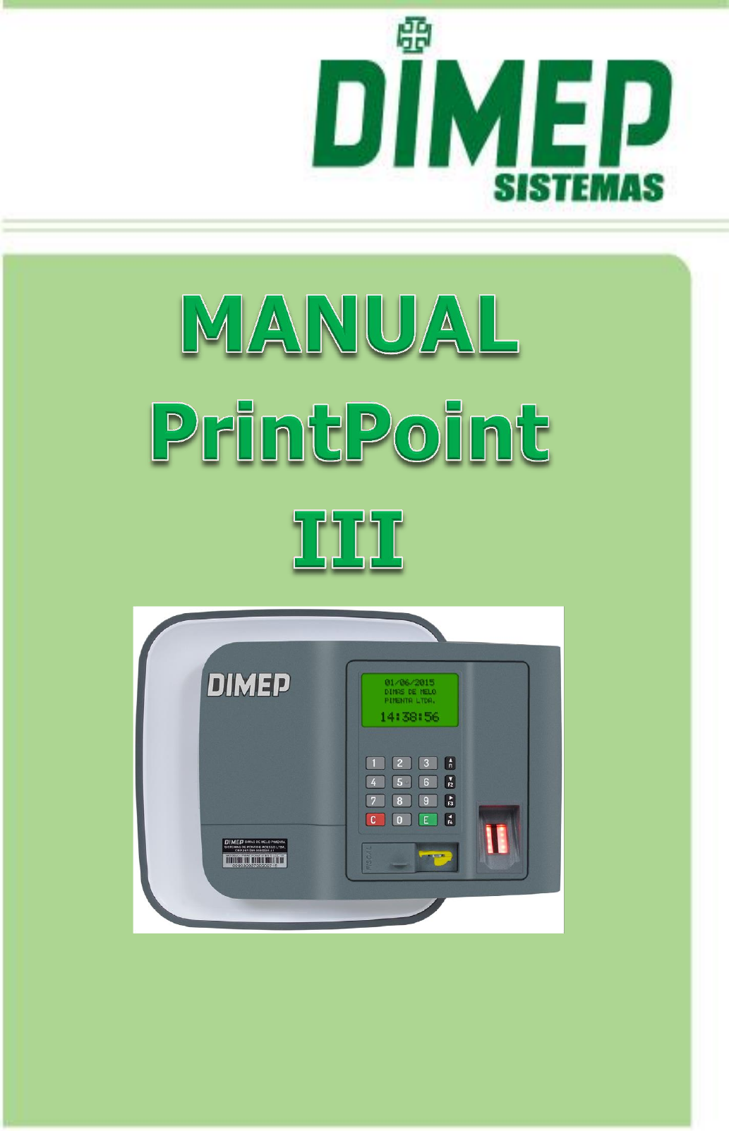 Revisão: 02 Data: 28/05/2015 ESTE PRODUTO SE ENQUADRA NAS EXIGÊNCIAS DA PORTARIA 595/13 DO INSTITUTO NACIONAL DE METROLOGIA, QUALIDADE E TECNOLOGIA - INMETRO. PrintPoint III Suporte / Assistência Técnica: (011) 3646-4000 Revisão: 02 Página: 2/54 Sumário 1. Apresentação ...................................................................................................................................... 4 1.1 Relógio ................................................................................................................................................. 4 1.2 Display de LCD ................................................................................................................................... 4 1.2.1 Ícone de comunicação ........................................................................................................... 4 1.2.2 Status de violação e sensor .................................................................................................. 5 1.3 Pictograma ........................................................................................................................................... 5 1.4 Leitor de Crachás ............................................................................................................................... 5 1.5 Leitor Biométrico ................................................................................................................................. 6 1.6 Alerta Sonoro ...................................................................................................................................... 6 1.7 Teclado ................................................................................................................................................. 6 1.8 Memórias de Armazenamento de Registros e Listas ................................................................... 7 1.9 Alimentação de Energia .................................................................................................................... 7 1.9.1 Comunicação de Dados ........................................................................................................ 7 1.9.2 Segurança do equipamento e dos dados ........................................................................... 7 1.9.2.1 Lacre do equipamento ........................................................................................................... 7 1.9.2.2 Lacre da porta fiscal ............................................................................................................... 7 1.9.2.3 Criptografia comunicação ...................................................................................................... 8 1.9.2.4 Assinatura do ticket ................................................................................................................ 8 1.9.3 Conteúdo da Embalagem .................................................................................................... 10 2. INSTALAÇÃO E LIGAÇÕES .......................................................................................................... 11 2.1 Requisitos Elétricos e Ambientais .................................................................................................. 11 2.2 Fonte de Alimentação ...................................................................................................................... 11 2.3 Fixação do Relógio ........................................................................................................................... 11 2.4 Ligação do Cabo de Comunicação Ethernet e Alimentação ..................................................... 12 2.5 Impressora, bobina e troca de papel ............................................................................................. 12 3. FUNÇÕES DO RELÓGIO PRINTPOINT III ................................................................................. 13 3.1 Supervisor .......................................................................................................................................... 13 3.2 Geração do Arquivo AFD via Pen Drive ....................................................................................... 13 3.2.1 Layout do Arquivo Fonte de Dados - AFD ........................................................................ 14 3.2.1.1 Registro tipo “1” – Cabeçalho ............................................................................................. 14 3.2.1.2 Registro tipo “2” – Inclusão ou alteração da identificação da empresa no REP ........ 14 3.2.1.3 Registro tipo “3” – Marcação de ponto .............................................................................. 14 3.2.1.4 Registro tipo “4” – Ajuste do relógio de tempo real (RTC) do REP .............................. 14 3.2.1.5 Registro tipo “5” – Inclusão ou alteração ou exclusão de empregado da MT do REP15 3.2.1.6 Registro tipo “6” – Eventos sensíveis do REP ................................................................. 16 3.2.1.7 Trailer ..................................................................................................................................... 16 3.2.1.8 Assinatura digital .................................................................................................................. 16 PrintPoint III Suporte / Assistência Técnica: (011) 3646-4000 Revisão: 02 Página: 3/54 3.3 Corte de Papel .................................................................................................................................. 16 3.4 Relação Instantânea de Marcações .............................................................................................. 17 3.5 Chave Pública ................................................................................................................................... 17 3.6 Inclusão de Digitais ................