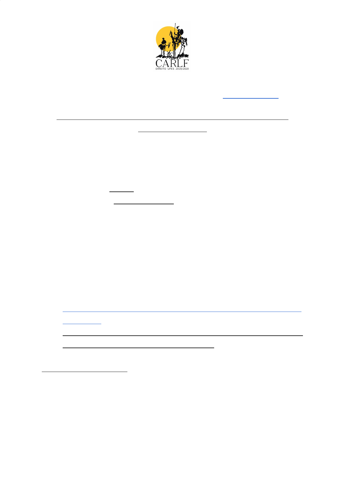 CENTRO ACADÊMICO ROBERTO LYRA FILHO Sala 105, ED I, Centro de Ciências Jurídicas e Econômicas – Universidade Federal do Espírito Santo. Vitória - ES. E-mail: carlf.ufes@gmail.com PASSO A PASSO PARA O LANÇAMENTO DE HORAS DE ATIVIDADES COMPLEMENTARES Para que os alunos finalistas possam colar grau há uma série de requisitos cumulativos que vão para além da aprovação nas disciplinas obrigatórias entre o 1º e o 10º período. São eles, portanto: ● Aprovação em TODAS as disciplinas obrigatórias do Curso de Direito; ● Aprovação em, no mínimo, SETE disciplinas optativas de livre escolha do discente; Realização de prática jurídica entre o 8º e o 10º período (portanto, por três semestres consecutivos); ● Apresentação e aprovação de Trabalho de Conclusão de Curso (TCC) ao final do curso (que pode ser substituído por algumas outras formas, como apresentação de artigo científico ou capítulo de livro, mediante alguns requisitos próprios) Link da resolução que dispõe sobre o Trabalho de Conclusão de Curso: http://www.direito.ufes.br/sites/direito.ufes.br/files/field/anexo/resolucao_tcc_1 _2019_0.pdf ● Cumprimento de atividades complementares, de livre escolha do discente, perfazendo carga horária mínima de 180 horas. Observações Importantes : ● Disciplinas optativas são disciplinas ofertadas como tal pelo próprio Departamento de Direito. Entretanto, a Universidade permite que disciplinas ofertadas por outros Departamentos também sejam cursadas, desde que disponibilizadas na modalidade escopo 3 (para toda a Universidade). Estas são chamadas de eletivas. As eletivas, se possuírem afinidade de ementa mailto:carlf.ufes@gmail.com http://www.direito.ufes.br/sites/direito.ufes.br/files/field/anexo/resolucao_tcc_1_2019_0.pdf http://www.direito.ufes.br/sites/direito.ufes.br/files/field/anexo/resolucao_tcc_1_2019_0.pdf CENTRO ACADÊMICO ROBERTO LYRA FILHO Sala 105, ED I, Centro de Ciências Jurídicas e Econômicas – Universidade Federal do Espírito Santo. Vitória - ES. E-mail: carlf.ufes@gmail.com com matéria jurídica, o discente pode solicitar que a disciplina eletiva seja aproveitada como uma optativa (deve juntar a ementa da disciplina, a comprovação de que cursou e foi aprovado e, ainda, o porquê ela pode ser aproveitada. Será analisada podendo ser aceita, ou não). ● Os requisitos são CUMULATIVOS. Sendo assim, o não cumprimento de apenas um dos itens acima listados, impedirá o discente de colar grau, devendo permanecer vinculado à Universidade para cumprir o requisito restante. ● São dois passos a serem percorridos. O primeiro é a solicitação de validação dos certificados de atividades complementares (feito via portal do aluno na aba “Atividades Complementares”, onde serão inseridos todas as atividades desejadas). O segundo passo é a verificação dessas atividades e sua validação propriamente dita (feito mediante envio de comprovante de realização das referidas atividades, em PDF constando o nome do referido evento, para e-mail a ser disponibilizado). DAS ATIVIDADES COMPLEMENTARES As atividades complementares, como já dito, são de livre escolha do discente, desde que iniciadas após o início da matrícula no curso. Mesmo sendo de livre escolha do discente, a Ufes apresenta algumas informações sobre o tema: ● A carga horária para validação de hora complementar não precisa ser variada. O aluno pode validar 180h somente em palestras, por exemplo (com mailto:carlf.ufes@gmail.com CENTRO ACADÊMICO ROBERTO LYRA FILHO Sala 105, ED I, Centro de Ciências Jurídicas e Econômicas – Universidade Federal do Espírito Santo. Vitória - ES. E-mail: carlf.ufes@gmail.com observância da limitação da carga horária por certificado). ● Apenas serão admitidas as atividades exercidas durante o curso de Direito, sendo vedada, portanto, a aceitação de qualquer atividade anterior ao ingresso no curso. ● As atividades complementares, que são realizadas ao longo do curso, conforme disposto anteriormente, serão comprovadas documentalmente, e computadas na carga horária do aluno, nos termos da regulamentação vigentes da Pró-Reitoria de Graduação (PROGRAD). ● O colegiado para de contar quando atinge o limite de 180 horas. Caso o aluno faça muita questão de que algumas atividades constem no histórico, indico lançar tais atividades por último, pois serão por estas que a contagem terá início. ● Atividades consideradas como sendo “atividade complementar”. Segue: CATEGORIAS TIPO DE ATIVIDADE PERIODICIDADE CH CÓDIGO Evento Participações em seminários, simpósios, congressos, colóquios e encontros regionais, nacionais e internacionais de ensino, relacionados, direta ou indiretamente, ao Direito Por atividade 30h ATV02011 Ensino Participação em monitorias em disciplinas do curso de graduação da UFES (voluntária ou efetiva) Por atividade 60h ATV02012 mailto:carlf.ufes@gmail.com CENTRO ACADÊMICO ROBERTO LYRA FILHO Sala 105, ED I, Centro de Ciências Jurídicas e Econômicas – Universidade Federal do Espírito Santo. Vitória - ES. E-mail: carlf.ufes@gmail.com Pesquisa e Extensão Participação em projetos cadastrados e orientados por professores de IES, pelo período mínimo de um ano e acompanhado de relatórios semestrais (exceto TCC) - 30 (trinta) horas pro projeto Por projeto 30h ATV02013 Produção acadêmica Autoria/co-autoria de artigo (ou congênere) em periódicos (ou congêneres) - 30 (trinta) horas por artigo Por artigo 30h ATV02014 Ensino Cursar com aprovação disciplinas de outros cursos da UFES (graduação ou pós-graduação), desde que autorizados pelo Colegiado (disciplinas eletivas) Por disciplina 30h ATV02015 Pesquisa Participação em grupos de estudo supervisionados por Professor - 30 (trinta) horas por grupo de estudo (por semestre) Semestral e por grupo de estudos 30h ATV02016 Ensino Realização de atividades típicas de estágio, porém não reconhecidas pe