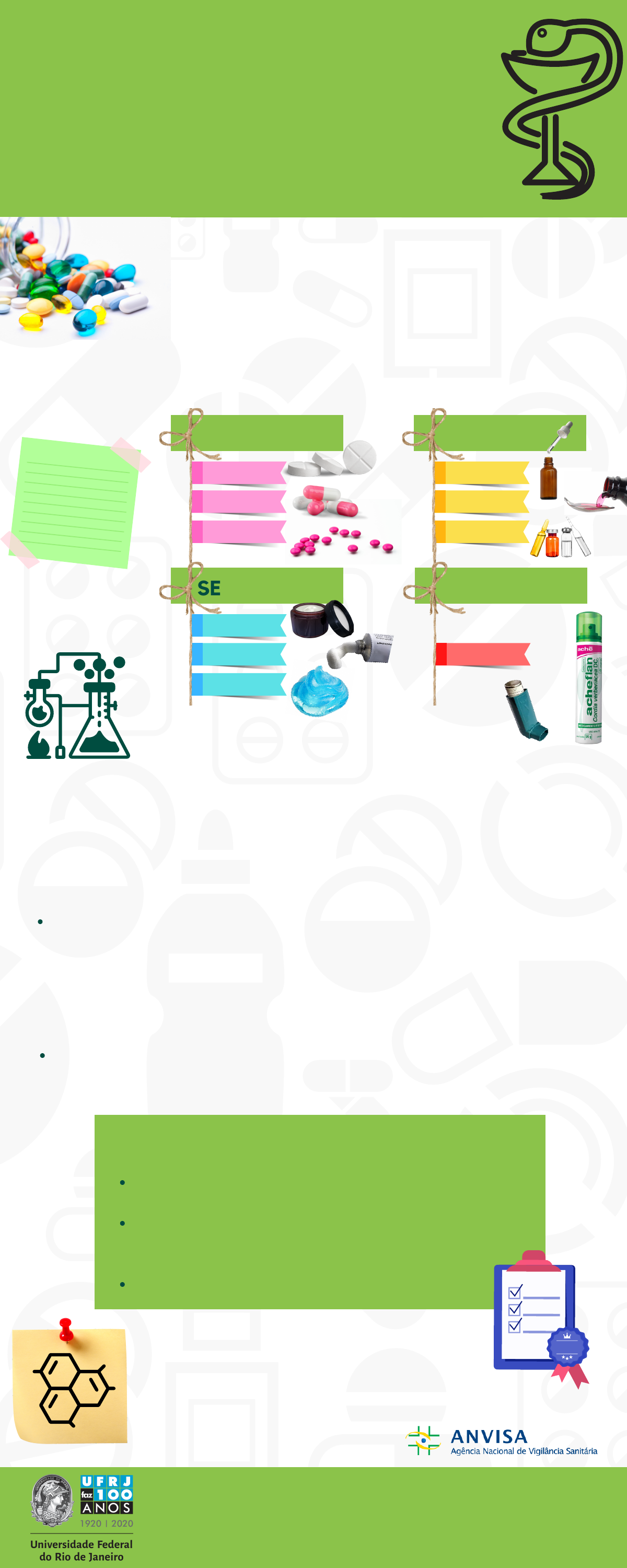 FONTE: WWW.SITEBACANA.COM.BR SÓLIDA SEMI-SÓLIDA LÍQUIDA GASOSA UNIVERSIDADE FEDERAL DO RIO DE JANEIRO PRODUÇÃO E CONTROLE DE QUALIDADE DE MEDICAMENTOS II CARLOS DANIEL DUTRA VALÉRIO POST - SEMANA 7 A forma farmacêutica serelaciona com a viade administraçãoque vai ser utilizada! FORMULAÇÃO FARMACÊUTICA Consiste na composição qualitativa e quantitativa do medicamento ou da forma farmacêutica, ou seja, a formulação especifica os componentes, que são o Insumo Farmacêutico Ativo e Excipientes, bem como a quantidade de cada um. FORMA FARMACÊUTICA GLOSSÁRIO: FORMULAÇÕES FARMACÊUTICAS Estado final de apresentação que os princípios ativos farmacêuticos possuem após uma ou mais operações farmacêuticas executadas com a adição de excipientes apropriados ou sem a adição de excipientes, a fim de facilitar a sua utilização e obter o efeito terapêutico desejado, com características apropriadas a uma determinada via de administração. Comprimidos Cápsulas Drágeas Soluções Xaropes Injetáveis Aerossóis Cremes Pomadas Géis Insumo Farmacêutico Ativo (IFA): substância introduzida na formulação de uma forma farmacêutica que, quando administrada em um paciente, atua como ingrediente ativo. Tem a capacidade de exercer atividade farmacológica ou outro efeito direto no diagnóstico, cura, tratamento ou prevenção de uma doença, podendo ainda afetar a estrutura e o funcionamento do organismo humano. Excipientes: qualquer componente, que não seja a substância ativa, adicionado intencionalmente à formulação de uma forma farmacêutica. Não interagir com o fármaco; Deve ser submetido, assim como os fármacos, à testes de controle de qualidade; Ter segurança avaliada. Características de um excipiente ideal: RDC Nº 34, DE 7 DE AGOSTO DE 2015 Dispõe sobre as Boas Práticas de Fabricação de Excipientes Farmacêuticos. UNIVERSIDADE FEDERAL DO RIO DE JANEIRO PRODUÇÃO E CONTROLE DE QUALIDADE DE MEDICAMENTOS II CARLOS DANIEL DUTRA VALÉRIO POST - SEMANA 7 Principais Excipientes para Formas Farmacêuticas Sólidas GLOSSÁRIO: FORMULAÇÕES FARMACÊUTICAS Diluente - substância inerte utilizada como agente de enchimento. Usado para criar volume desejado, propriedade de fluxo (para fluir) e as características de compressão nas preparações de comprimidos e cápsulas. (Exemplo: lactose, manitol, amido, celulose microcristalina). Aglutinante - substância utilizada para causar aderência nas partículas de pó no processo de granulação. Aumentam a coesão entre as partículas. (Exemplo: Amido, povidona, metilcelulose). Desagregante/Desintegrante - promove o rompimento da massa sólida em partículas menores, que acabam podendo se dispersar ou dissolver mais rapidamente. (Exemplo: Amido glicolato de sódio, amido, carboximetilcelulose reticulada, ácido tartárico, bicarbonato de sódio). Lubrificante - utilizado para diminuir o atrito durante a fluidez do material, facilitando o escoamento dos pós (para dentro das cápsulas por exemplo), otimizando o processo de fabricação do medicamento. (Exemplo: Estearato de magnésio, estearato de cálcio, estearato de zinco, talco). Agente de revestimento - protege da ação do trato gastrointestinal. Servem para cobrir o comprimido evitando degradação antes da hora, protege contra gosto ruim, altera o tempo de liberação do fármaco no organismo (retarda e prolonga a desagregação). (Exemplo: Açucarado (glicose, sacarose), película (Ethocel = etilcelulose ou hidroxipropilmetilcelulose), revestimento entérico (ftalato de acetato de celulose, goma laca)). Absorvente - também chamado de secante. Absorve umidade residual. (Exemplo: Carbonato de cálcio, talco, dióxido de silício coloidal). Tensoativo - melhora a absorção do fármaco, pois diminuem a tensão superficial das substâncias (principalmente da água por substâncias lipossolúveis), facilitando a dissolução. (Exemplo: Docusato sódico, LSS, polissorbatos, lecitina de soja). Agentes plastificantes - substâncias empregadas juntamente com polímeros para modificar a temperatura de transição de fase dos mesmos e, facilitar a coalescência do filme formado sobre os grânulos, comprimidos ou pellets. Torna a camada de revestimento mais uniformemente distribuída sobre o granulado, durante a preparação de cápsulas de liberação entérica. (Exemplos: glicerina, trietilcitrato, dibutilftalato, silicone, PPG). Principais Excipientes para Formas Farmacêuticas Líquidas Veículos - são agentes carreadores de substâncias farmacêuticas, são utilizados na preparação de líquidos orais e parenterais. (Exemplo: Álcool, água (água purificada, água para injeção, entre outras), oleaginosos (óleo de amendoim, óleo de gengibre, óleo mineral)). Agente de aumento de viscosidade - usado para alterar a consistência de uma formulação, fornecendo maior resistência ao escoamento. (Exemplo: ácido algínico, goma adragante, metilcelulose). Agente de tonicidade - usado para dar à solução características osmóticas semelhantes a dos líquidos fisiológicos (como as usadas no caso de colírios). (Exemplo: Cloreto de sódio, dextrose). Agente suspensor - usado para suspender as partículas sólidas no veículo, aumentando assim, a viscosidade do mesmo. (Exemplo: Ágar, caulim, metilcelulose, CMC, HMC, goma adragante). Agente antioxidante - substância empregada na tentativa de proteger a formulação de da deterioração por processos oxidativos. (Exemplo: Ácido ascórbico, metabissulfito de sódio). Agente acidificante e alcalinizante - substâncias utilizadas para acidificar ou alcalinizar o meio com objetivo de fornecer estabilidade ao fármaco. (Exemplo de acidificante: ácido acético, ácido cítrico, ácido fumárico; Exemplo de alcalinizante: hidróxido de sódio, trietanolamina, dietanolamina). Corantes - são substâncias puras ou compostas de origem orgânica ou inorgânica e suas misturas, destinadas a colorir a massa, próprias à f