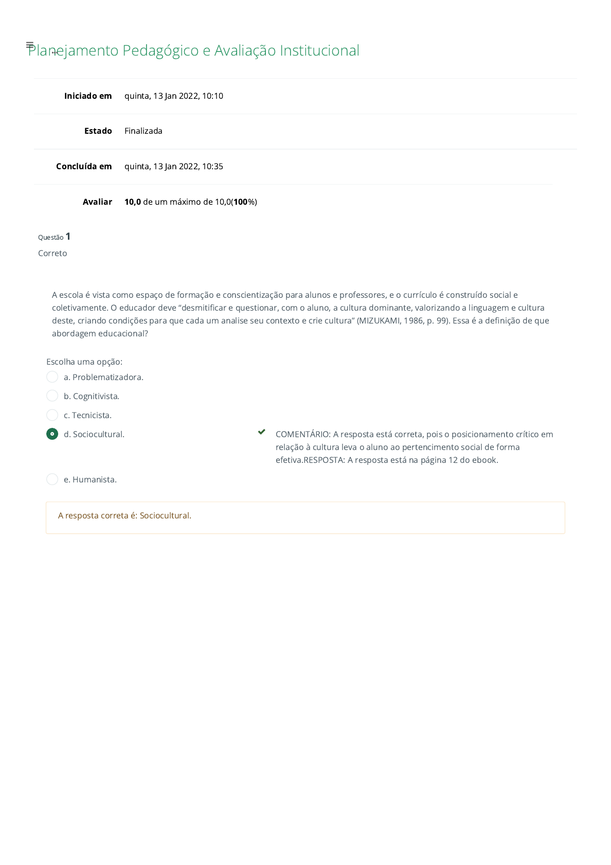 Planejamento Pedagógico e Avaliação Institucional Iniciado em quinta, 13 Jan 2022, 10:10 Estado Finalizada Concluída em quinta, 13 Jan 2022, 10:35 Avaliar 10,0 de um máximo de 10,0(100%) Questão 1 Correto A escola é vista como espaço de formação e conscientização para alunos e professores, e o currículo é construído social e coletivamente. O educador deve “desmiti�car e questionar, com o aluno, a cultura dominante, valorizando a linguagem e cultura deste, criando condições para que cada um analise seu contexto e crie cultura” (MIZUKAMI, 1986, p. 99). Essa é a de�nição de que abordagem educacional? Escolha uma opção: a. Problematizadora. b. Cognitivista. c. Tecnicista. d. Sociocultural. COMENTÁRIO: A resposta está correta, pois o posicionamento crítico em relação à cultura leva o aluno ao pertencimento social de forma efetiva.RESPOSTA: A resposta está na página 12 do ebook. e. Humanista. A resposta correta é: Sociocultural. https://aula.fael.edu.br/ Questão 2 Correto Questão 3 Correto Segundo o autor Fusari (1990), o ato de planejar envolve uma atitude crítica e articulada do educador diante de seu trabalho docente, por ser uma tarefa de caráter processual, e essa atividade não pode ser vista como tarefa mecanizada. O que ele quis dizer com isso? Escolha uma opção: a. O planejamento é uma atividade documental burocrática, necessária para a formalização do processo. b. O planejamento é um processo de re�exão sistematizada que permite ao docente prever as ações necessárias para suprir as necessidades a serem atendidas. COMENTÁRIO: A resposta está correta, pois o planejamento é um importante recurso que permite a atitude crítica e articulada do docente frente à realidade por ele vivenciada.RESPOSTA: A resposta está na página 4 do ebook. c. A orientação do trabalho pedagógico independe da sistematização das ideias. d. O planejamento é uma atividade prioritária da escola, devendo ser um regulador imune a possíveis variações. e. A sistematização dos processos é essencial para mantê-los inalterados. A resposta correta é: O planejamento é um processo de re�exão sistematizada que permite ao docente prever as ações necessárias para suprir as necessidades a serem atendidas. O planejamento educacional é um instrumento teórico-metodológico imprescindível à ação educativa. Ele representa a intenção, aquilo que se pretende fazer, modi�car ou manter. Assim, o planejamento atende a quatro níveis, a saber: Escolha uma opção: a. Macrocontexto, microcontexto, ensino, avaliação. b. Microcontexto, ensino, currículo e avaliação. c. Macrocontexto, microcontexto, ensino e currículo. COMENTÁRIO: A resposta está correta, pois o planejamento atende a contextos externos à escola, a contextos em relação à sua própria estrutura, a contextos ligados à forma do ensino e, diretamente, ao objeto de ensino (o que se pretende ensinar).RESPOSTA: A resposta está nas páginas 4 e 5 do ebook. d. Macrocontexto, microcontexto, currículo e avaliação. e. Macrocontexto, ensino, currículo e avaliação. A resposta correta é: Macrocontexto, microcontexto, ensino e currículo. https://aula.fael.edu.br/ Questão 4 Correto Questão 5 Correto O autor José Carlos Libâneo, no livro “Democratização da escola pública: a pedagogia crítico-social dos conteúdos”, apresenta uma tendência pedagógica que propõe uma síntese superadora das pedagogias tradicional e renovada, valorizando a ação pedagógica inserida na prática social concreta. Essa tendência se chama: Escolha uma opção: a. Tendência Pedagógica Renovada. b. Tendência Pedagógica Crítico- Social. COMENTÁRIO: Esta é a resposta correta, pois Libâneo apresenta uma tendência que entende a escola como mediação entre o individual e o social, exercendo a articulação entre a transmissão de conteúdos e a assimilação ativa por parte do aluno.RESPOSTA: A resposta está na página 11 do ebook. c. Tendência Pedagógica Progressista. d. Tendência Pedagógica Cognitivista. e. Tendência Pedagógica Humanista. A resposta correta é: Tendência Pedagógica Crítico-Social. É salutar que a instituição ____________a responsabilidade por sua gestão acadêmica, política e cientí�ca para promover o seu ____________________, aperfeiçoar e ampliar os serviços oferecidos a partir de seus próprios padrões de ________________, envolvendo a comunidade acadêmica e dialogando com o projeto _______________ que se pretende implementar. A alternativa que melhor completa as lacunas é: Escolha uma opção: a. Conheça, autoconhecimento, serviço, pedagógico. b. Assuma, desenvolvimento, qualidade, curricular. c. Assuma, autoconhecimento, qualidade, pedagógico. COMENTÁRIO: A resposta está correta, pois o desa�o da ISES é manter um diálogo efetivo com seu projeto pedagógico, legitimando- o.RESPOSTA: A resposta está na página 31 do ebook. d. Conheça, autoconhecimento, serviço, pedagógico. e. Assuma, desenvolvimento, qualidade, curricular. A resposta correta é: Assuma, autoconhecimento, qualidade, pedagógico. https://aula.fael.edu.br/ Questão 6 Correto Questão 7 Correto Na pesquisa realizada por Zainko (2013) sobre os cursos de licenciatura, evidenciou-se que algumas intencionalidades expressas nos documentos (PPC) não apresentavam clareza de como atingi-las. Entre elas a de: Escolha uma opção: a. Formar pro�ssionais críticos, competentes e responsáveis na sua prática pro�ssional. COMENTÁRIO: A resposta está correta, pois observou-se falha no planejamento e elaboração do PPC, que não apresentava diretrizes para a concretização do exposto.RESPOSTA: A resposta está nas páginas 29 e 30 do ebook. b. Formar pro�ssionais críticos e responsáveis na sua graduação. c. Formar pro�ssionais críticos e responsáveis na sua prática pro�ssional. d. Formar pro�ssionais competentes e responsáveis na sua prática pro�ssion