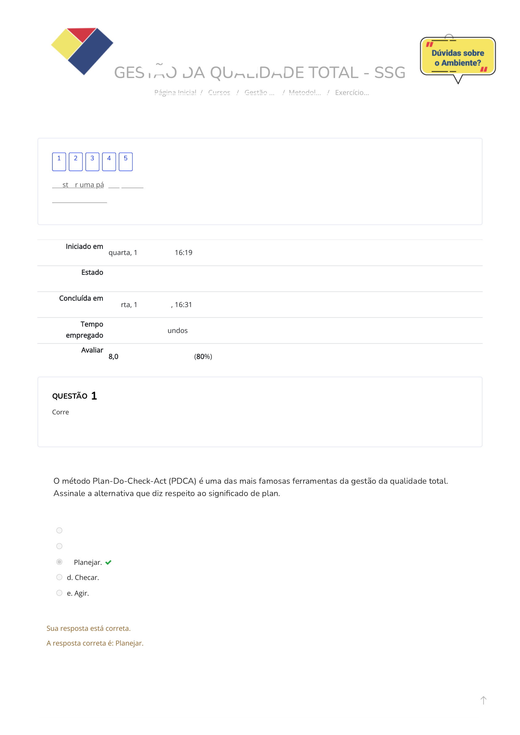 12/01/2022 16:32 Exercício de Fixação - Metodologia e Ferramentas de Qualidade: Revisão da tentativa https://cpetead.com.br/mod/quiz/review.php?attempt=1895367&cmid=41522 1/4 GESTÃO DA QUALIDADE TOTAL - SSG Página Inicial / Cursos / Gestão … / Metodol… / Exercício… Iniciado em quarta, 12 Jan 2022, 16:19 Estado Finalizada Concluída em quarta, 12 Jan 2022, 16:31 Tempo empregado 12 minutos 49 segundos Avaliar 8,0 de um máximo de 10,0(80%) QUESTÃO Correto Atingiu 2,0 de 2,0 Mostrar uma página por vez Terminar revisão 1 2 3 4 5 1 O método Plan-Do-Check-Act (PDCA) é uma das mais famosas ferramentas da gestão da qualidade total. Assinale a alternativa que diz respeito ao signi�cado de plan. Escolha uma opção: a. Fazer. b. De�nir. c. Planejar. d. Checar. e. Agir. Sua resposta está correta. A resposta correta é: Planejar. https://cpetead.com.br/ https://cpetead.com.br/course/index.php https://cpetead.com.br/course/view.php?id=272 https://cpetead.com.br/mod/quiz/view.php?id=41522 https://cpetead.com.br/mod/quiz/review.php?attempt=1895367&cmid=41522&showall=0 https://cpetead.com.br/mod/quiz/view.php?id=41522 https://cpetead.com.br/ 12/01/2022 16:32 Exercício de Fixação - Metodologia e Ferramentas de Qualidade: Revisão da tentativa https://cpetead.com.br/mod/quiz/review.php?attempt=1895367&cmid=41522 2/4 QUESTÃO Correto Atingiu 2,0 de 2,0 QUESTÃO Correto Atingiu 2,0 de 2,0 2 A MASP é formada por alguns passos que podem ajudar a organizar as ferramentos de forma produtiva, a �m de otimizar a análise e a solução de problemas. Dentre os passos, podemos citar: Escolha uma opção: a. Plan (planejar), Do (fazer), Check (checar)e Act (agir). b. Identi�cação do problema, Observação, Análise para descobrir causas, Plano de ação, Ação para eliminar as causas, Veri�cação da e�cácia da ação, Padronização, Conclusão. c. Seiton (senso da ordenação), Seiri (senso da utilização), Seisou (senso da limpeza), Seiketsu (senso da saúde), Shitsuke (senso da autodisciplina), diz respeito aos 5 S's. d. "D" De�nir, "M" Medir ", A" Analisar, "I" Implementar e "C" Controlar. e. Who (Quem?): Quem realizará as tarefas (responsabilidade), Why (Por que?): Por que deve ser executada a tarefa (justi�cativa), When (Quando?): Quando cada uma das tarefas deverá ser executada (tempo). Sua resposta está correta. A resposta correta é: Identi�cação do problema, Observação, Análise para descobrir causas, Plano de ação, Ação para eliminar as causas, Veri�cação da e�cácia da ação, Padronização, Conclusão. 3 Cinco palavras japonesas deram origem ao 5S's. "Identi�cação, classi�cação e remanejamento dos recursos que não são úteis ao �m desejado, além da eliminação de tarefas desnecessárias." O fragmento acima se refere a qual delas? Escolha uma opção: a. Seiri (senso da utilização). b. Seiton (senso de ordenação). c. Seiketsu (senso da saúde). d. Shitsuke (senso da autodisciplina). e. Seisou (senso da limpeza). Sua resposta está correta. A resposta correta é: Seiri (senso da utilização). 12/01/2022 16:32 Exercício de Fixação - Metodologia e Ferramentas de Qualidade: Revisão da tentativa https://cpetead.com.br/mod/quiz/review.php?attempt=1895367&cmid=41522 3/4 QUESTÃO Incorreto Atingiu 0,0 de 2,0 QUESTÃO Correto Atingiu 2,0 de 2,0 4 "Metodologia sistêmica para abordar casos que exigem tomada de decisão devido a situações insatisfatórias, desvio de padrão de desempenho esperado ou de um objetivo estabelecido, reconhecendo a necessidade de correção e seguindo alternativas de ação." A que se refere o fragmento acima? Escolha uma opção: a. PDCA. b. CQQ'S. c. 5W2H. d. MASP. e. DMAIC. Sua resposta está incorreta. A resposta correta é: MASP. 5 "O método é sequência lógica para o atendimento de uma meta, enquanto as ferramentas são os recursos utilizados para a sua realização. De�ne - de�nir; Measure - medir; Analyser - analisar; Improve - melhorar; Control - controlar." O fragmento acima se refere a qual método? Escolha uma opção: a. DMAIC. b. MASP. c. 5S. d. 5W2H. e. PDCA. Sua resposta está correta. A resposta correta é: DMAIC. 12/01/2022 16:32 Exercício de Fixação - Metodologia e Ferramentas de Qualidade: Revisão da tentativa https://cpetead.com.br/mod/quiz/review.php?attempt=1895367&cmid=41522 4/4 ◄ Leitura complementar Seguir para... Atividade Prática I ► Quem somos Cursos Certi�cação Unidades Contato Copyright © 2021 CPET - Centro de Pro�ssionalização e Educação Técnica https://cpetead.com.br/mod/resource/view.php?id=31249&forceview=1 https://cpetead.com.br/mod/assign/view.php?id=44722&forceview=1 https://www.cpet.com.br/quem-somos-cpet-cursos-tecnicos-a-distancia-ead/ https://www.cpet.com.br/course-cat/cursos/cursos-online/ https://www.cpet.com.br/certificacao-cpet/ https://www.cpet.com.br/unidades-cpet/ https://www.cpet.com.br/contato/ https://www.facebook.com/CPET-Centro-de-Profissionaliza%C3%A7%C3%A3o-e-Educa%C3%A7%C3%A3o-T%C3%A9cnica-1039179026236475/ https://twitter.com/soucpet/ https://www.instagram.com/soucpet/