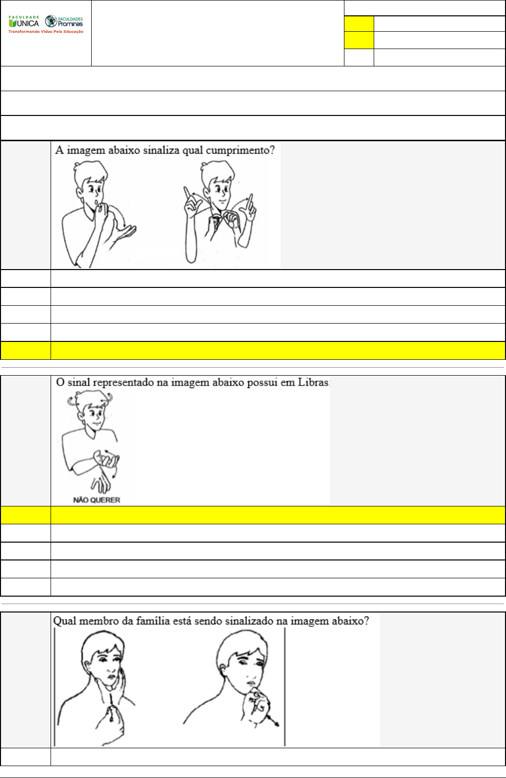 Pincel Atômico - 16/10/2021 19:08:12 1/4 FÁBIA MARIA DE OLIVEIRA FERREIRA Avaliação Online (SALA EAD) Atividade finalizada em 13/08/2021 13:40:23 (tentativa: 1) LEGENDA Resposta correta na questão # Resposta correta - Questão Anulada X Resposta selecionada pelo Aluno Disciplina: LIBRAS I [capítulos - 4,5,6] - Avaliação com 10 questões, com o peso total de 30,00 pontos Turma: Segunda Graduação: Letras - Libras para Licenciados - Grupo: MARÇO/2021 - SEGLETR-LIB/LICE [21462] Aluno(a): 91199281 - FÁBIA MARIA DE OLIVEIRA FERREIRA - Respondeu 9 questões corretas, obtendo um total de 27,00 pontos como nota Questão 001 “Olá!” “Boa tarde” “Boa noite” “Tudo bem?” X “Bom dia” Questão 002 Incorporação da negação. Adjetivo incorporado. Sinalização de nunca. X Negação. Sinal de negativo. Questão 003 Mãe. Pincel Atômico - 16/10/2021 19:08:12 2/4 Avó. Pai. Criança. X Avô. Questão 004 UDESC – 2012 A LIBRAS possui estrutura gramatical nos níveis fonológico, morfológico, sintático e semântico. Considerando estas características, relacione as colunas. (1) Espaço de realização dos sinais ( ) processo natural que acontece por contato social. (2) Empréstimo linguístico ( ) pessoa que está sinalizando. (3) Sinalizador ( ) local em frente ao corpo ou no próprio corpo do sinalizador onde os sinais são realizados. (4) Observador ( ) possui função descritiva, podendo detalhar um som, tamanho, textura, entre outros. (5) Classificadores ( ) pessoa que vê os sinais. Assinale a alternativa que contém a sequência correta, de cima para baixo. 3 – 2 – 5 – 4 – 1. 3 – 2 – 4 – 5 – 1. 1 – 3 – 2 – 4 – 5. 5 – 2 – 4 – 1 – 3. X 2 – 3 – 1 – 5 – 4. Questão 005 Descritivos. De número/plural. Instrumentais. X Especificadores. De corpo. Questão 006 Qual dos classificadores em Libras abaixo, nos remetem ao uso do computador? Abrir garrafa. X Usar mouse. Guardar moto. Passar páginas de caderno. Fechar porta. Pincel Atômico - 16/10/2021 19:08:12 3/4 Questão 007 Quando um surdo ao sinalizar a estória dos Três Porquinhos, realiza a incorporação do Lobo Mau derrubando a casa de um Porquinho com um sopro, ele está fazendo uso de qual classificador? Instrumentais. De número/plural. Descritivos. X De corpo. Especificadores. Questão 008 Complete a frase com a palavra sinalizada na imagem abaixo: “Eu terei prova de matemática na ___________ às 10h”. Terça-feira. Segunda-feira. # Quinta-feira. Sexta-feira. Quarta-feira. Questão 009 X Gostar. Conversar. Chamar. Querer. Falar. Questão 010 Conforme Ferreira-Brito (1995), por quantas configurações de mãos (CMs), a Língua Brasileira de Sinais é composta? 54. 36. 64. 72. X 46. Pincel Atômico - 16/10/2021 19:08:12 4/4
