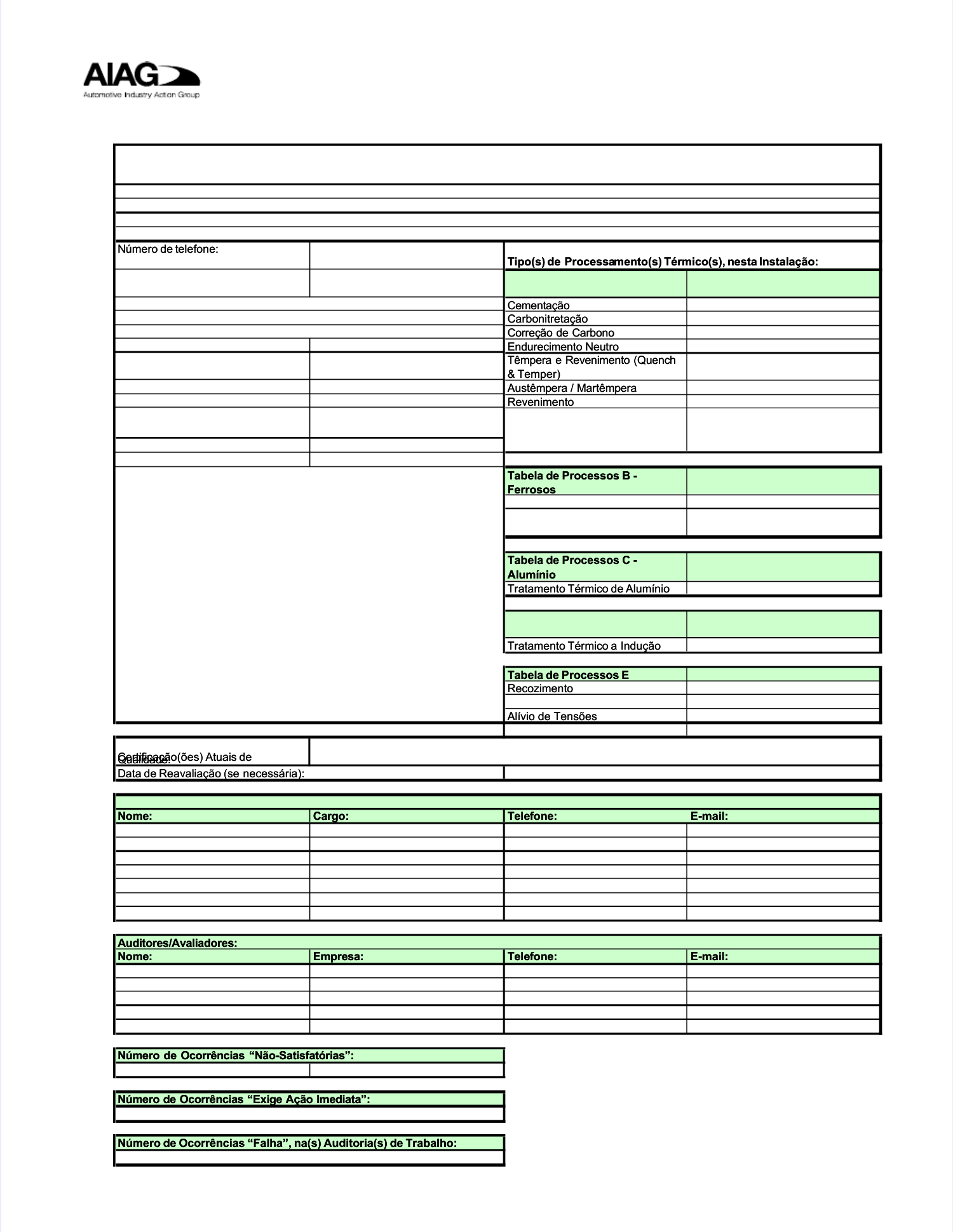 CQI-9CQI-9 Processo Especial: Avaliação de Sistema de TrProcesso Especial: Avaliação de Sistema de Tratamento Térmicoatamento Térmico Versão 2, Editada em 8/07Versão 2, Editada em 8/07 Nome da Instalação:Nome da Instalação: Número de telefone:Número de telefone: Número de Fax:Número de Fax: Tabela de Processos A -Tabela de Processos A - FerrososFerrosos CementaçãoCementação CarbonitretaçãoCarbonitretação Correção de CarbonoCorreção de Carbono TTrraattaaddoor r TTéérrmmiicco o CCaattiivvo o ((SS//NN)):: EEnndduurreecciimmeenntto o NNeeuuttrroo Têmpera e Revenimento (QuenchTêmpera e Revenimento (Quench & Temper)& Temper) TTrraattaaddoor r TTéérrmmiicco o CCoommeerrcciiaal l ((SS//NN)):: AAuussttêêmmppeerra a / / MMaarrttêêmmppeerraa RevenimentoRevenimento Data de Avaliação:Data de Avaliação: Data da Avaliação Anterior:Data da Avaliação Anterior: Tabela de Processos B -Tabela de Processos B - FerrososFerrosos Nitretação (Gás)Nitretação (Gás) NitrocementaçãNitrocementação-Ferrítica (Gás o-Ferrítica (Gás ouou Sal)Sal) Tabela de Processos C -Tabela de Processos C - AlumínioAlumínio Tratamento Térmico de AlumínioTratamento Térmico de Alumínio Tabela de Processos D -Tabela de Processos D - FerrososFerrosos Tratamento Térmico a Tratamento Térmico a InduçãoIndução Tabela de Processos ETabela de Processos E RecozimentoRecozimento NormalizaçãoNormalização Alívio de Tensões Alívio de Tensões NNoommee:: CCaarrggoo:: TTeelleeffoonnee:: NNoommee:: EEmmpprreessaa:: TTeelleeffoonnee:: Número de Ocorrências “Exige Ação Imediata”:Número de Ocorrências “Exige Ação Imediata”: Número de Ocorrências “Falha”, na(s) Auditoria(s) de Trabalho:Número de Ocorrências “Falha”, na(s) Auditoria(s) de Trabalho: Tipo(s) de Tipo(s) de ProcessaProcessamento(s) Térmico(s), nesta Instalação:mento(s) Térmico(s), nesta Instalação: Nº de Nº de EmpregadEmpregados em Tratamento Térmico, nesta os em Tratamento Térmico, nesta instalação:instalação: Processo Especial: Avaliação de Sistema de Tratamento TérmicoProcesso Especial: Avaliação de Sistema de Tratamento Térmico Endereço:Endereço: EndurecimeEndurecimento por nto por Precipitação /Precipitação / EnvelhecimentoEnvelhecimento Número de Ocorrências “Não-Satisfatórias”:Número de Ocorrências “Não-Satisfatórias”: Certificação(ões) Atuais deCertificação(ões) Atuais deQualidade:Qualidade: Data de Reavaliação (se Data de Reavaliação (se necessária):necessária): E-mail:E-mail: Auditores/Avaliadores:Auditores/Avaliadores: Pessoal Contatado:Pessoal Contatado: E-mail:E-mail: CQI-9CQI-9 Processo Especial: Avaliação de Sistema de TProcesso Especial: Avaliação de Sistema de Tratamento Térmicoratamento Térmico Versão 2, Editada em 8/07Versão 2, Editada em 8/07 QuestãoQuestão NúmeroNúmero QQuueessttããoo RReeqquuiissiittoos s e e OOrriieennttaaççõõeess EEvviiddêênncciia a oobbjjeettiivvaa NN//AA SSaattiissffaattóórriiaa NãoNão SatisfatóriaSatisfatória Exige AçãoExige Ação ImediataImediata 1.11.1 Existe no local uma Existe no local uma pessoapessoa dedicada e qualificada emdedicada e qualificada em tratamento térmico?tratamento térmico? Para assegurar expertise prontamente disponível, deve haver Para assegurar expertise prontamente disponível, deve haver no local uma pessoa dedicada e qualificada em tratamentono local uma pessoa dedicada e qualificada em tratamento térmico. Esta pessoa deve ser um térmico. Esta pessoa deve ser um empregadempregado em tempo total o em tempo total ee a sua posição deve estar registrada no organograma daa sua posição deve estar registrada no organograma da organização. Deve existir uma descrição do cargo, identificandoorganização. Deve existir uma descrição do cargo, identificando as qualificações para a as qualificações para a posição, incluindo conhecimento deposição, incluindo conhecimento de metalurgia e tratamento térmico.metalurgia e tratamento térmico. As qualificações d As qualificações devem incluir um mínevem incluir um mínimo de 5 anoimo de 5 anos des deexperiência em operações de tratamento térmico, ou umaexperiência em operações de tratamento térmico, ou uma combinação de um mínimo de 5 anos entre educação formalcombinação de um mínimo de 5 anos entre educação formal em metalurgia e experiência em tratamento térmico.em metalurgia e experiência em tratamento térmico. 1.21.2 O tratador térmico executaO tratador térmico executa planejamento avançado deplanejamento avançado de qualidade?qualidade? A organiza A organização deve incoção deve incorporar urporar um procedimenm procedimento documentato documentadodo de Planejamento Avançado da Qualidade do Produto (Advancede Planejamento Avançado da Qualidade do Produto (Advance Product and Quality Planning - APQP). Um estudo deProduct and Quality Planning - APQP). Um estudo de viabilidade deve ser executado e internamente aprovado paraviabilidade deve ser executado e internamente aprovado para cada peça. Peças similares podem ser agrupadas em famílias,cada peça. Peças similares podem ser agrupadas em famílias, para este objetivo, conforme definido pela organização. Após opara este objetivo, conforme definido pela organização. Após o Processo de Aprovação de Produção de Peças (ProductionProcesso de Aprovação de Produção de Peças (Production Part Approval Process - PPAP) ser Part Approval Process - PPAP) ser aprovado pelo cliente, nãoaprovado pelo cliente, não são permitidas alterações no processo, exceto se aprovadassão permitidas alterações no processo, exceto se aprovadas pelo cliente. O tratador térmico deve contatar o cliente, quandopelo cliente. O tratador térmico deve contatar o cliente, quando for requerida elucidação sobre alterações no processo. Estafor requerida elucidação sobre alterações no processo. Esta elu