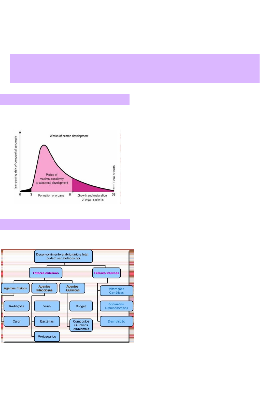 Teratologia Estudo das causas, mecanismos e padrões de desenvolvimento embrionário anormal que levam às anomalias congênitas. ATENÇÃO: MALFORMAÇÃO/ANOMALIA = defeito estrutural/funcional; MONSTRUOSIDADE = malformação grave e incompatível com a vida O efeito de agentes teratogênicos sobre um feto é mais crítico durante o PERÍODO EMBRIONÁRIO (4ª-8ª semana) = fase de formação dos órgãos *Período pré-embrionário -> aborto Fatores que podem INDUZIR ou AUMENTAR a incidência de malformações. A) FATORES AMBIENTAIS/EXTERNOS 1. Agentes infecciosos – compreendem os vírus e as infecções parasitárias. Exemplos: ▪ Rúbeola (vírus) – malformações ópticas, surdez, retardo mental, anomalias cardíacas ▪ Toxoplasmose (Toxoplasma gondii) – retardo mental, hidrocefalia, microcefalia ➔ PERÍODOS CRÍTICOS ➔ AGENTES TERATOGÊNICOS 2. Agentes químicos – envolvem substâncias químicas e drogas. Exemplos: ▪ Talidomida – medicamento usado contra náuseas e isônia; associado a deformações ósseas, anormalidades cardíacas e ausência total/parcial dos membros (amelia/focomelia) ▪ Aspirina – fenda palatina ▪ Álcool – Síndrome do alcoolismo fetal: anomalias cardíacas e articulares, microcefalia, hipoplasia maxilar, retardo mental ▪ Tabagismo – retardo do crescimento intrauterino 3. Agentes físicos – destaca-se a RADIAÇÃO. A exposição a altos níveis acaba por lesar células embrionárias, podendo provocar microcefalia, cegueira e defeitos das extremidades. 4. Fatores nutricionais/endócrinos* ▪ Carência de iodo/hipotireoidismo materno – pode provocar cretinismo (nanismo e retardo) ▪ Hormônios andrógenos – masculinização da genitália do feto B) FATORES GENÉTICOS/INTERNOS 1. Fatores gênicos – HERANÇA genética -> pelo menos um dos pais é portador de genes que causam uma anomalia transmissível a seus descendentes. Exemplos: acondroplasia, polidactilia 2. Fatores cromossômicos – alteração normalmente no NÚMERO de cromossomos do indivíduo causada pela não disjunção durante a meiose ou na segmentação. Exemplos: Síndrome de Down, Turner, Klinefelter Atenção! Os efeitos dos agentes teratogênicos estão sujeitos a dois fatores: CRONOLOGIA – dependendo da semana na qual o agente atue (idade gestacional), ele condicionará diferentes tipos de malformação CONSTITUIÇÃO DA ESPÉCIE – um agente pode ser teratogênico para uma espécie e não para outra Bruna Larissa → MED 52 Capacidade de um tecido de orientar a diferenciação e evolução de tecidos vizinhos (região organizadora) s *O desenvolvimento embrionário deve ser tido como uma série sucessiva de induções de ordem crescente. Assim, alterações* nos INDUTORES (binômio crescimento-diferenciação) resultam em possíveis malformações, como por exemplo: • AGENESIA – ausência total/parcial de um órgão (ausência de estimulo indutor) anencefalia, agenesia dental • APLASIA – esboço embrionário; desenvolvimento incompleto de uma região ou órgão microcefalia • HIPOPLASIA – deficiência na formação; órgão menor e com função reduzida • ESTRUTURAS EXTRANUMERÁRIAS – subdivisão de estímulos indutores polidactilia • FUSÃO – união de estruturas que normalmente seriam separadas (possível fusão de estímulos indutores) ciclopia, sirenomielia (fusão de membros) • ECTOPIA – localização incomum de determinado órgão/estrutura (estímulo indutor fora do local habitual) criptorquirdia • TERATOMA – tumor sem forma; comum no período pré-embrionário (ação indutora desordenada) ➔ INDUÇÃO EMBRIONÁRIA Fenômeno descoberto pelo biólogo alemão Hans Spemann através da realização de experimentos com embriões de anfíbios urodelos