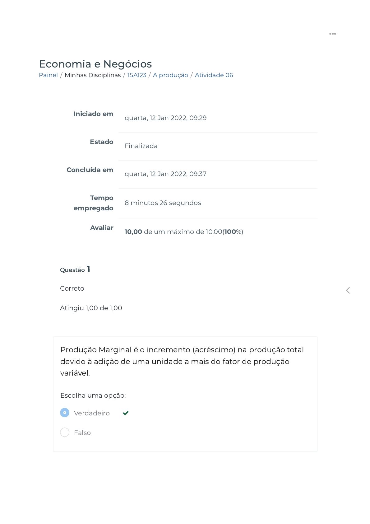 17/01/2022 23:24 Atividade 06 https://ava.politecnicabr.com.br/mod/quiz/review.php?attempt=2495379 1/7 Painel / Minhas Disciplinas / 15A123 / A produção / Atividade 06 Economia e Negócios Iniciado em quarta, 12 Jan 2022, 09:29 Estado Finalizada Concluída em quarta, 12 Jan 2022, 09:37 Tempo empregado 8 minutos 26 segundos Avaliar 10,00 de um máximo de 10,00(100%) Questão 1 Correto Atingiu 1,00 de 1,00 Produção Marginal é o incremento (acréscimo) na produção total devido à adição de uma unidade a mais do fator de produção variável. Escolha uma opção: Verdadeiro Falso https://ava.politecnicabr.com.br/my/ https://ava.politecnicabr.com.br/course/view.php?id=882 https://ava.politecnicabr.com.br/course/view.php?id=882#section-7 https://ava.politecnicabr.com.br/mod/quiz/view.php?id=23966 https://ava.politecnicabr.com.br/ 17/01/2022 23:24 Atividade 06 https://ava.politecnicabr.com.br/mod/quiz/review.php?attempt=2495379 2/7 Questão 2 Correto Atingiu 1,00 de 1,00 A produção é o segundo fenômeno da vida econômica. É por meio da produção de bens e/ou serviços que uma sociedade busca dar atendimento às necessidades humanas, gerando uma gama de bens e/ou serviços que os ofertantes colocam no mercado. Escolha uma opção: Questão 3 Correto Atingiu 1,00 de 1,00 Setor secundário considera as empresas (�rmas) cujas atividades se desenvolvem junto à base dos recursos naturais. Exemplos: agricultura, extrativismo mineral e vegetal etc. Escolha uma opção: Verdadeiro Falso Verdadeiro Falso https://ava.politecnicabr.com.br/ 17/01/2022 23:24 Atividade 06 https://ava.politecnicabr.com.br/mod/quiz/review.php?attempt=2495379 3/7 Questão 4 Correto Atingiu 1,00 de 1,00 Fator Trabalho Humano (TH) Tem sua origem na população, destacando-se nessa a parcela da população apta ao trabalho que esteja voltada ao mercado de trabalho E é a mão de obra. Composto pelos homens que organizam e conduzem a produção. Escolha uma opção: Questão 5 Correto Atingiu 1,00 de 1,00 Produção é um processo segundo o qual uma �rma, valendo-se dos recursos de produção, produz bens e/ou serviços que serão não colocados à venda no mercado. Escolha uma opção: Verdadeiro Falso Verdadeiro Falso https://ava.politecnicabr.com.br/ 17/01/2022 23:24 Atividade 06 https://ava.politecnicabr.com.br/mod/quiz/review.php?attempt=2495379 4/7 Questão 6 Correto Atingiu 1,00 de 1,00 Bens �nais São os que já passaram por todas as transformações necessárias estando, pois, prontos para serem utilizados pela coletividade do sistema econômico. Exemplo: automóvel, vestuário etc. Os bens �nais admitem ainda uma subdivisão: bens de capital – são os bens que visam atender diretamente uma necessidade humana. Exemplos: alimentos, automóveis, transportes etc. bens de consumo – são os bens que têm por objetivo produzirem outros bens e/ou serviços, aumentando a produtividade do fator Trabalho Humano. São também considerados bens de produção. Exemplos: máquinas industriais, equipamentos etc. Escolha uma opção: Verdadeiro Falso https://ava.politecnicabr.com.br/ 17/01/2022 23:24 Atividade 06 https://ava.politecnicabr.com.br/mod/quiz/review.php?attempt=2495379 5/7 Questão 7 Correto Atingiu 1,00 de 1,00 Firma é uma unidade básica da produção. Usa fatores de produção, como insumos e bens semielaborados, e produz bens e/ou serviços. Escolha uma opção: Questão 8 Correto Atingiu 1,00 de 1,00 O setor terciário Considera as atividades relacionadas à produção de serviços. Exemplos: transportes, saúde, comércio etc. Escolha uma opção: Verdadeiro Falso Verdadeiro Falso https://ava.politecnicabr.com.br/ 17/01/2022 23:24 Atividade 06 https://ava.politecnicabr.com.br/mod/quiz/review.php?attempt=2495379 6/7 Questão 9 Correto Atingiu 1,00 de 1,00 Bens intermediários são os que ainda não estão prontos. Precisam sofrer novas transformações e/ou adaptações antes de serem considerados bens �nais. Escolha uma opção: Questão 10 Correto Atingiu 1,00 de 1,00 O Fator Recursos sociais trata-se dos elementos da natureza que podem ter utilização econômica, que podem, en�m, ser utilizados na produção de bens e/ou serviços. Exemplos: solos agriculturáveis, jazidas minerais etc. Escolha uma opção: Verdadeiro Falso Verdadeiro Falso https://ava.politecnicabr.com.br/ 17/01/2022 23:24 Atividade 06 https://ava.politecnicabr.com.br/mod/quiz/review.php?attempt=2495379 7/7 © 2020 - Escola Politécnica Brasileira Entre em Contato https://www.politecnicabr.com.br 0800 084 2627 indisponível devido a pandemia de COVID-19, use outro canal! 0800 084 2627 comercial@politecnicabr.com.br Links Úteis Dicas da nossa Diretora Acadêmica Planner de Estudos Declaração de Matrícula Orientações do AVA Abertura de Ticket Fale com o Tutor Cronograma de Estudos Manual de Estágio Manual de Competência Siga-nos nas redes sociais https://ava.politecnicabr.com.br/mod/quiz/0 https://www.politecnicabr.com.br/ mailto:comercial@politecnicabr.com.br https://soundcloud.com/user-501638417/sets/escola-politecnica-brasileira https://storage.googleapis.com/sirius-pubstore/semestre_plannerdeestudo%20poli.pdf https://storage.googleapis.com/sirius-pubstore/declaracao_matricula.pdf https://storage.googleapis.com/sirius-pubstore/orientacoes_ava.pdf https://storage.googleapis.com/sirius-pubstore/abertura_ticket.pdf https://storage.googleapis.com/sirius-pubstore/fale_com_tutor.pdf https://storage.googleapis.com/sirius-pubstore/cronograma_estudos.pdf https://storage.googleapis.com/sirius-pubstore/manual_estagio.pdf https://storage.googleapis.com/sirius-pubstore/manual_competencia.pdf https://www.facebook.com/politecnicabr https://www.instagram.com/politecnicabr_oficial https://ava.politecnicabr.com.br/