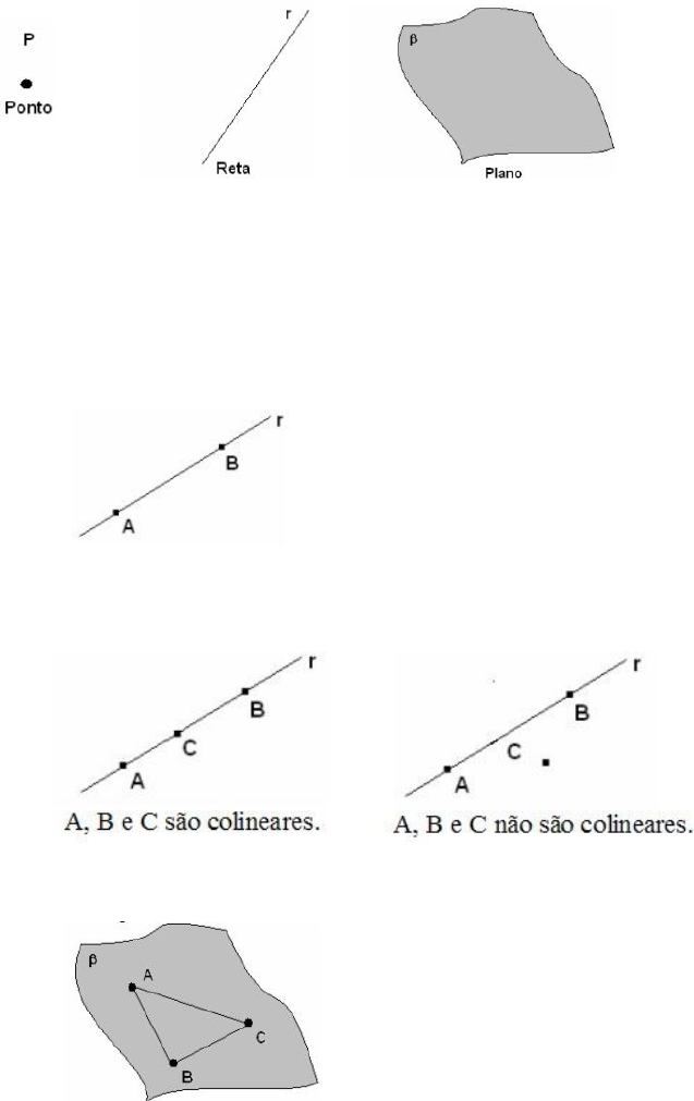 Ponto, Reta e Plano A definição dos entes primitivos ponto, reta e plano é quase impossível, o que se sabe muito bem e aqui será o mais importante é sua representação geométrica e espacial. Representação, (notação) → Pontos serão representados por letras latinas maiúsculas; ex: A, B, C,… → Retas serão representados por letras latinas minúsculas; ex: a, b, c,… → Planos serão representados por letras gregas minúsculas; ex: β,∞,α,... Representação gráfica Postulados primitivos da geometria, qualquer postulado ou axioma é aceito sem que seja necessária a prova, contanto que não exista a contraprova. - Numa reta bem como fora dela há infinitos pontos distintos. - Dois pontos determinam uma única reta (uma e somente uma reta). - Pontos colineares pertencem à mesma reta. - Três pontos determinam um único plano. - Se uma reta contém dois pontos de um plano, esta reta está contida neste plano. - Duas retas são concorrentes se tiverem apenas um ponto em comum. Observe que . Sendo que H está contido na reta r e na reta s. Um plano é um subconjunto do espaço R3 de tal modo que quaisquer dois pontos desse conjunto podem ser ligados por um segmento de reta inteiramente contida no conjunto. Um plano no espaço R3 pode ser determinado por qualquer uma das situações: - Três pontos não colineares (não pertencentes à mesma reta); - Um ponto e uma reta que não contem o ponto; - Um ponto e um segmento de reta que não contem o ponto; - Duas retas paralelas que não se sobrepõe; - Dois segmentos de reta paralelos que não se sobrepõe; - Duas retas concorrentes; - Dois segmentos de reta concorrentes. Duas retas (segmentos de reta) no espaço R3 podem ser: paralelas, concorrentes ou reversas. Duas retas são ditas reversas quando uma não tem interseção com a outra e elas não são paralelas. Pode-se pensar de uma reta r desenhada no chão de uma casa e uma reta s desenhada no teto dessa mesma casa. Uma reta é perpendicular a um plano no espaço R3, se ela intersecta o plano em um ponto P e todo segmento de reta contido no plano que tem P como uma de suas extremidades é perpendicular à reta. Uma reta r é paralela a um plano no espaço R3, se existe uma reta s inteiramente contida no plano que é paralela à reta dada. Seja P um ponto localizado fora de um plano. A distância do ponto ao plano é a medida do segmento de reta perpendicular ao plano em que uma extremidade é o ponto P e a outra extremidade é o ponto que é a interseção entre o plano e o segmento. Se o ponto P estiver no plano, a distância é nula. Planos concorrentes no espaço R3 são planos cuja interseção é uma reta. Planos paralelos no espaço R3 são planos que não tem interseção. Quando dois planos são concorrentes, dizemos que tais planos formam um diedro e o ângulo formado entre estes dois planos é denominado ângulo diedral. Para obter este ângulo diedral, basta tomar o ângulo formado por quaisquer duas retas perpendiculares aos planos concorrentes. Planos normais são aqueles cujo ângulo diedral é um ângulo reto (90 graus). Razão entre Segmentos de Reta Segmento de reta é o conjunto de todos os pontos de uma reta que estão limitados por dois pontos que são as extremidades do segmento, sendo um deles o ponto inicial e o outro o ponto final. Denotamos um segmento por duas letras como, por exemplo, AB, sendo A o início e B o final do segmento. Exemplo AB é um segmento de reta que denotamos por AB. A _____________ B Não é possível dividir um segmento de reta por outro, mas é possível realizar a divisão entre as medidas dos dois segmentos. Consideremos os segmentos AB e CD, indicados: A ________ Bm(AB) = 2cm C ______________ D m(CD) = 5 cm A razão entre os segmentos AB e CD, denotado aqui por, AB/CD, é definida como a razão entre as medidas desses segmentos, isto é: AB/CD = 2/5 Segmentos Proporcionais Proporção é a igualdade entre duas razões equivalentes. De forma semelhante aos que já estudamos com números racionais, é possível estabelecer a proporcionalidade entre segmentos de reta, através das medidas desse segmentos. Vamos considerar primeiramente um caso particular com quatro segmentos de reta: m(AB) = 2cm A______B P__________Q m(PQ) =4 cm m(CD) = 3cm C__________D R___________________S m(RS) = 6cm A razão entre os segmentos AB e CD e a razão entre os segmentos PQ e RS, são dadas por frações equivalentes, isto é: AB/CD = 2/3; PQ/RS = 4/6 e como 2/3 = 4/6, segue a existência de uma proporção entre esses quatro segmentos de reta. Isto nos conduz à definição de segmentos proporcionais. Diremos que quatro segmentos de reta, AB, BC, CD e DE, nesta ordem, são proporcionais se: AB/BC = CD/DE Os segmentos AB e DE são os segmentos extremos e os segmentos BC e CD são os segmentos meios. A proporcionalidade acima é garantida pelo fato que existe uma proporção entre os números reais que representam as medidas dos segmentos: Propriedade Fundamental das proporções: Numa proporção de segmentos, o produto das medidas dos segmentos meios é igual ao produto das medidas dos segmentos extremos. m(AB) · m(DE) = m(BC) · m(CD) Feixe de Retas Paralelas Um conjunto de três ou mais retas paralelas num plano é chamado feixe de retas paralelas. A reta que intercepta as retas do feixe é chamada de reta transversal. As retas A, B, C e D que aparecem no desenho anexado, formam um feixe de retas paralelas enquanto que as retas S e T são retas transversais. Teorema de Tales: Um feixe de retas paralelas determina sobre duas transversais quaisquer, segmentos proporcionais. A figura abaixo representa uma situação onde aparece um feixe de três retas paralelas cortadas por duas retas transversais. Identificamos na sequência algumas proporções: AB/BC = DE/EF BC/AB = EF/DE AB/DE = BC/EF DE/AB = EF/BC Exemplo Consideremos a figura ao lado com um feixe de retas paralelas, sendo as medidas dos segmentos indicadas em centímetros. Assim: B