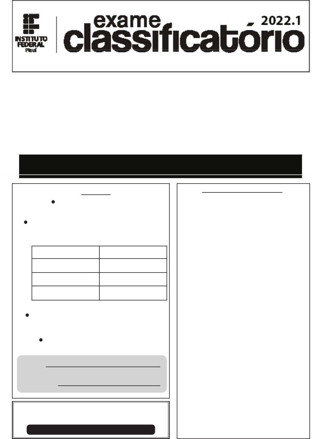 LEIA AS INSTRUÇÕES ABAIXO • Após identificado e instalado na sala, você não poderá consultar qualquer material, enquanto aguarda o horário de início da prova. • Siga, atentamente, a forma correta de preenchimento do Cartão de Repostas, conforme estabelecido no mesmo. • Não haverá substituição do Cartão de Respostas por erro do candidato. • Ao terminar a prova, é de sua responsabilidade entregar ao fiscal o Cartão de Respostas assinado. Não se esqueça dos seus pertences. • Os três últimos candidatos deverão permanecer na sala até que o último candidato entregue o Cartão de Respostas. • O fiscal de sala não está autorizado a alterar nenhuma dessas instruções. Em caso de dúvida, solicite a presença do coordenador local. Por motivo de segurança: • O candidato só poderá retirar-se definitivamente da sala após 1 (uma) hora do início efetivo da prova; • Somente faltando 1 (uma) hora para o término da prova, o candidato poderá retirar-se levando o seu Caderno de Questões; • O candidato que optar por retirar-se sem levar o seu Caderno de Questões, não poderá copiar suas respostas por qualquer meio. O descumprimento dessa determinação será registrado em ata e acarretará a eliminação do candidato; • Ao terminar a prova, o candidato deverá retirar- se imediatamente do local, não sendo possível nem mesmo a utilização dos banheiros e/ou bebedouros. DURAÇÃO DA PROVA: 4 HORAS PROVA DE MÚLTIPLA ESCOLHA, CADA QUESTÃO COM 5 (CINCO) ALTERNATIVAS DE RESPOSTA - A, B, C, D e E - CONFORME DISPOSIÇÃO ABAIXO VERIFIQUE SE ESTE MATERIAL ESTÁ EM ORDEM, CASO CONTRÁRIO, NOTIFIQUE IMEDIATAMENTE O FISCAL RESERVE OS 30 (TRINTA) MINUTOS FINAIS PARA MARCAR SEU CARTÃO DE RESPOSTAS. ATENÇÃO Disciplinas Quantidade de questões Língua Portuguesa 30 Matemática 30 Total 60 BOA PROVA! www.ifpi.edu.br Nome: Inscrição: CADERNO DE QUESTÕES ENSINO TÉCNICO (INTEGRADO) EDITAL 33/2021 - PROEN/REI/, de 3 de novembro de 2021 16 DE JANEIRO DE 2022 Página 2 EXAME CLASSIFICATÓRIO 2022.1 FORMA DE ENSINO: INTEGRADO 02. Releia atentamente o conto “A princesa e a rã” e julgue os itens a seguir. I – O texto é uma paródia de um conto de fadas tradicional. II – Quem escreveu o texto quebra a expectativa do leitor ao criar um fi nal diferente daquele presente nos contos de fadas tradicionais III – O texto reforça os valores sociais e históricos apresentados nos contos de fadas tradicionais. Está correto o que se afi rma em: a) I, apenas. b) II, apenas. c) III, apenas. d) I e II, apenas. e) I e III, apenas. 03. Típica dos contos de fadas, a expressão “Era uma vez” indica a ideia de a) lugar b) modo c) fi nalidade d) tempo e) consequência 04. Na oração “linda princesa, eu já fui um príncipe muito bonito”, a expressão destacada é um exemplo de a) sujeito b) predicativo c) objeto direto d) complemento verbal e) vocativo PORTUGUÊS TEXTO I A princesa e a rã Era uma vez... numa terra muito distante... uma princesa linda, independente e cheia de autoestima. Ela se deparou com uma rã enquanto contemplava a natureza e pensava em como o maravilhoso lago do seu castelo era relaxante e ecológico... Então, a rã pulou para o seu colo e disse: linda princesa, eu já fui um príncipe muito bonito. Uma bruxa má lançou-me um encanto e transformei-me nesta rã asquerosa. Um beijo teu, no entanto, há de me transformar de novo num belo príncipe e poderemos casar e constituir lar feliz no teu lindo castelo. A tua mãe poderia vir morar conosco e tu poderias preparar o meu jantar, lavar as minhas roupas, criar os nossos fi lhos e seríamos felizes para sempre... Naquela noite, enquanto saboreava pernas de rã sautée, acompanhadas de um cremoso molho acebolado e de um fi níssimo vinho branco, a princesa sorria, pensando consigo mesma: - Eu, hein? Nem morta! (Autoria desconhecida) 01. Esse texto é um conto, um gênero textual marcado pela predominância da a) descrição b) narração c) argumentação d) opinião e) exposição Página 3 EXAME CLASSIFICATÓRIO 2022.1 FORMA DE ENSINO: INTEGRADO 05. Releia o seguinte trecho: “transformei- me nesta rã asquerosa”. A expressão destacada pode ser substituída, sem prejudicar o sentido do texto, por: a) venenosa b) agressiva c) traiçoeira d) pequenina e) nojenta 06. No fragmento “Um beijo teu, no entanto, há de me transformar de novo num belo príncipe”, a conjunção destacada expressa o valor de a) adição b) comparação c) oposição d) justifi cativa e) explicação 07. A fala da princesa no fi nal do texto (“Eu, hein? Nem morta!”) equivale ao seguinte provérbio popular: a) A pressa é inimiga da perfeição. b) Água mole em pedra dura tanto bate até que fura. c) Casa de ferreiro, espeto de pau. d) De grão em grão, a galinha enche o papo. e) Antes só do que mal acompanhado. TEXTO II Disponível em: www.facebook.com/psicologafer- nandarocha Acesso em: 22 de novembro de 2021 08. Analisando os textos I e II, é correto dizer que as ações das duas princesas são a) equivalentes b) incompatíveis c) divergentes d) incoerentes e) contraditórias 09. Do ponto de vista sintático, o verbo BEIJAR, no primeiro quadrinho do texto II, é classifi cado como a) transitivo direto b) transitivo indireto c) transitivo direto e indireto d) intransitivo e) de ligação 10. “Príncipe”, palavra presente no 1º quadrinho, é um exemplo de proparoxítona. Identifi que a alternativa em que todas as palavras estão acentuadas adequadamente. a) âncora – bebê – mínimo b) índio – alguém – raíz c) incrível – fl ôr - cajú d) inútil – simpático – higiêne e) estático – ítem – tecnológico 11. Na oração “Prefi ro ter um sapo que fala”, a palavra destacada, do ponto de vista morfológico, é um exemplo de pronome a) indefi nido b) relativo c) possessivo d) demonstrativo e) interrogativo Página 4 EXAME CLASSIFICATÓRIO 2022.1 FORMA DE ENSINO: INTEGRADO Obser