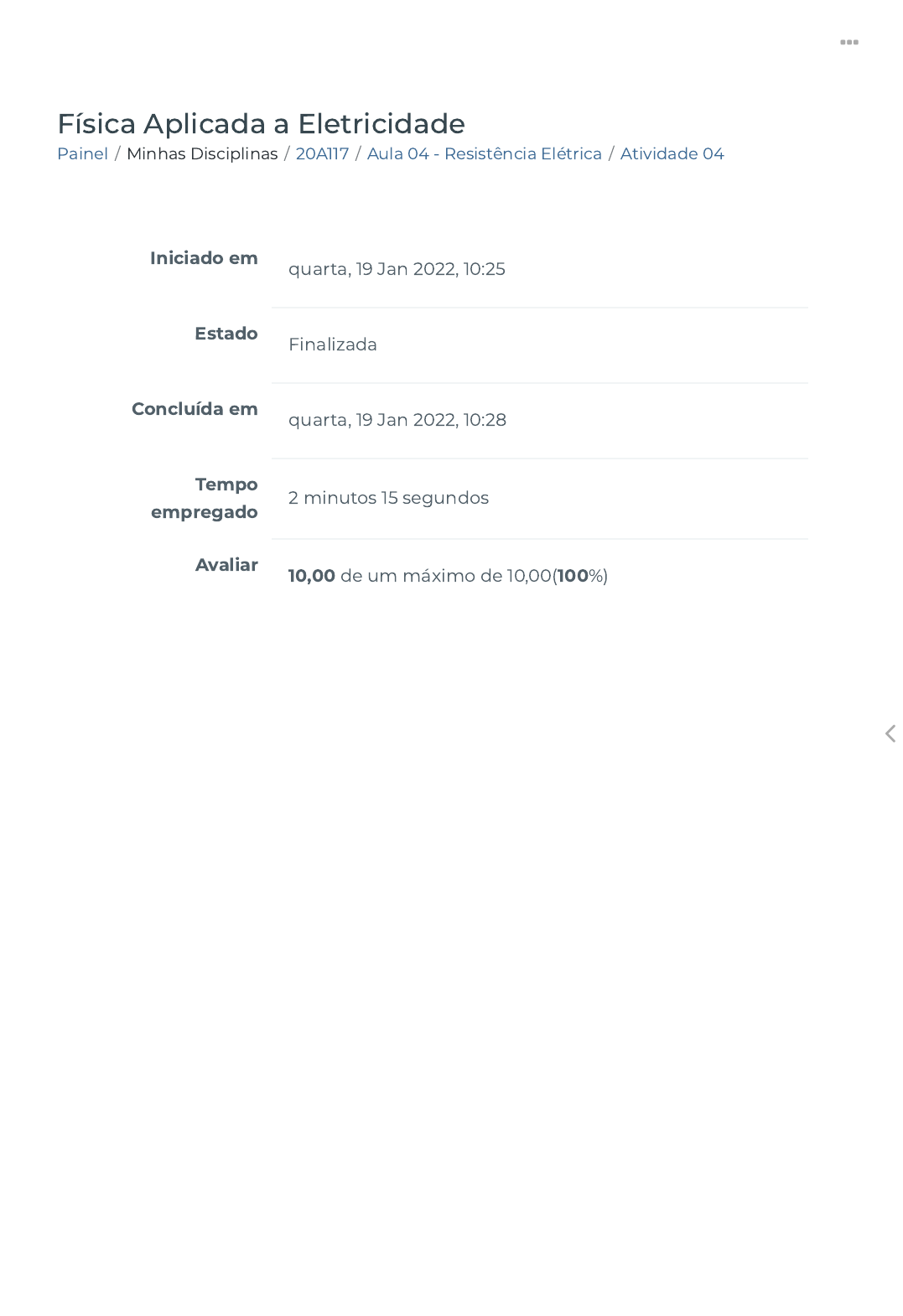 Painel / Minhas Disciplinas / 20A117 / Aula 04 - Resistência Elétrica / Atividade 04 Física Aplicada a Eletricidade Iniciado em quarta, 19 Jan 2022, 10:25 Estado Finalizada Concluída em quarta, 19 Jan 2022, 10:28 Tempo empregado 2 minutos 15 segundos Avaliar 10,00 de um máximo de 10,00(100%) https://ava.politecnicabr.com.br/my/ https://ava.politecnicabr.com.br/course/view.php?id=953 https://ava.politecnicabr.com.br/course/view.php?id=953#section-5 https://ava.politecnicabr.com.br/mod/quiz/view.php?id=25935 https://ava.politecnicabr.com.br/ Questão 1 Completo Atingiu 2,00 de 2,00 (AFA) Um �o de cobre com resistividade 1,69 x 10 W*m é enrolado em um suporte cilíndrico, com raio 10 cm, com 500 voltas. Sendo o raio do �o 2 mm, sua resistência elétrica, em ohms, é Escolha uma opção: - 8 a. 42,00 b. 0,42 c. 420,00 d. 4,20 https://ava.politecnicabr.com.br/ Questão 2 Completo Atingiu 2,00 de 2,00 A resistência elétrica do corpo de uma certa pessoa é de 10 Ω. Se esta pessoa, estando descalça sobre uma superfície condutora, descuidadamente, encostar a mão num �o desencapado, com um potencial elétrico de 220 V em relação à superfície e, em função disso, levar um choque, a intensidade da corrente elétrica que atravessará o seu corpo será de? Escolha uma opção: a. 220 A b. 22 A c. 0,22 A d. 2,2 A https://ava.politecnicabr.com.br/ Questão 3 Completo Atingiu 2,00 de 2,00 (UFMA) A resistividade dos metais pode ser elevada pelo aumento da temperatura e/ou pela adição de soluto na matriz metálica. Esses dois procedimentos causam a diminuição do grau de perfeição da rede cristalina e isso leva a um aumento no número de colisões entre os elétrons livres e outras partículas presentes no metal. A consequência direta disso é a diminuição no(a): Escolha uma opção: a. número de íons b. número de elétrons livres c. mobilidade dos elétrons livres d. mobilidade dos íons https://ava.politecnicabr.com.br/ Questão 4 Completo Atingiu 2,00 de 2,00 Um resistor de 10 ohm é ligado a uma bateria de 10 V por meio de um �o. Se o raio do �o é de 3 mm, a quantidade de carga elétrica que atravessa uma secção do �o por unidade de tempo e por unidade de área em [C/(s*cm )] é aproximadamente Escolha uma opção: 2 a. 35,4 b. 0,354 c. 3,54 d. 354 https://ava.politecnicabr.com.br/ Questão 5 Completo Atingiu 2,00 de 2,00 (FMTM) Uma companhia distribuidora de eletricidade utiliza em seus postes de transmissão dois tipos de cabos. Os dois modelos de cabos são constituídos por �os cilíndricos de alumínio com resistividade igual a 2,8.10 W*m. Um modelo é constituído por um maço de 7 �os de alumínio enquanto que o outro é constituído por um maço de 19 �os. Considerando-se que os �os têm comprimentos iguais, a relação entre as resistências elétricas do cabo mais �no em comparação ao cabo mais grosso é, aproximadamente Escolha uma opção: -8 a. 0,4 b. 26 c. 12 d. 2,7 Entre em Contato https://www.politecnicabr.com.br 0800 084 2627 indisponível devido a pandemia de COVID-19, use outro canal! 0800 084 2627 comercial@politecnicabr.com.br Links Úteis Dicas da nossa Diretora Acadêmica Planner de Estudos Declaração de Matrícula Orientações do AVA Abertura de Ticket Fale com o Tutor https://www.politecnicabr.com.br/ mailto:comercial@politecnicabr.com.br https://soundcloud.com/user-501638417/sets/escola-politecnica-brasileira https://storage.googleapis.com/sirius-pubstore/semestre_plannerdeestudo%20poli.pdf https://storage.googleapis.com/sirius-pubstore/declaracao_matricula.pdf https://storage.googleapis.com/sirius-pubstore/orientacoes_ava.pdf https://storage.googleapis.com/sirius-pubstore/abertura_ticket.pdf https://storage.googleapis.com/sirius-pubstore/fale_com_tutor.pdf https://ava.politecnicabr.com.br/ © 2020 - Escola Politécnica Brasileira Cronograma de Estudos Manual de Estágio Manual de Competência Siga-nos nas redes sociais https://ava.politecnicabr.com.br/mod/quiz/0 https://storage.googleapis.com/sirius-pubstore/cronograma_estudos.pdf https://storage.googleapis.com/sirius-pubstore/manual_estagio.pdf https://storage.googleapis.com/sirius-pubstore/manual_competencia.pdf https://www.facebook.com/politecnicabr https://www.instagram.com/politecnicabr_oficial https://ava.politecnicabr.com.br/