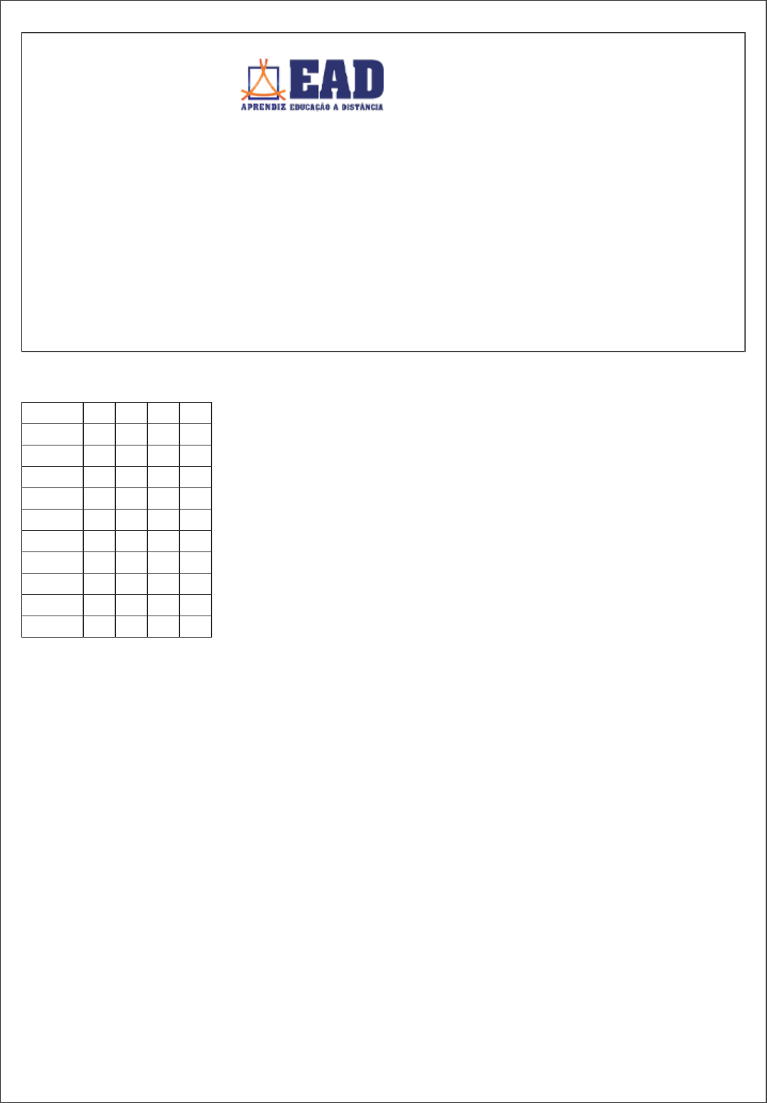 Requisição: 3648569 Matricula: Data: 02/08/2021 09:39 Página: 1/6 Prova regular presencial Curso: CURSO TÉCNICO EM SEGURANÇA NO TRABALHO - APRENDIZ 2 - NÍVEL MÉDIO - 12 MESES Módulo: 2 Grupo: 203 Município: BARBACENA - MG Disciplina(s): 1263 - DIREITO APLICADO À SEGURANÇA NO TRABALHO Nome: - SILVIA APARECIDA SEVERINO Data: ___/___/_________ Assinatura do aluno: ________________________________________________________ Preencha o gabarito abaixo com X na coluna correta. Atente para a coluna de numeração e das alternativas. Questões A B C D 1 2 3 4 5 6 7 8 9 10 1 ) É dever do técnico de segurança do trabalho A ) participar como membro atuante da comissão interna de prevenção de acidentes. B ) elaborar laudos sobre condições ambientais de saúde e segurança do trabalho C ) fazer horas extras. D ) informar os trabalhadores sobre os riscos, bem como orientá-los sobre os procedimentos seguros. Requisição: 3648569 Matricula: Data: 02/08/2021 09:39 Página: 2/6 2 ) Quais são os elementos formadores da lei? A ) Processo Legislativo, Jurídico e Administrativo. B ) Contínuo, constante, moral e obrigatório. C ) Disposição, sanção, promulgação e publicação. D ) Emendas, medidas provisórias, decretos e resoluções. 3 ) A lei cósmica, do Universo, e eterna aplica-se a todos os setores da natureza. Assinale a opção que mais complementa essa afirmação: A ) O enunciado diz respeito apenas às leis da economia, da moral ou do direito. B ) São leis que se referem ao mundo físico e material, sujeito a um determinismo rigoroso. C ) Esta definição refere-se a todas as espécies de lei, pois todas são com modalidade diversas. D ) O enunciado diz respeito apenas às leis da Física, Astronomia, Biologia, História. 4 ) As leis teóricas compreendem Requisição: 3648569 Matricula: Data: 02/08/2021 09:39 Página: 3/6 A ) leis morais. B ) leis naturais, matemáticas e metafísicas. C ) leis técnicas ou artísticas. D ) leis normativas. 5 ) Sobre a abrangência do ramo do Direito Penal, pode-se afirmar que A ) tratam da distribuição da Justiça. B ) tratam das questões trabalhistas. C ) cuida das organizações das finanças do Estado. D ) define as condutas criminosas. 6 ) Leis que se referem ao mundo físico e material. Essa afirmação diz respeito a A ) leis da Física. Requisição: 3648569 Matricula: Data: 02/08/2021 09:39 Página: 4/6 B ) leis humanas. C ) leis do Universo. D ) leis da natureza. 7 ) "A palavra "lei" está ligada ao conceito da norma imperativa do comportamento humano." Assinale a alternativa mais completa com relação ao enunciado: A ) Refere-se às leis jurídicas. B ) O enunciado indica que o comportamento humano refere-se às leis da ética. C ) Refere-se às leis da ética, moral e humana e especialmente à lei jurídica. D ) Refere-se às Leis das 12 Tábuas, Lei Áurea, Lei da Reforma Agrária. 8 ) As leis práticas compreendem A ) leis metafísicas. B ) leis matemáticas e artísticas. Requisição: 3648569 Matricula: Data: 02/08/2021 09:39 Página: 5/6 C ) leis morais e leis técnicas ou artísticas. D ) leis naturais. 9 ) Ramo do Direito que deve ser aplicado aos fatos, atos e pessoas, dentro de suas fronteiras. A ) Direito Nacional. B ) Direito Administrativo. C ) Direito Público. D ) Direito Privado. 10 ) Pode-se conceituar sanção como ato A ) pelo qual o Poder Executivo manifesta a sua concordância com a lei elaborada pelo Poder Legislativo. B ) que declara a lei conhecida e vigente. C ) que consiste nas palavras reveladoras da regra jurídica. Requisição: 3648569 Matricula: Data: 02/08/2021 09:39 Página: 6/6 D ) que declara a existência da lei.