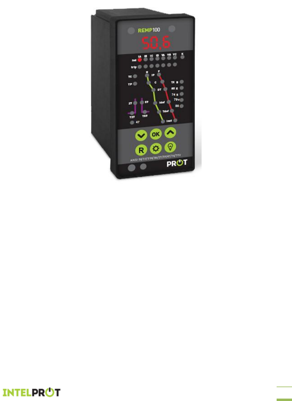 Manual de operação REMP 100 Inteligência em Proteção LTDA – AV. Álvaro Ramos, 1810 – Fone: (11)2667-6575 1 REMP 100 ANSI 50, 51, 50N, 51N, 51GS, 27, 59, 47, 74, 86, 79V,27-0 Setembro – 2019 Ver. 1.10 Verificar o modelo e versão do produto para correta utilização deste manual As informações contidas neste manual podem ser alteradas sem aviso prévio Manual de operação REMP 100 Inteligência em Proteção LTDA – AV. Álvaro Ramos, 1810 – Fone: (11)2667-6575 2 Índice Pg. Descrição do produto 3 Aplicação 3 Funções ANSI 3 Entradas de medição 4 Alimentação auxiliar 4 Saídas a rele 4 Entradas de estado BI 5 Chave de configuração interna 6 Funções de proteção 7 Medições 12 Parâmetros do rele 14 Indicações de tipo de atuação 16 Vista traseira 17 Etiquetas 18 Painel frontal 19 Teclado 20 Comunicação serial e software de parametrização 21 Tabela de parâmetros e faixas de ajustes 24 Fixação ao painel 25 Rasgo do painel 26 Dimensional 27 Especificações 28 Certificações 29 Exemplos de utilização 30 Curvas de atuação de tempo inverso 32 Termo de garantia 44 Manual de operação REMP 100 Inteligência em Proteção LTDA – AV. Álvaro Ramos, 1810 – Fone: (11)2667-6575 3 Descrição do produto Rele digital numérico micro processado. O rele REMP 100 foi projetado para operar nas severas condições de interferência eletromagnéticas presentes no ambiente da cabine primária. Graças à aplicação da tecnologia de microprocessadores, possui grande estabilidade, precisão e repetibilidade de operação. Tropicalizado, pode operar em condições severas de temperatura. Extremamente fácil de instalar e de programação amigável com o usuário. Aplicação Rele de proteção secundário de sobrecorrente nominal 5A . Proteção sobre e subtensão, sequência de fase, supervisão de bobina de abertura, bloqueio e rearme automático para subestações primarias de media tensão. Funções ANSI ANSI 50: Rele de corrente com atuação instantânea trifásico. ANSI 50N: Rele de corrente com atuação instantânea de neutro. ANSI 51: Rele de corrente com atuação temporizada a tempo inverso e tempo definido trifásico. ANSI 51N: Rele de sobrecorrente com atuação temporizada a tempo inverso de neutro. ANSI 51GS: Rele de sobrecorrente com atuação temporizada a tempo definido de fuga a terra. ANSI 27: Rele de subtensão com operação a tempo definido trifásico. ANSI 59: Rele de sobretensão com operação a tempo definido trifásico. ANSI 74: Supervisão da continuidade da bobina de abertura do disjuntor. ANSI 86: Rele de bloqueio. ANSI 79V: Logica de rearme automático na falha de tensão. ANSI 47: Rele de sequencia de fase de tensão. ANSI 27-0: Rele de sub tensão de alimentação auxiliar. Manual de operação REMP 100 Inteligência em Proteção LTDA – AV. Álvaro Ramos, 1810 – Fone: (11)2667-6575 4 Entradas de medição O rele possui entradas de medição de corrente e tensão alternadas. As entradas de medição de corrente alternada são em numero de três, IA, IB e IC com retorno e Icom. Internamente estas correntes são somadas e é gerada a corrente residual de neutro ID. As entradas de corrente alternadas são conectadas internamente em estrela o que libera da necessidade de fechamento no borneira do rele. Estas entradas são de baixa impedância, 18 m Ω, o que contribui para o bom funcionamento dos T.C. As entradas de medição de tensão alternada são em numero de três, VA, VB e VC com ponto comum em Vcom. As entradas de tensão alternadas são conectadas internamente em estrela o que libera a necessidade de fechamento no borneira do rele. Estas entradas são de alta impedância, 68KΩ, garantindo um baixo consumo e baixa dissipação de energia. O Rele mede a tensão fase-fase. Na medição Va do painel é exibido a tensão VA-VB da borneira, Vb a tensão VB-VC da borneira e Vc a tensão VC- VA da borneira. Alimentação Auxiliar A alimentação auxiliar é necessária para fornecer a energia consumida no funcionamento do rele. A conexão da alimentação auxiliar é feita através dos bornes A1 e A2. O consumo de energia do rele é extremamente baixo na ordem de 2VA. A fonte possui internamente armazenamento de energia na forma capacitiva para garantir sua operação durante um determinado intervalo de tempo mesmo em condições de falta momentânea da tensão auxiliar, esta energia armazenada é suficiente para garantir o funcionamento do rele por 1,5s para alimentação em 110VCA. Seu funcionamento é de 70 a 250 VCA ou 70 a 350 VCC. A fonte possui um filtro de entrada para evitar interferências de picos e altas frequências, estre filtro é conectado internamente ao ponto ICOM das correntes. Saídas a Reles O rele possui três saídas a rele com contato seco, Rele1, Rele2 e Rele3. A capacidade de comutação de carga destas saídas é de 9A em 220VCA para RELE1 e RELE2 e de 5A em 220VCA para o RELE3. O RELE1 é sempre o rele de TRIP. A operação do rele RELE1 é do tipo NA, o comando é executado com o fechamento do contato. Manual de operação REMP 100 Inteligência em Proteção LTDA – AV. Álvaro Ramos, 1810 – Fone: (11)2667-6575 5 O RELE2 pode ser TRIP ou CLOSE conforme a configuração da chave CH1-3, que será explicada a seguir neste manual. A operação do rele RELE2 é do tipo NA, o comando é executado com o fechamento do contato. O RELE3 é sinalização de auto check e pode assumir também a sinalização de falha de bobina de abertura conforme configuração de chave CH1-1. A operação do rele RELE3 é do tipo NA armado, a falha é indicada com a abertura do contato. Saídas a rele Saída Função principal Função alternativa Tipo Rele 1 Trip Trip N.A. Rele 2 Trip Close (CH1-4 = on) N.A. Rele 3 Auto check Auto check/falha B.A (CH1-1 = on) N.A. Armado Entradas de estado BI O rele possui Três entradas de estado BI1, BI2 e BI3 com ponto comum em BIcom. A faixa de tensão de entrada é de 60 a 250 