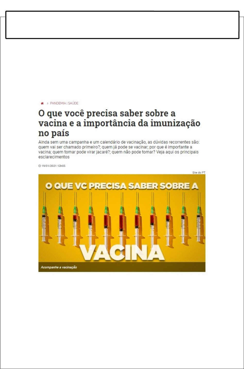 Professora: Componente curricular: Língua Portuguesa Data: ____/_____/2021 NOTA: Aluno(a): __________________________________________________ Turma:________ Objetivo A1: Inferir os sentidos do texto – reportagem por meio dos recursos argumentativos utilizados; Objetivo A2: Identificar as partes da estrutura do gênero artigo de opinião; Objetivo A3: Apontar a diferença entre frase, oração e período, bem como período simples e composto; Objetivo A4: Diferenciar orações coordenadas sindéticas e assindéticas; Objetivo A5: Explicar as características do gênero narrativa de ficção científica; Objetivo A6: Produzir um texto explicativos obre o gênero debate + relato de experiência. Olá, como você está? Esta é uma avaliação, portanto deve ser respondida à caneta (preta ou azul). Leia o texto a seguir: A imunização contra a Covid-19, enfim, começou no Brasil nesta segunda-feira (18) após a Agência de Vigilância Sanitária (Anvisa) autorizar no último domingo (17) o uso emergencial das vacinas CoronaVac, produzida pelo Instituto Butantan com o laboratório chinês Sinovac, e AstraZeneca, desenvolvida pela Universidade de Oxford, no Reino Unido, com a Fiocruz. Os dois imunizantes são os primeiros aprovados no país para o combate da pandemia do novo coronavírus. Diante do negacionismo do governo de Jair Bolsonaro (ex- PSL) em ver a doença como grave e contagiosa, e ainda propagar fake news como o uso da cloroquina como prevenção à Covid-19 [...] Para que serve a vacina? Ainda sem uma campanha e um calendário de vacinação, as dúvidas recorrentes são: quem vai ser chamado primeiro?; quem já pode se vacinar?; por que é importante a vacina?; quem tomar pode virar jacaré?; quem não pode tomar? Primeiro, ninguém vira jacaré por tomar vacina e se proteger do coronavírus. Essa foi mais uma informação falsa entre as dezenas de fake news divulgadas por Bolsonaro. Segundo, a vacina contra a Covid-19 é fundamental para frear a pandemia que já matou mais de 209 mil brasileiros e infectou mais 8 milhões de pessoas. Ela serve também para a reabertura das cidades e das atividades econômicas de forma segura. O objetivo, no entanto, é: garantir que o sistema imunológico de boa parte da população esteja preparado para defender o organismo quando encontrar o vírus e, assim, evitar o desenvolvimento da doença. Disponível em: https://pt.org.br/o-que-voce-precisa-saber-sobre-a-vacina-e-a-importancia-da-imunizacao-no-pais/. Acesso em 04 fev. 2021. 1. A qual gênero textual pertence o texto lido? ( ) reportagem ( ) crônica ( ) notícia ( ) artigo de opinião. 2. A imagem que acompanha o título do texto é coerente com o tema que se deseja mostrar? Que outra imagem você colocaria para acompanhar o título do texto a fim de chamar a atenção do seu leitor? __________________________________________________________________________________________________________________________________________________________________________________ 3. Qual é o tema central do texto? __________________________________________________________________________________________________________________________________________________________________________________ 4. O que mais lhe chamou atenção no texto? Por quê? __________________________________________________________________________________________________________________________________________________________________________________ 5. A partir do texto lido, podemos inferir que este veículo de comunicação é a favor ou contra o governo do atual presidente do país? Por quê? __________________________________________________________________________________________________________________________________________________________________________________ 6. Na sua opinião, haveria outras formas de abordar a temática trazida na notícia, sem citar o nome ou as falas do presidente? E a notícia teria o mesmo impacto no público leitor? Por quê? __________________________________________________________________________________________________________________________________________________________________________________ 7. Segundo o texto, por que a vacina é importante? __________________________________________________________________________________________________________________________________________________________________________________ 8. Agora faça um comentário crítico a partir do que você pensa sobre toda a polêmica em torno da vacina contra a COVID-19. Você considera a vacina importante? Todos deveriam ser vacinados? Você acredita que a vacina é segura? Para cada tese (ponto de vista) coloque pelo menos um argumento válido que a justifique. __________________________________________________________________________________________________________________________________________________________________________________ __________________________________________________________________________________________________________________________________________________________________________________ __________________________________________________________________________________________________________________________________________________________________________________ __________________________________________________________________________________________________________________________________________________________________________________ Leia o texto a seguir: Os fura-filas da vacina: Um episódio lamentável (Por Luciene Almeida, em 27 de janeiro de 2021). Há quase um ano, o Brasil entraria em um de seus maiores desafios: enfrentar até então, o desconhecido Coronavírus. Em março de 2020, o país inteiro praticamente parou por conta dos agravos da pandemia e de um possível colapso na rede de saúde, uma doença até então, sem tratamento específico, sem vacina, havendo apenas a possibilidade de evitar a disseminação do contágio por medidas sanitárias. Muitas pessoas não tiv